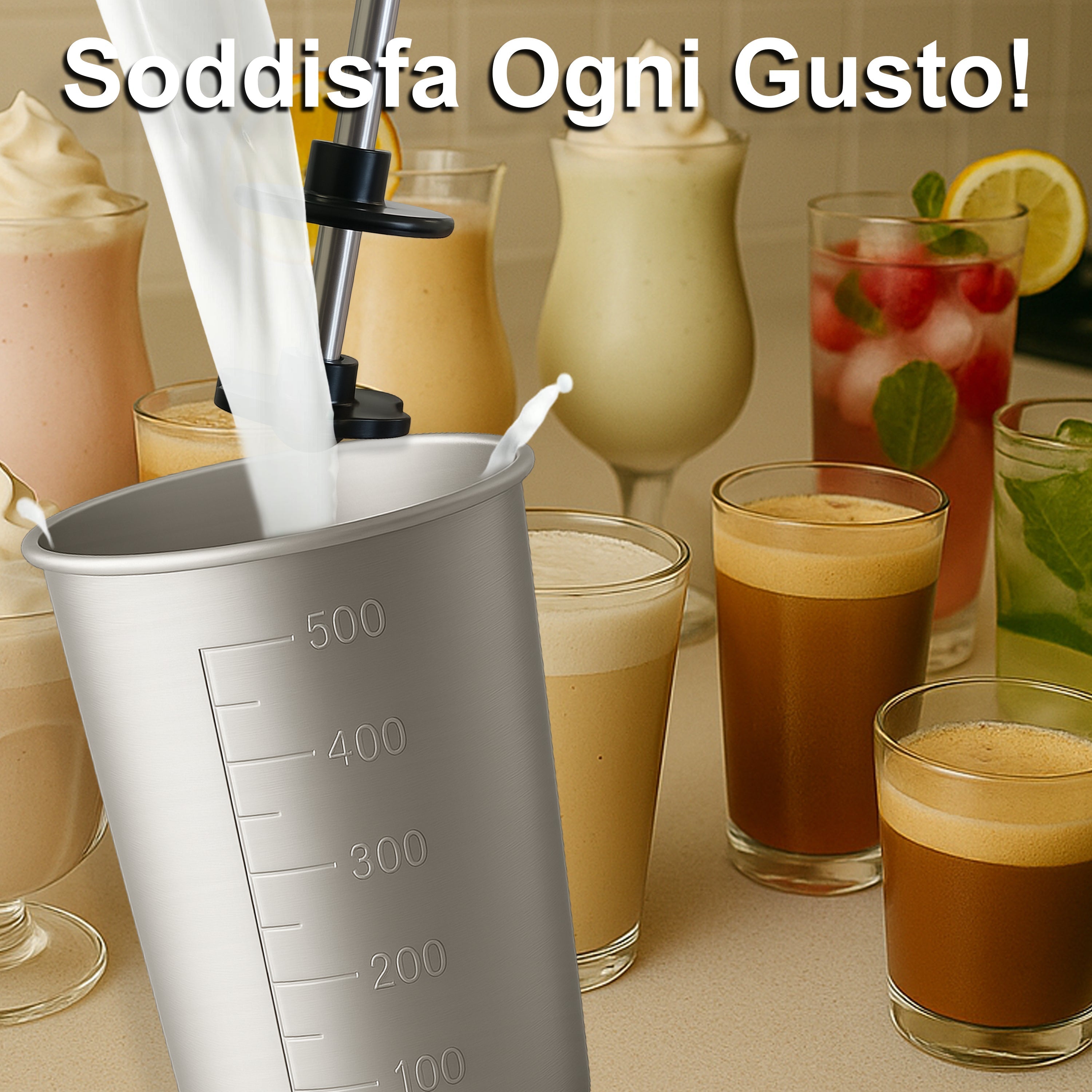 Scopri il compagno perfetto per le tue preparazioni estive e non solo! Questo mixer frullatore da 100W è pensato per chi ama frappè cremosi, caffè shakerati perfetti e cocktail dal gusto impeccabile, tutto con la semplicità di un solo gesto.