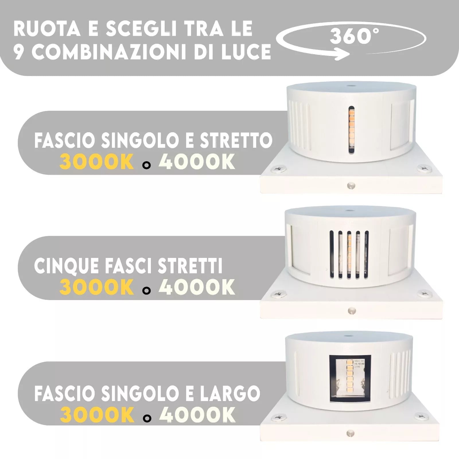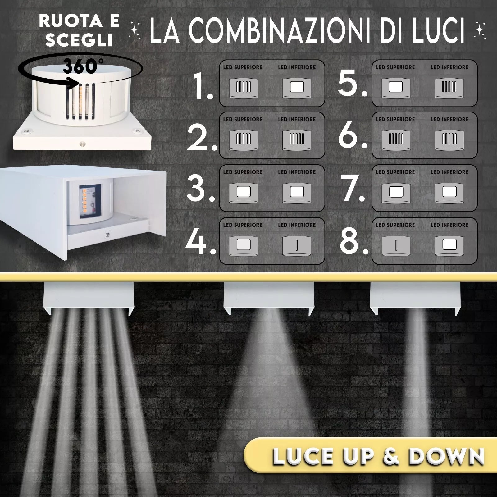 - DOPPIA LUCE: Fornisce illuminazione sia verso l'alto che verso il basso, creando un effetto luminoso bilanciato e accattivante.