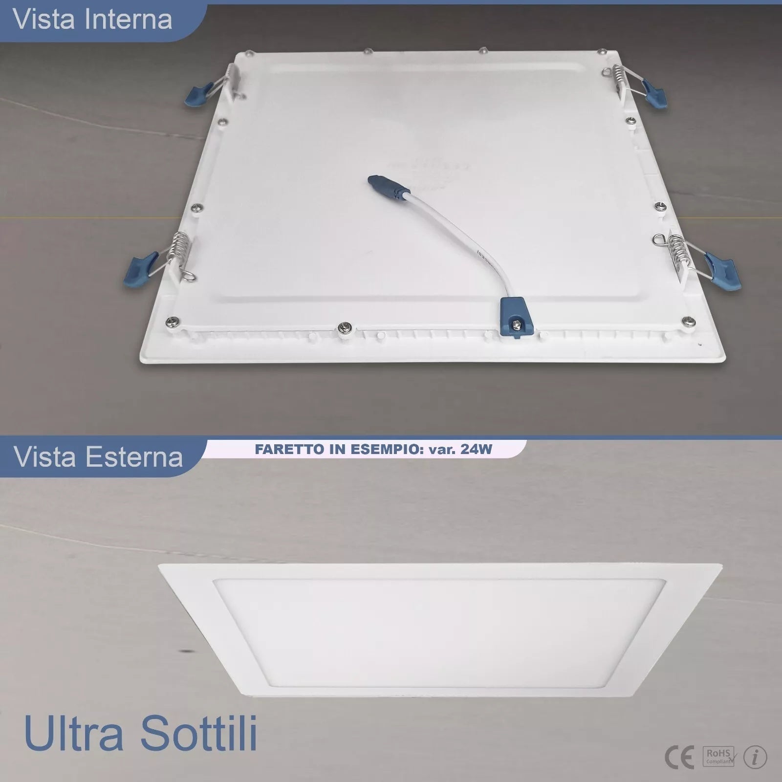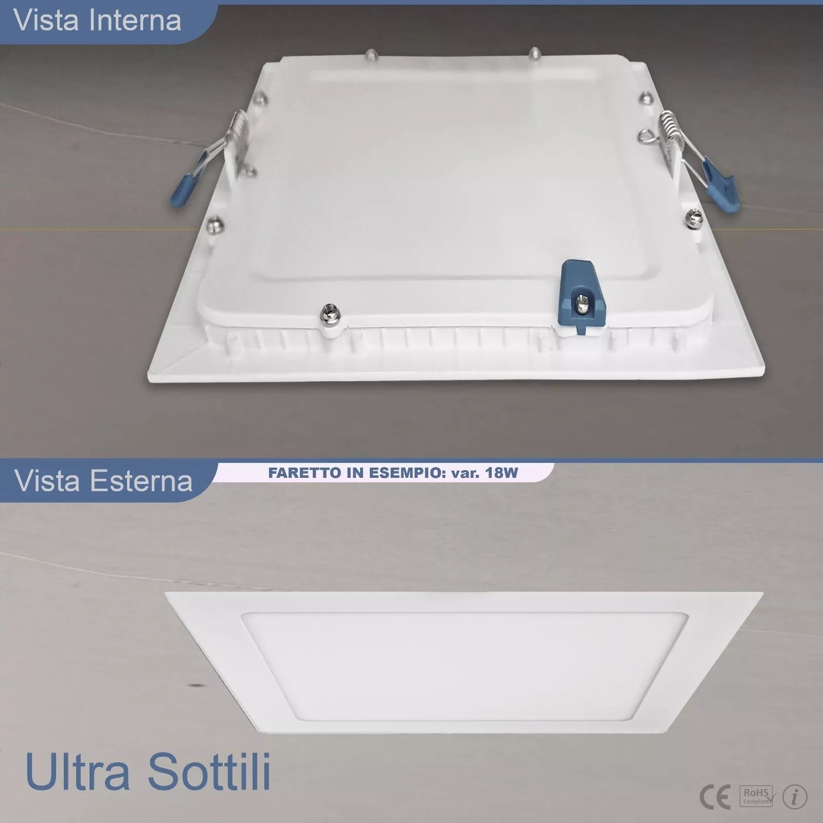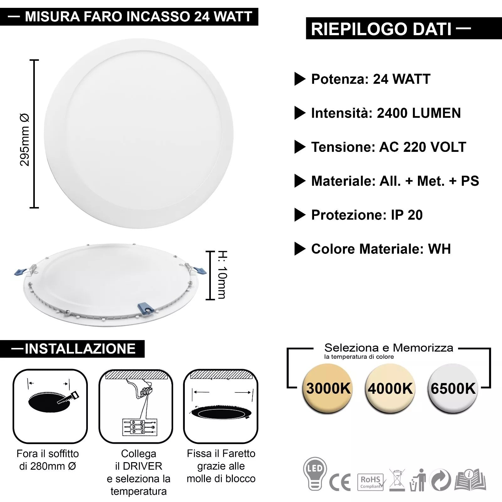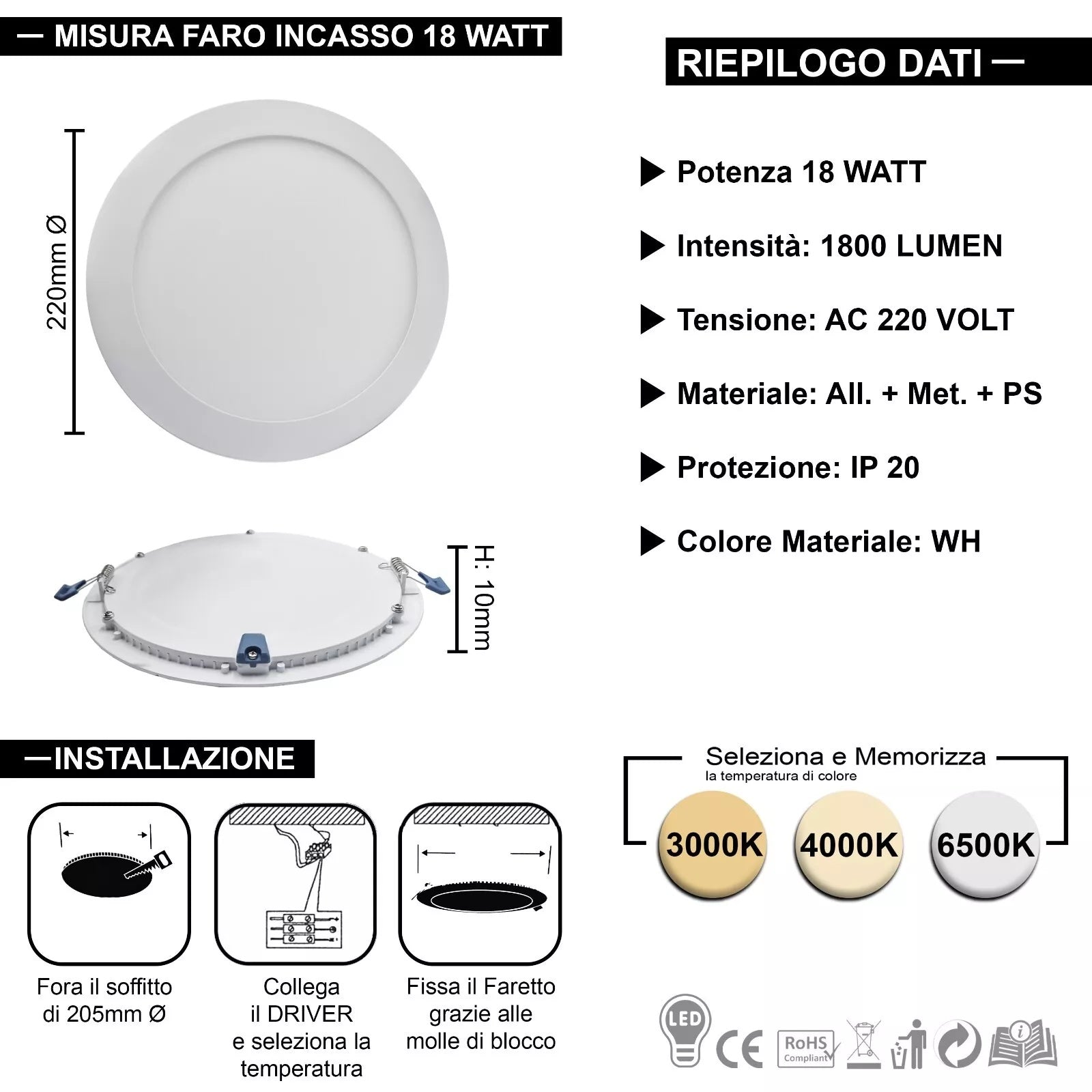 - Scocca in alluminio+PC certificata CE & RoHS, protezione IP20 e driver protetto per un funzionamento sicuro in ambienti interni professionali.