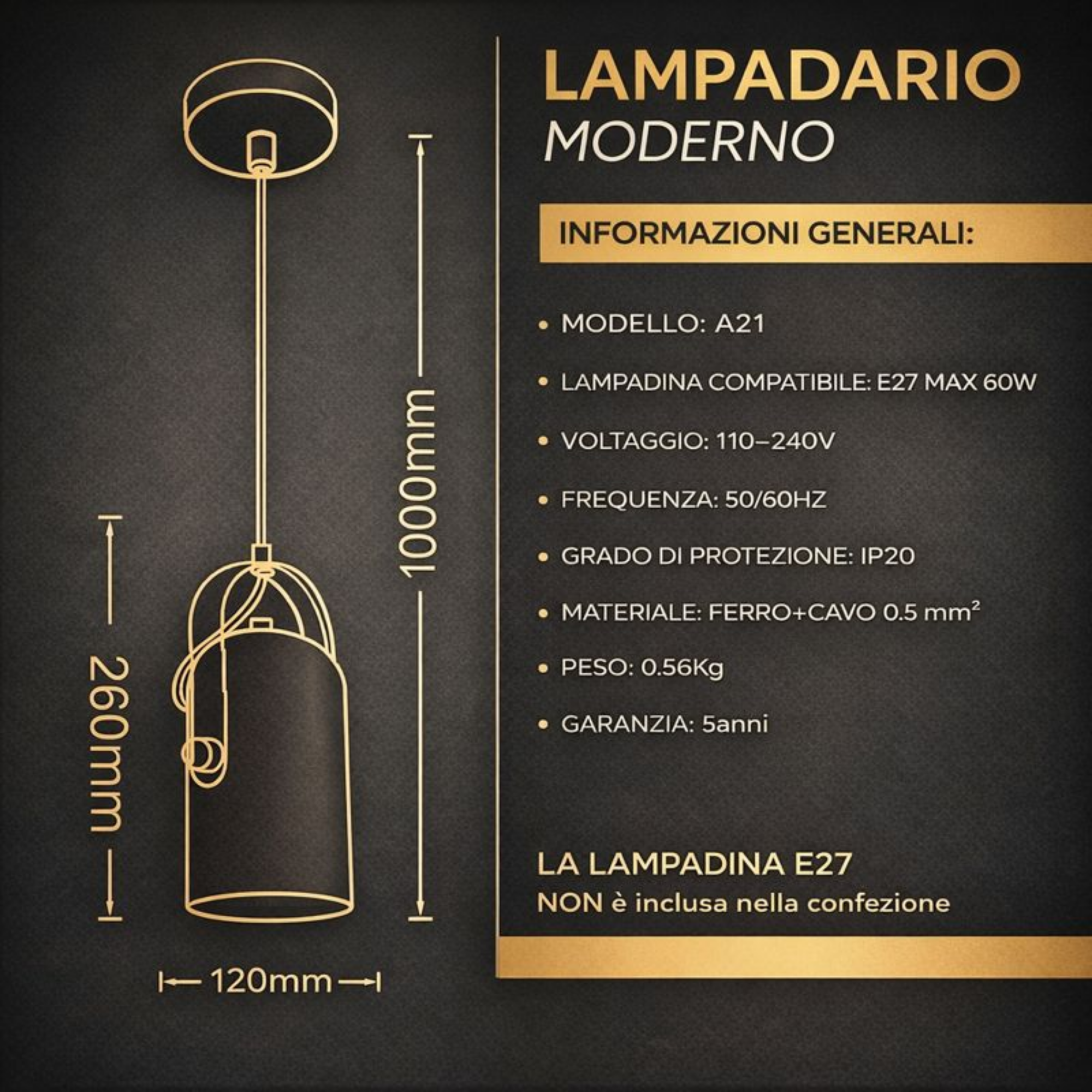 -Massima libertà di personalizzazione: compatibile con qualsiasi lampadina E27 fino a 60W, ideale per LED decorative o a filamento secondo lo stile desiderato.