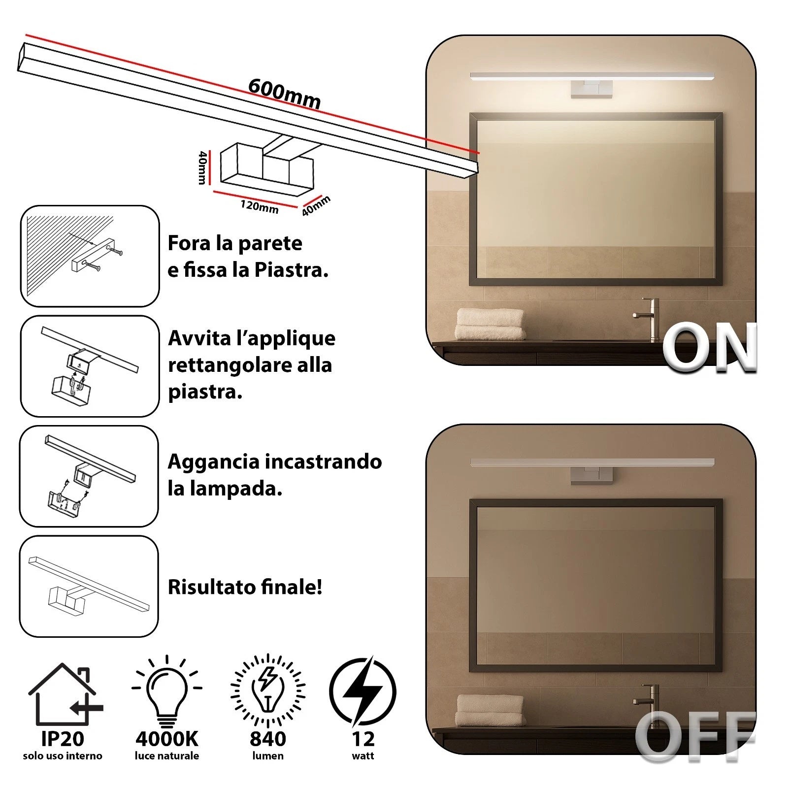 Illumina lo specchio con una luce naturale da 4000K, perfetta per trucco, rasatura e cura personale.