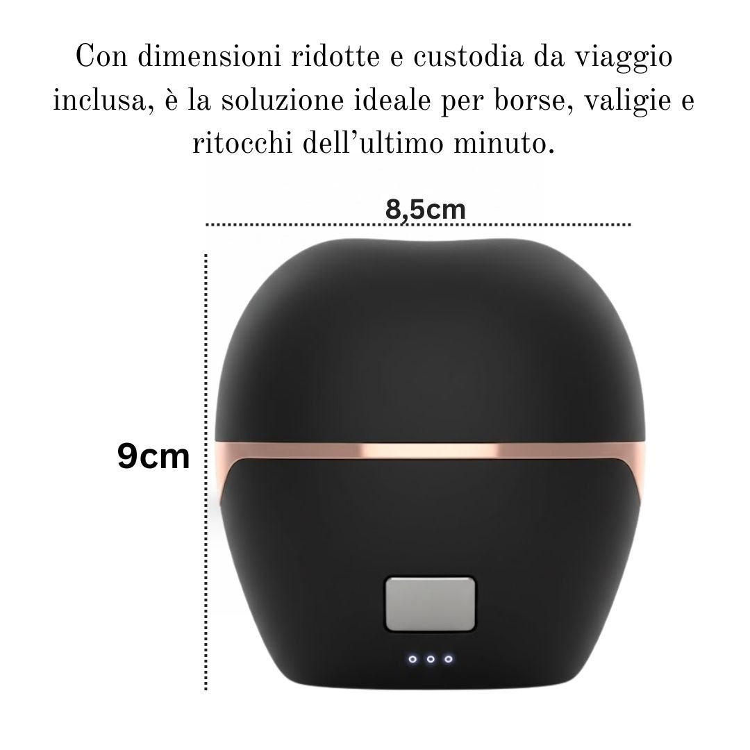 Risultati rapidi ovunque: la spazzola compatta liscia e disciplina i capelli in pochi minuti, offrendo una finitura morbida e luminosa anche fuori casa.