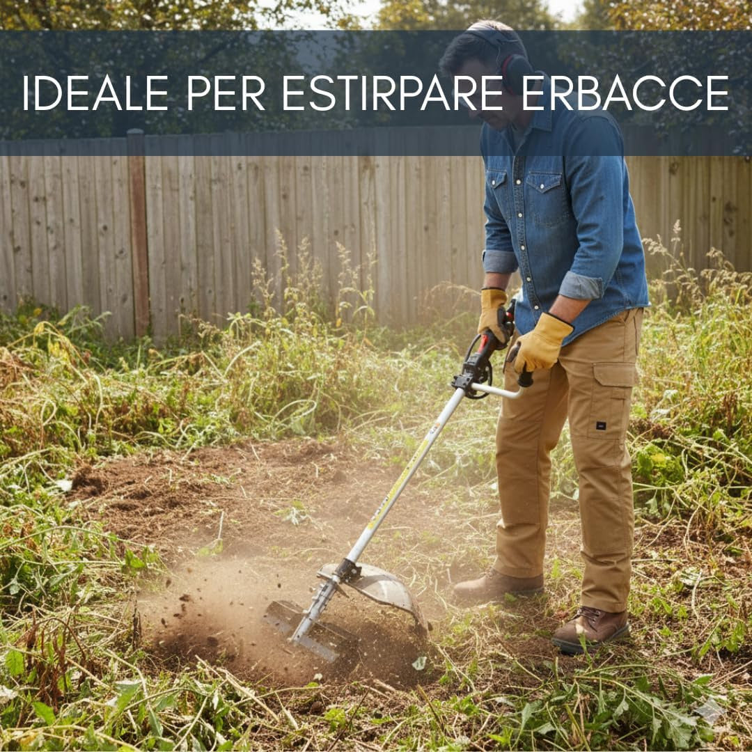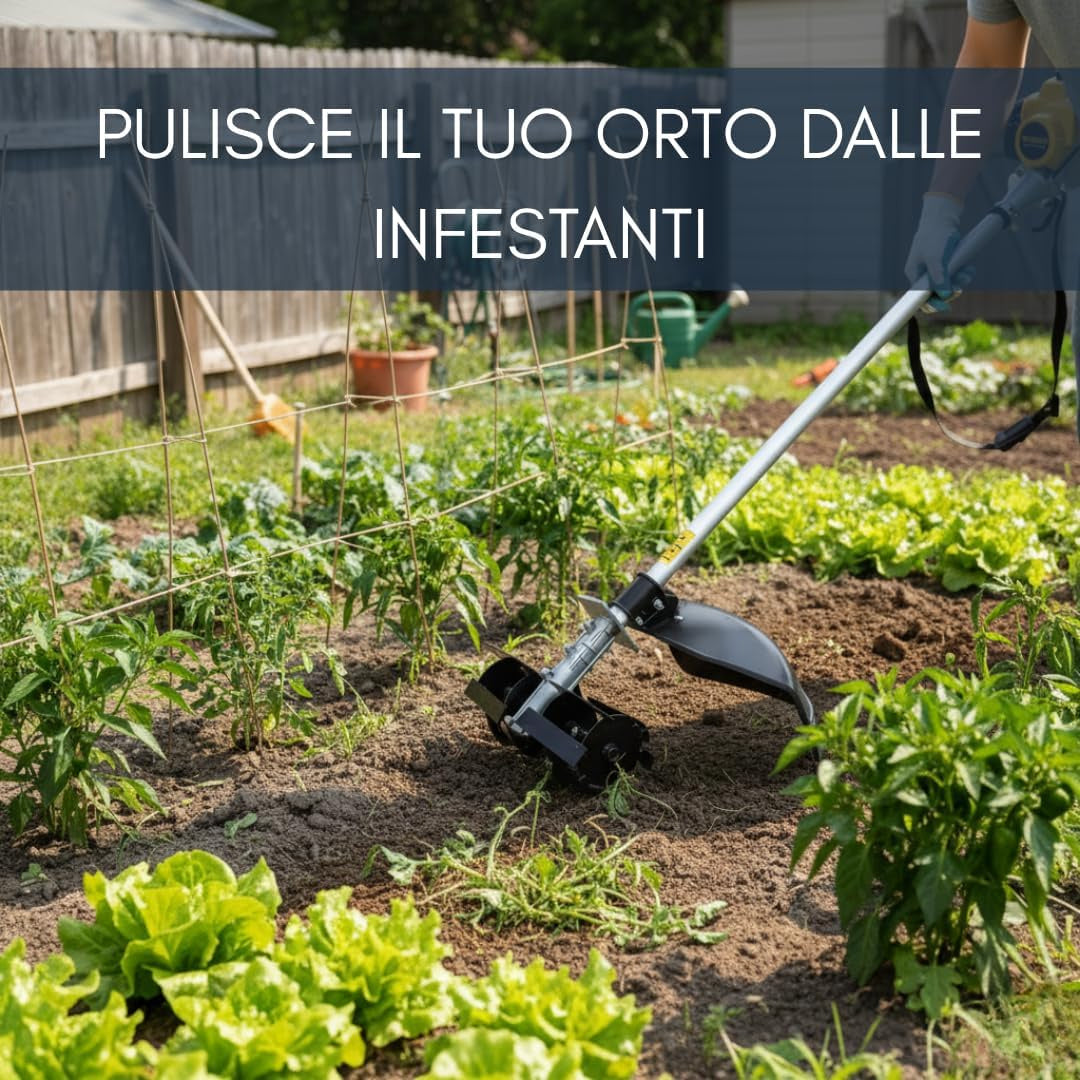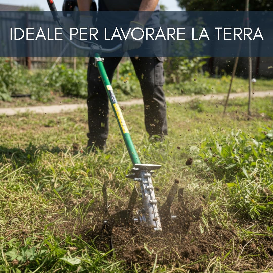 -Trasformazione immediata in motozappa: consente di convertire il decespugliatore in una fresatrice efficiente, ideale per lavorare il terreno in profondità e preparare orti, giardini e aiuole con risultati uniformi e professionali.