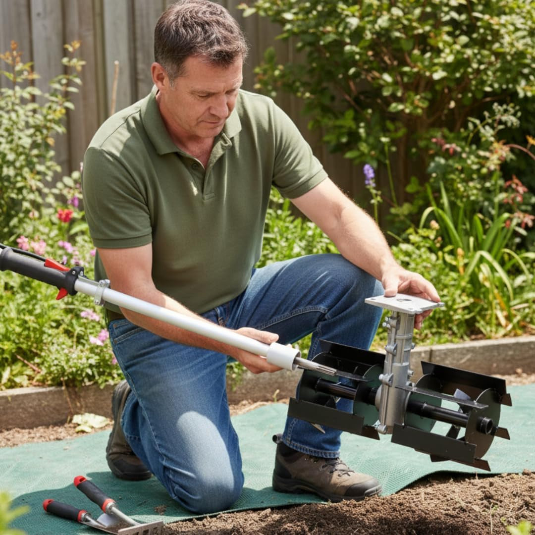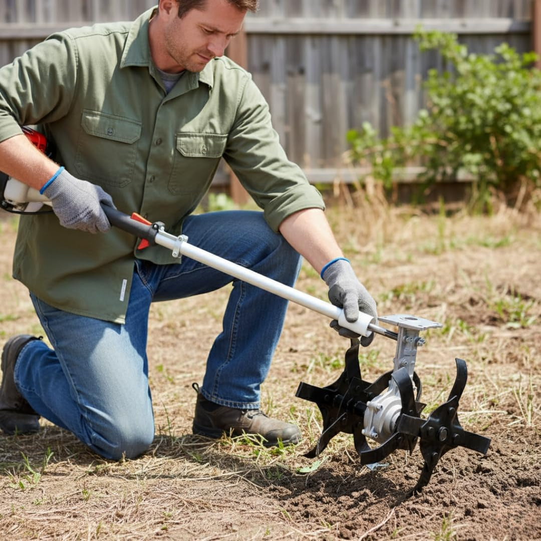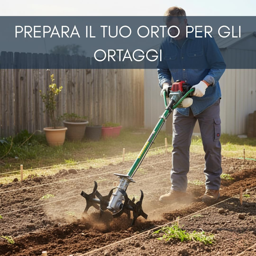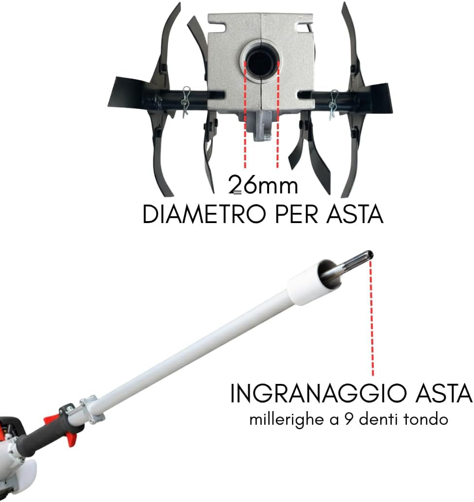 -Trasformazione immediata in motozappa: consente di convertire il decespugliatore in una fresatrice efficiente, ideale per lavorare il terreno in profondità e preparare orti, giardini e aiuole con risultati uniformi e professionali.