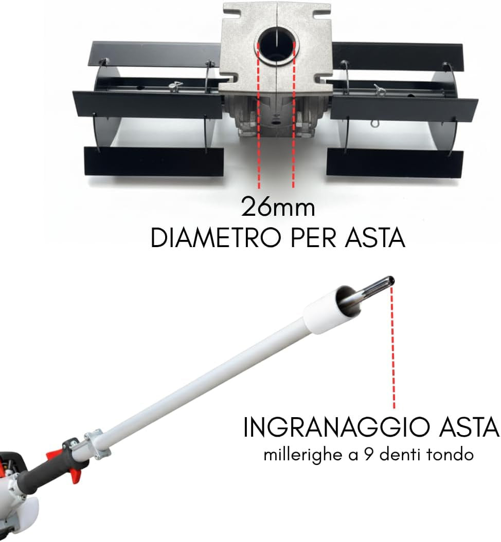 -Compatibilità ampia e montaggio rapido: l’attacco universale Ø26 mm con ingranaggio a 9 denti garantisce installazione stabile e veloce sulla maggior parte dei decespugliatori a scoppio, senza vibrazioni o perdite di potenza.