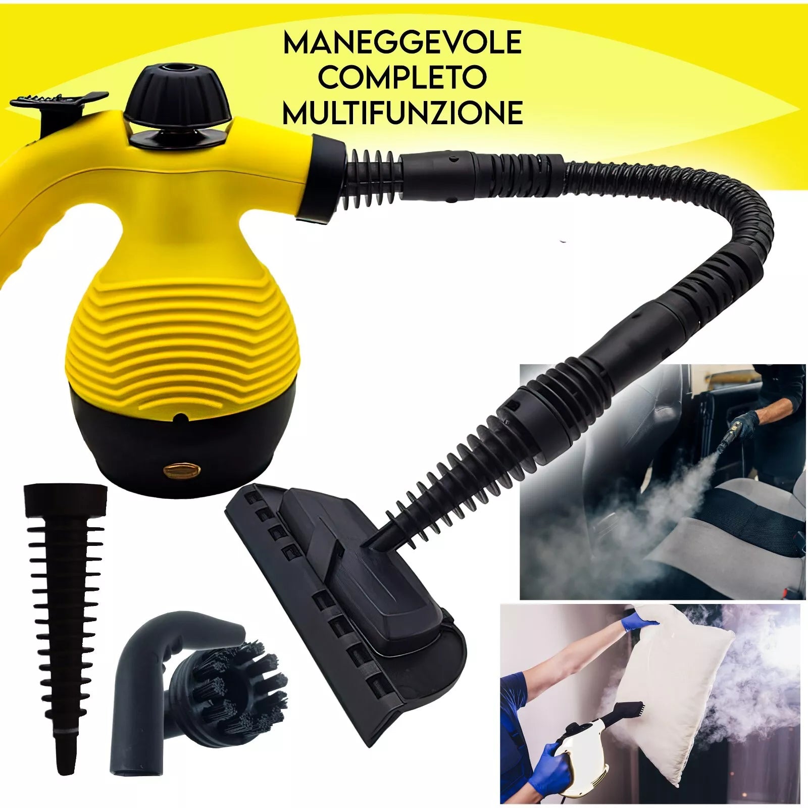 - MULTIFUNZIONE: Utilizzabile su varie superfici come pavimenti, vetri, tappeti, e tessuti, offrendo un'azione pulente e disinfettante con un unico strumento.