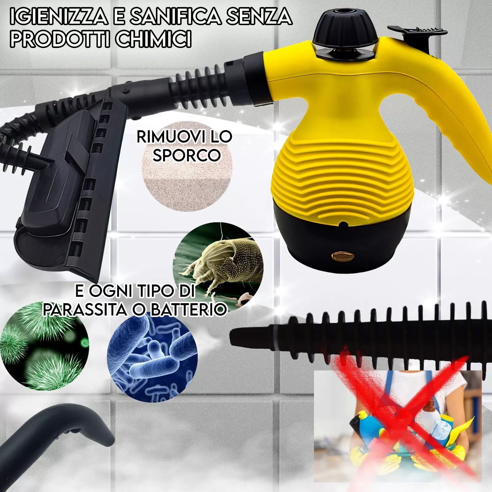 - POTENZA ELEVATA: 1000W di potenza per una pulizia profonda ed efficace su tutte le superfici, rimuovendo sporco, germi e batteri senza l'uso di sostanze chimiche.