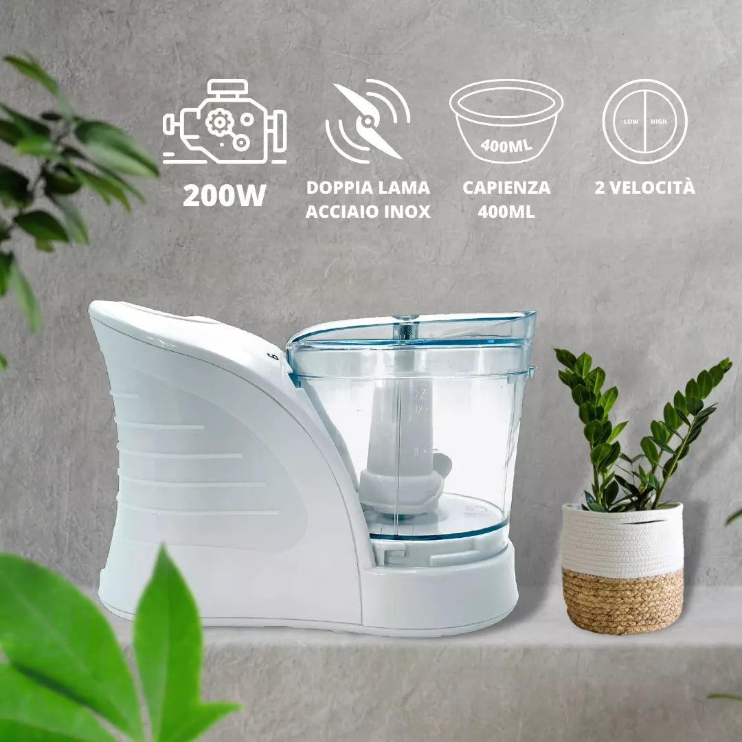 - POTENZA OTTIMALE: Grazie al motore da 200W, questo frullatore tritatutto garantisce una miscelazione rapida ed efficiente di frutta, verdura e altro. Perfetto per preparare smoothies, salse o tritare ingredienti duri senza sforzo.