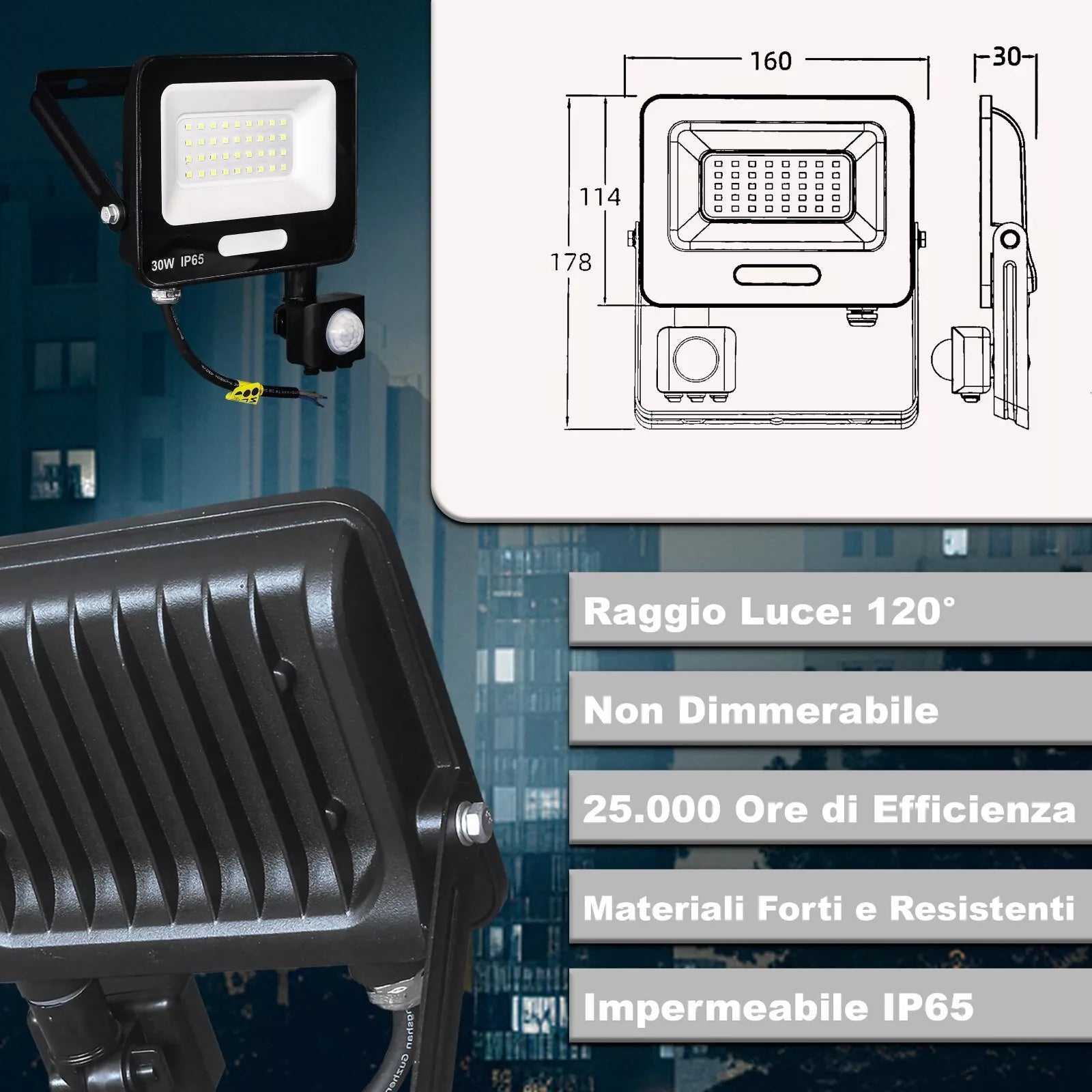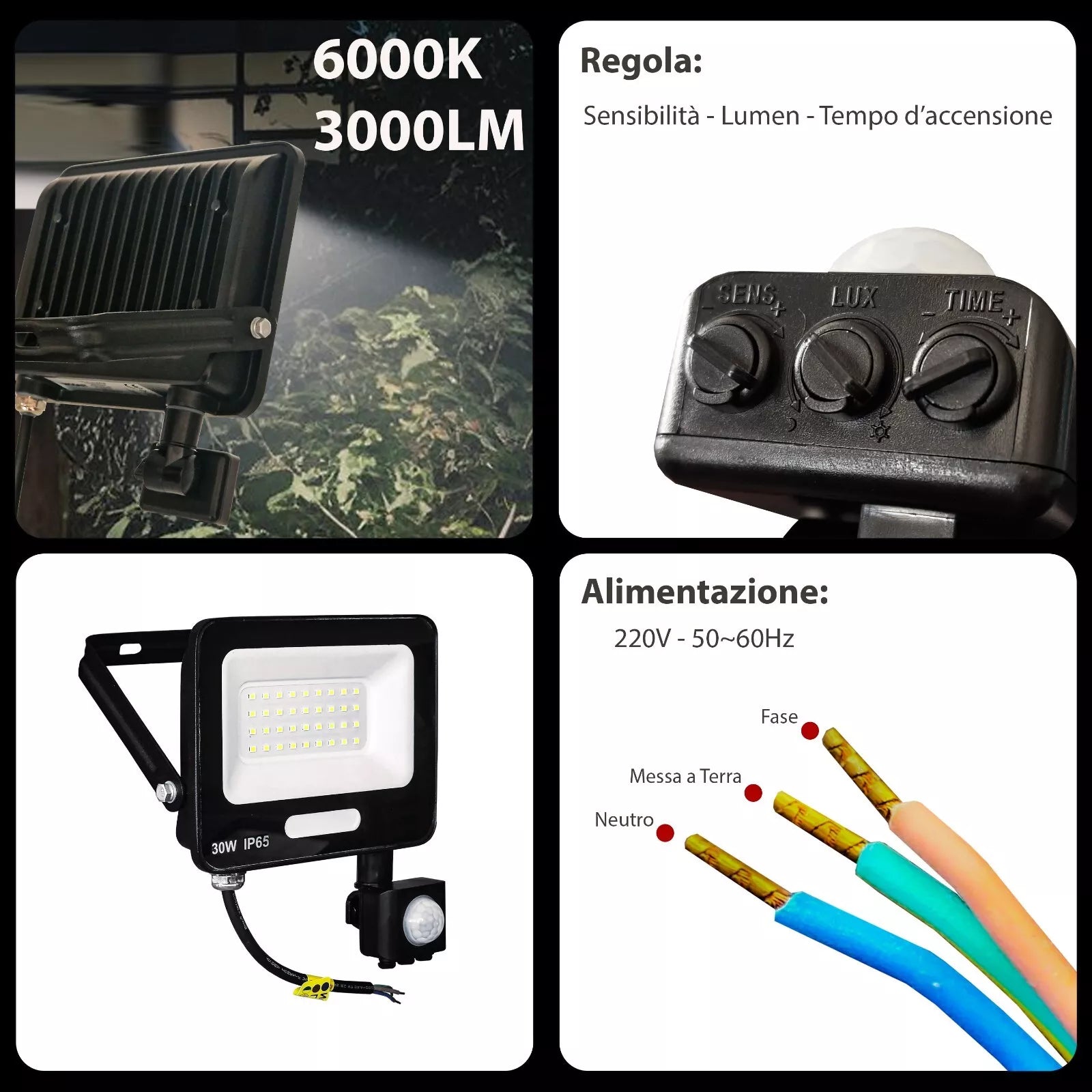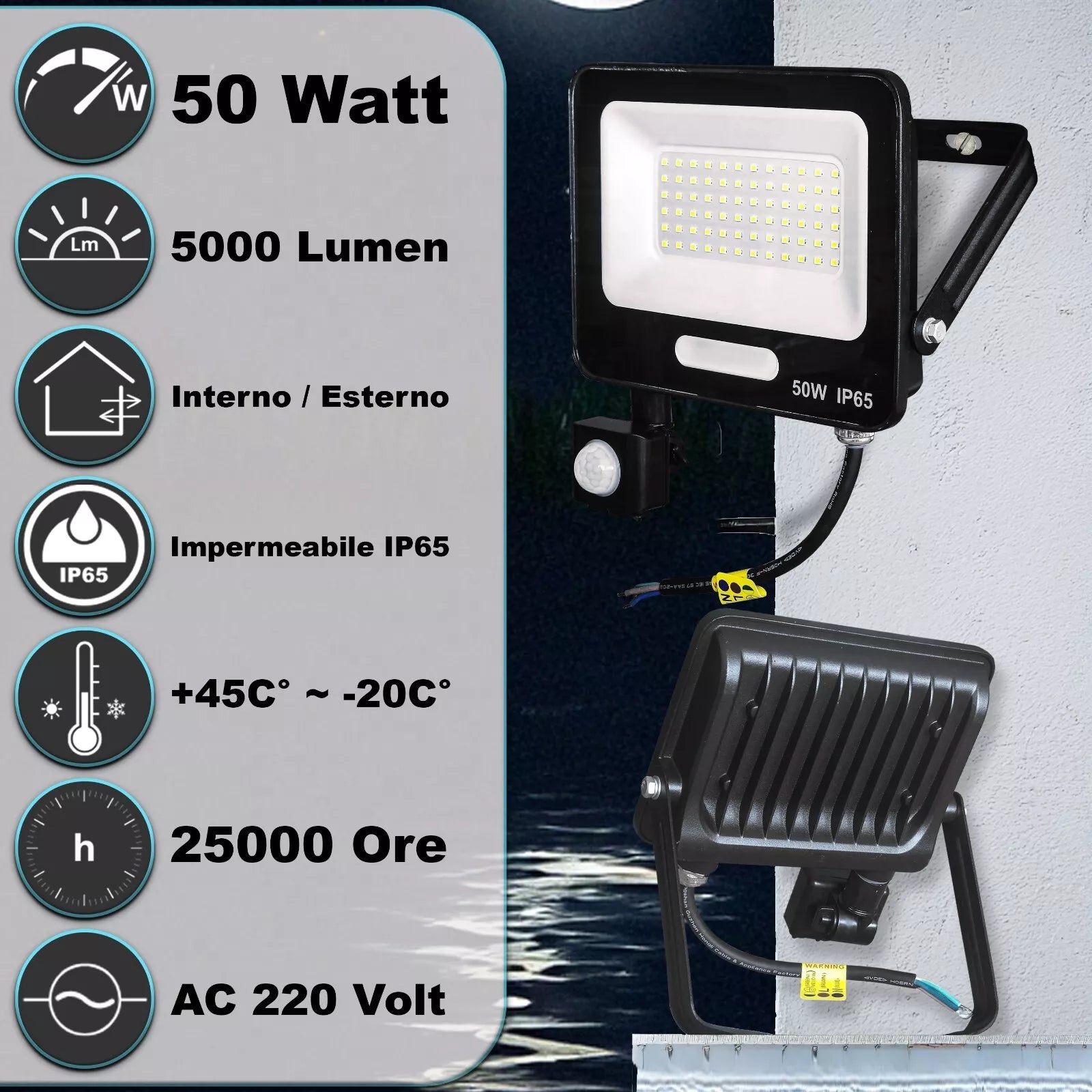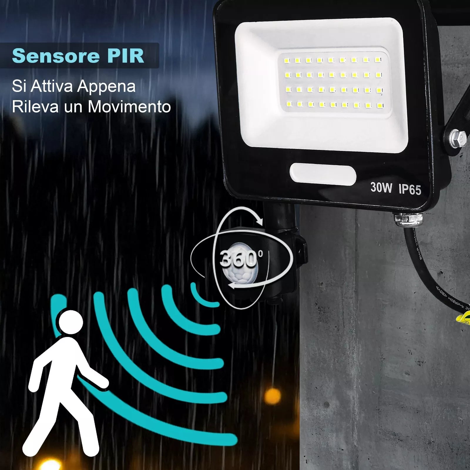 Faro LED 6000K con Sensore PIR, IP65, 30W 50W Regolabile per Esterno
