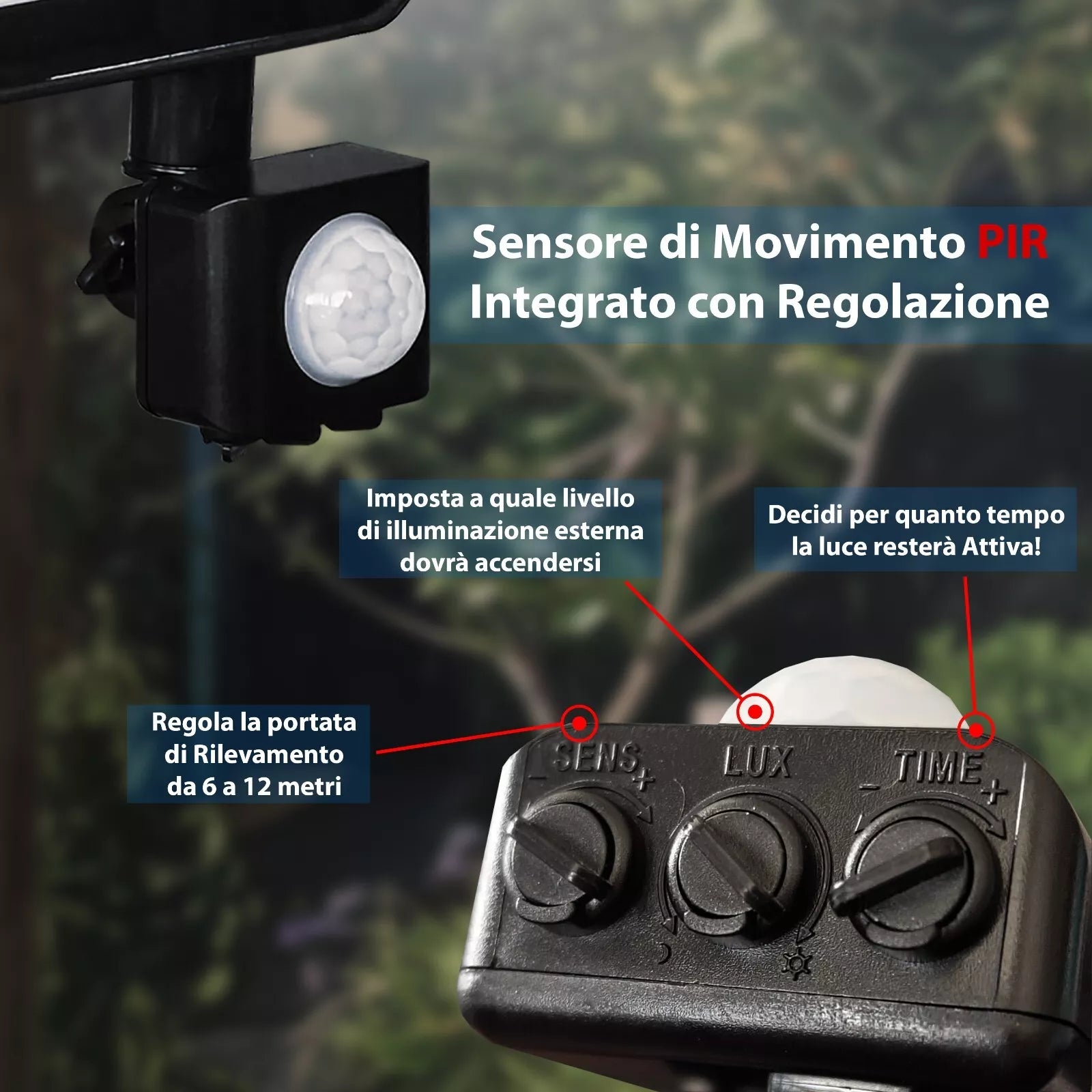 SENSORE PIR INTELLIGENTE: Attiva la luce solo quando rileva movimento, garantendo sicurezza ed efficienza energetica. Sensibilità e durata regolabili per il massimo controllo.