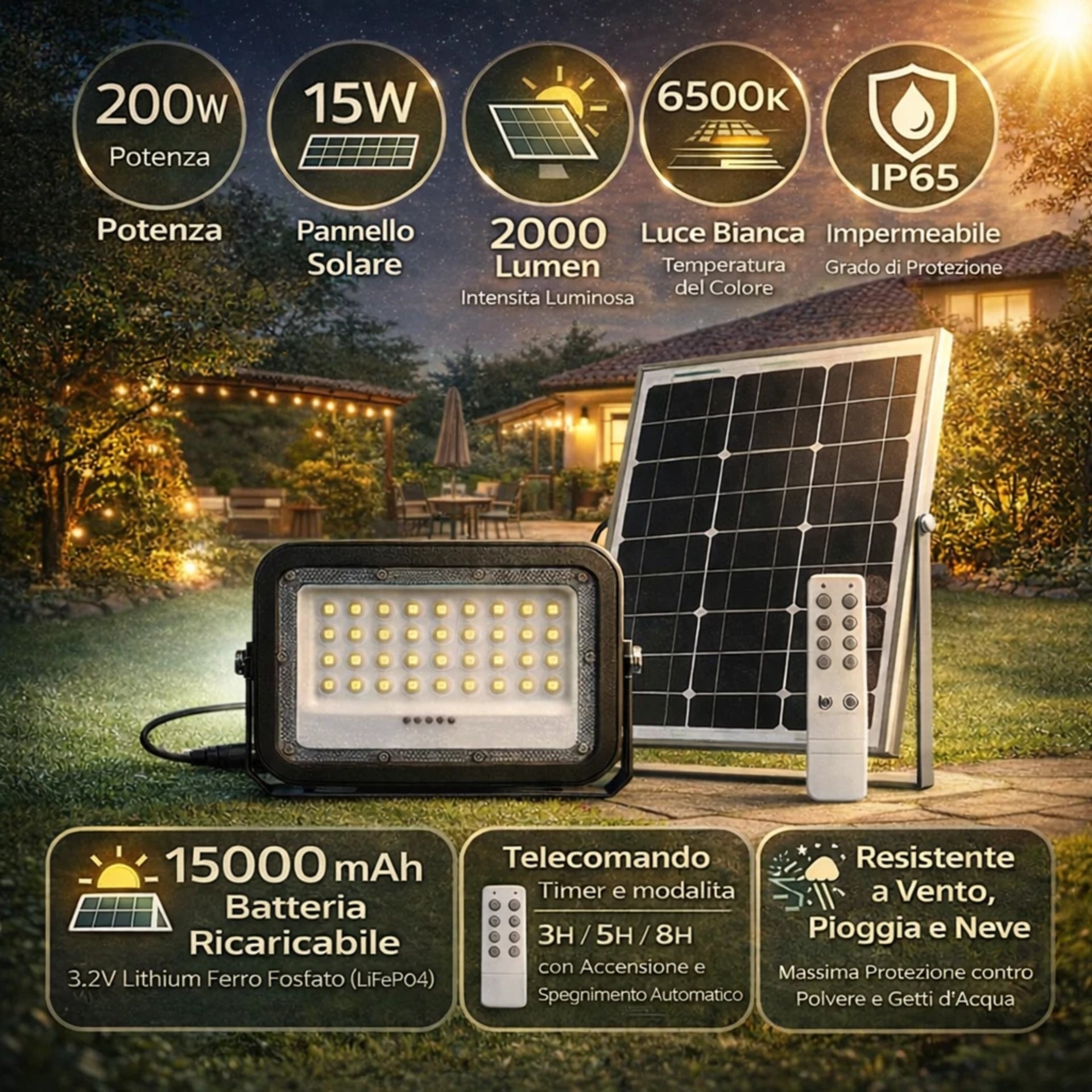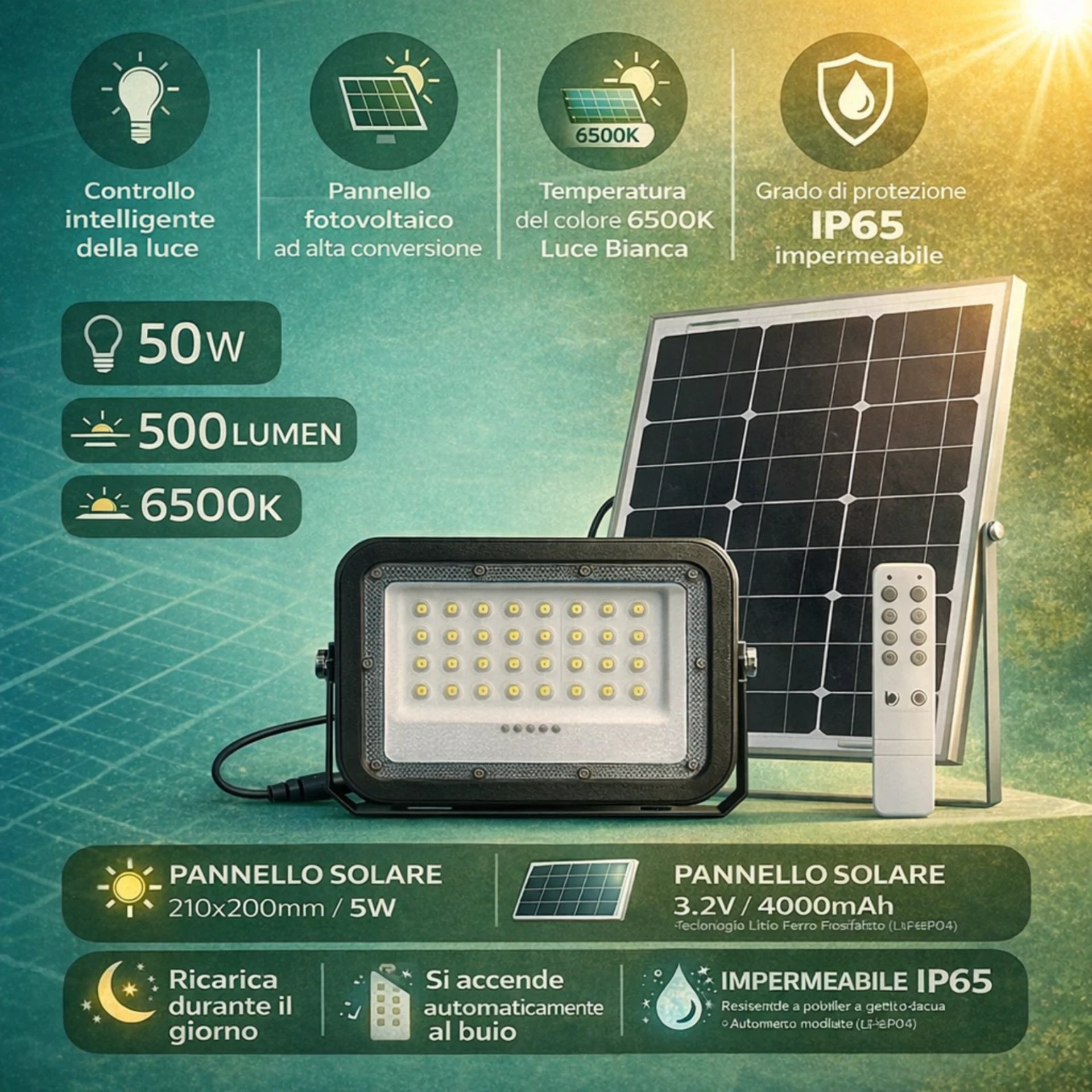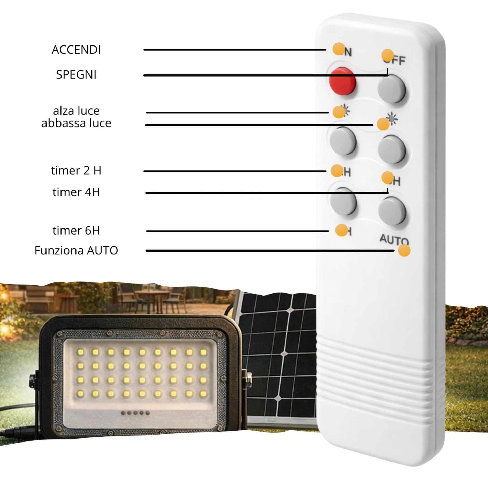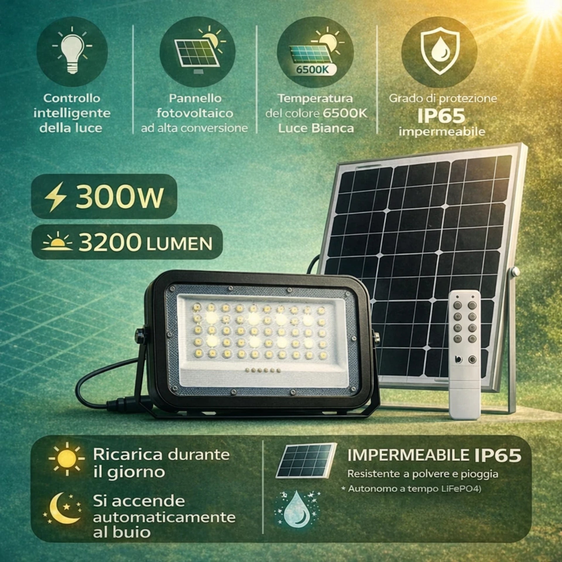 Faro LED Solare Esterno IP65 con Pannello 50W 200W 300W