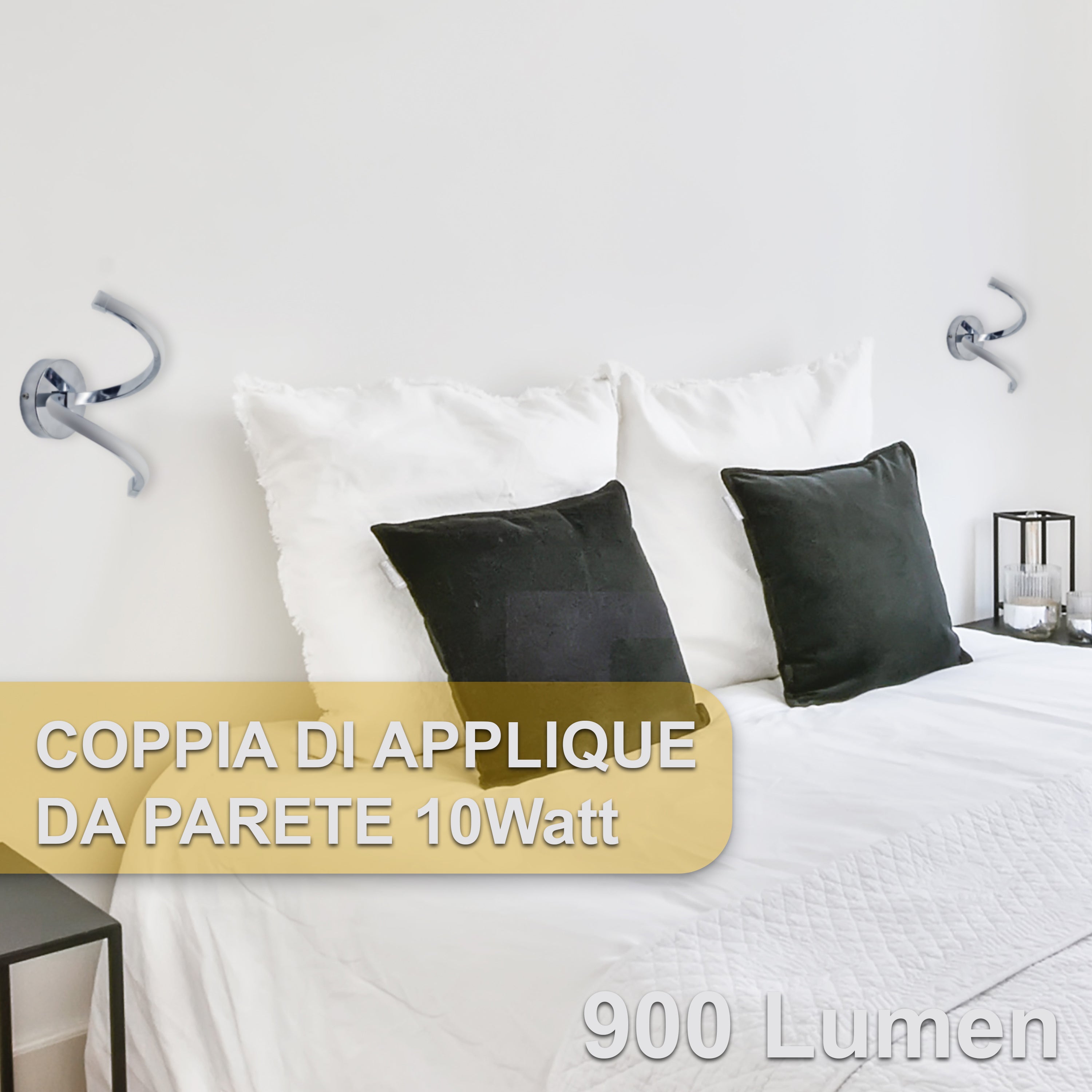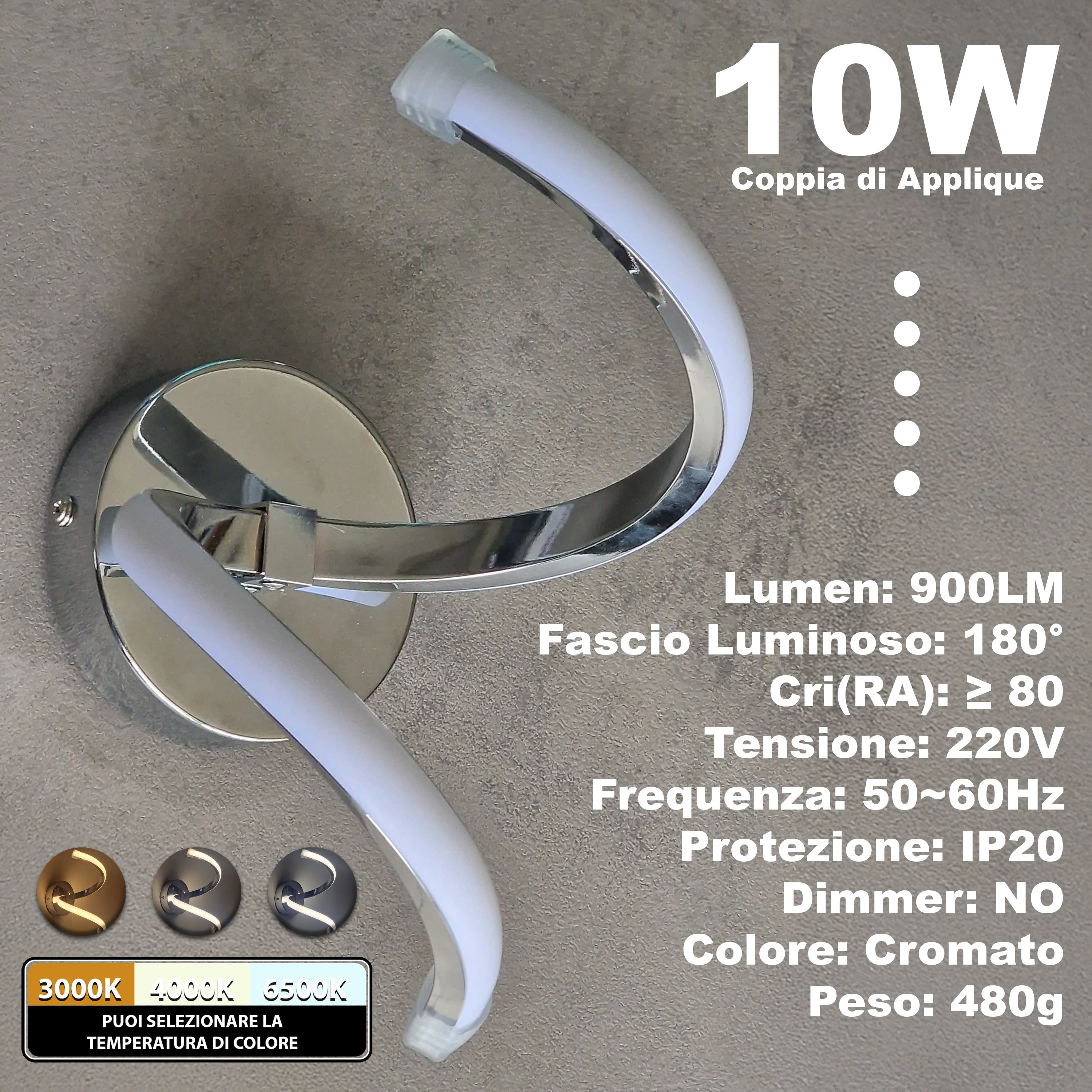 x2 Pezzi Applique LED da Parete Interno a Spirale, 10W, Cambio Temperatura 3000K-4000K-6500K, 900 Lumen, Cromati