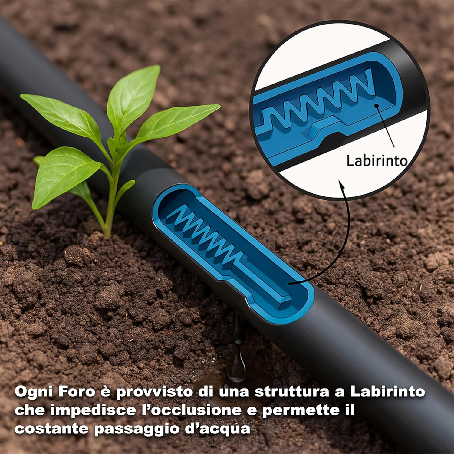 I gocciolatoi integrati assicurano un'irrigazione omogenea: mantenendo umido il terreno in modo regolare e mirato.