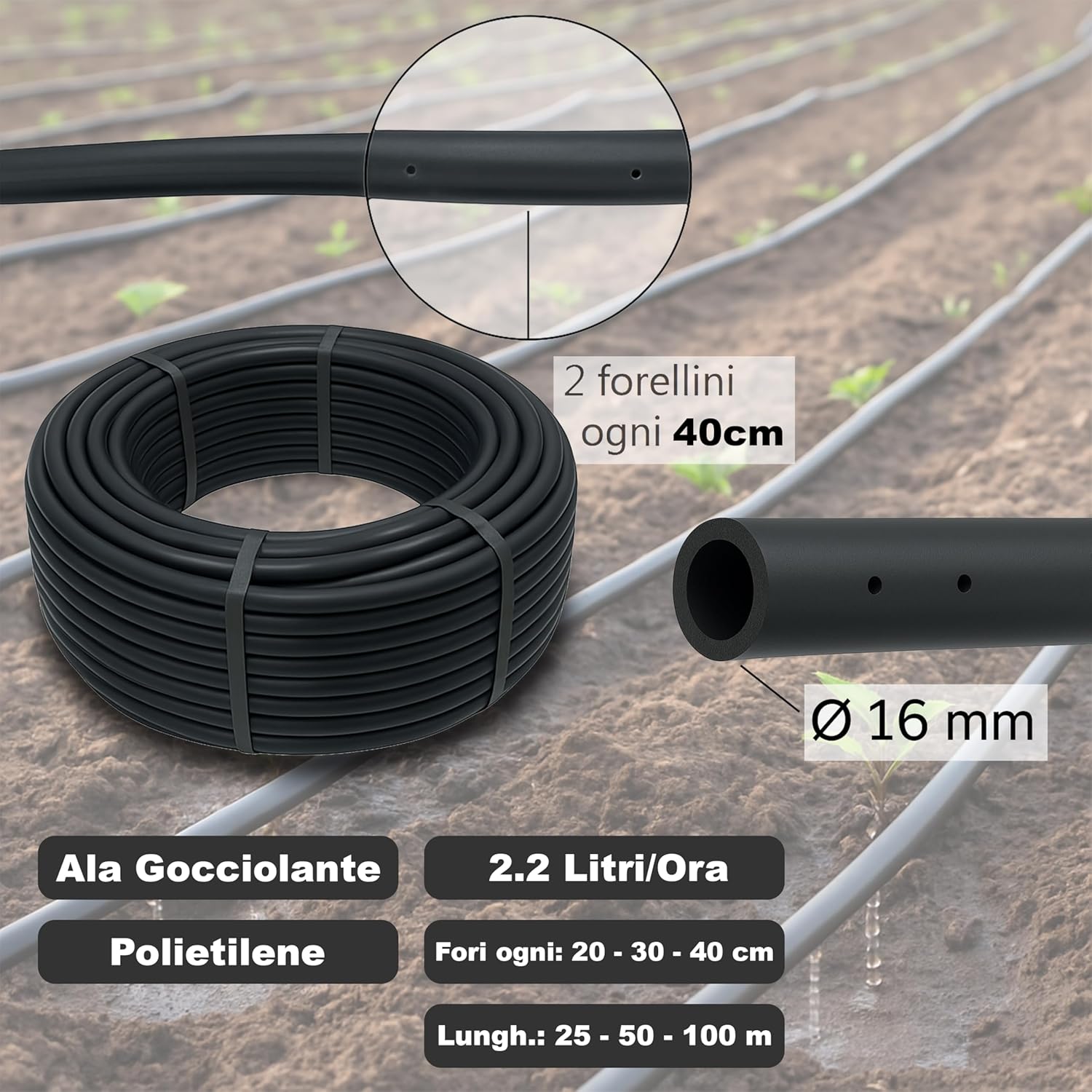 Tubo Ala Gocciolante 16mm 25m 2.2L/h Passo 30cm Anti-UV Orto