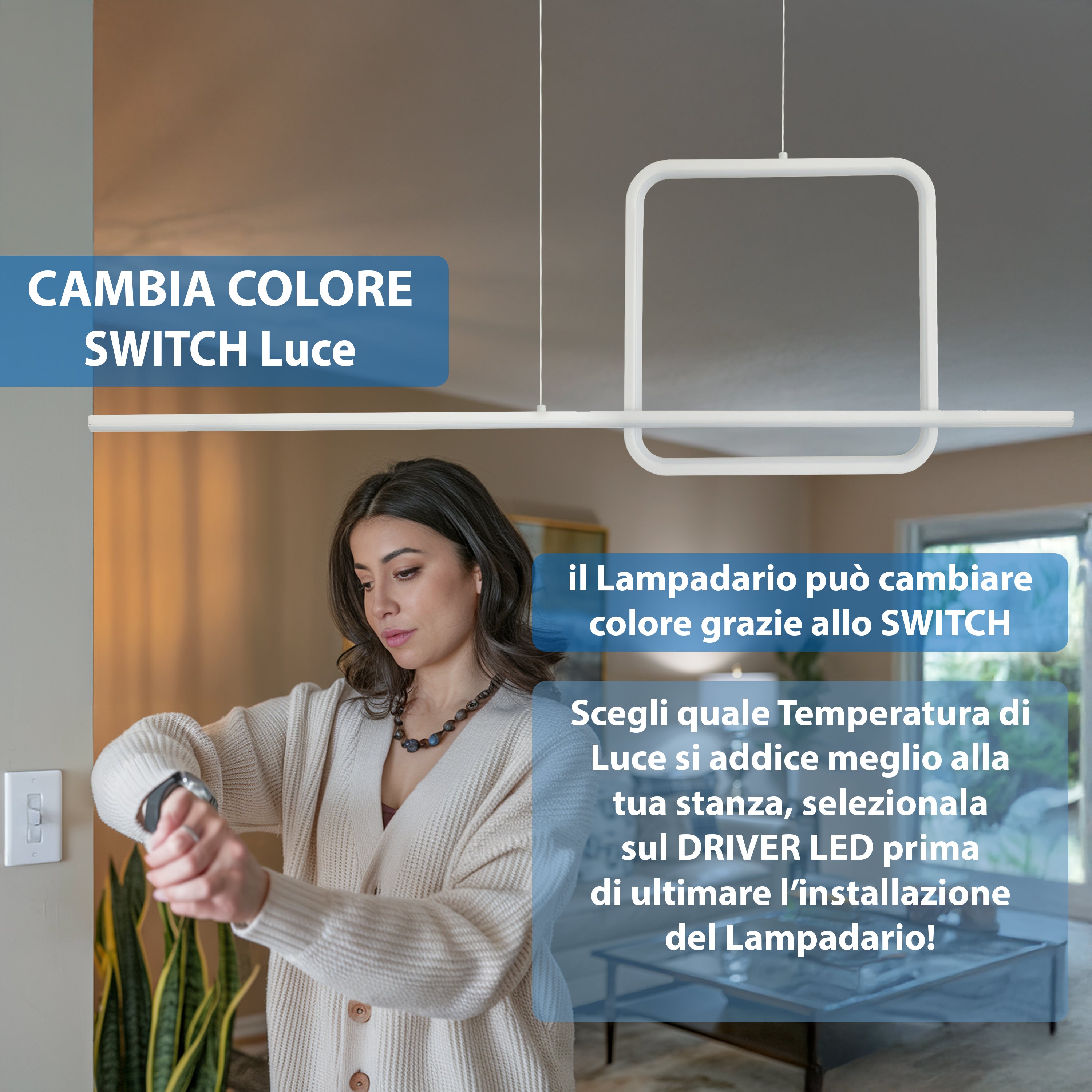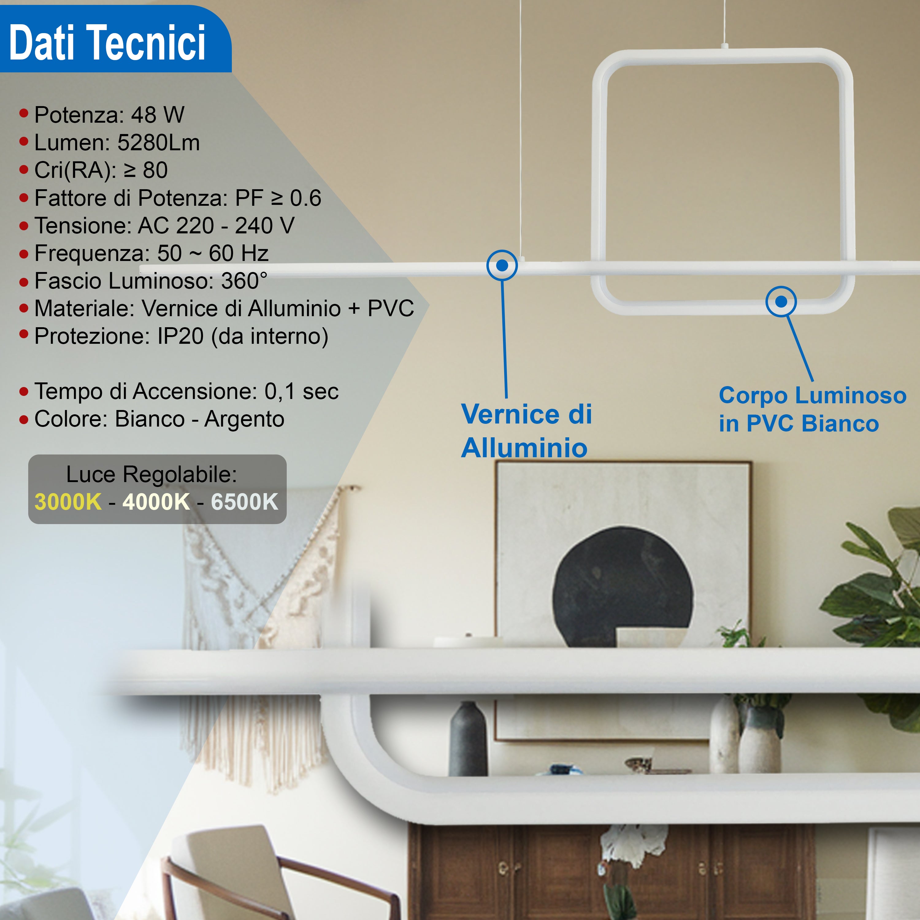 Lampadario a Sospensione LED 48W, Forma Quadrata, Luce Regolabile Calda-Naturale-Fredda