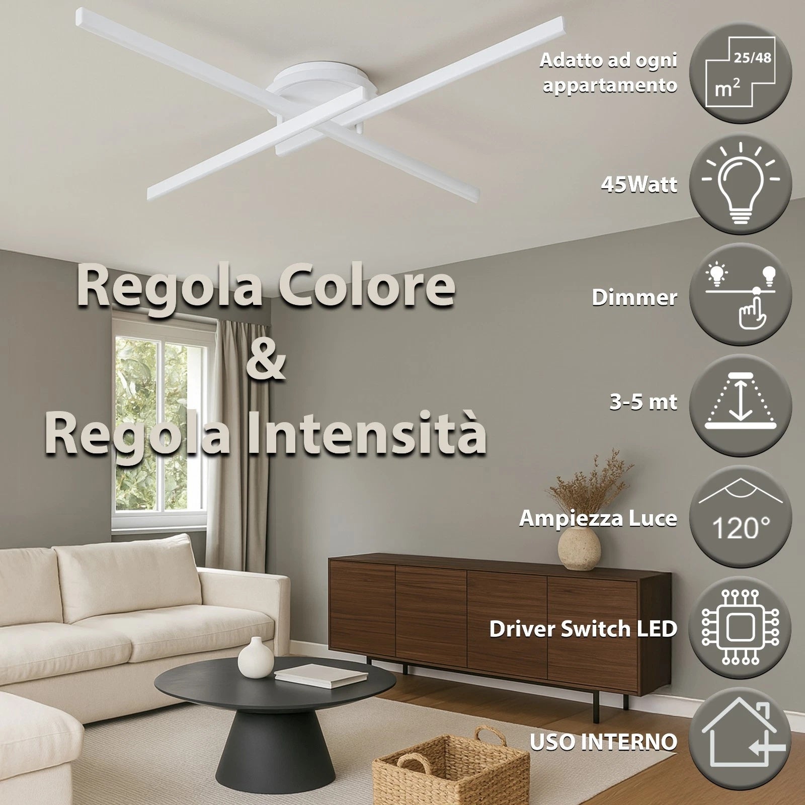 - Illuminazione piena e uniforme: 48 W e 3600 lm diffusi su 120 ° illuminano stanze da 25 m² a 48 m² senza coni d’ombra.