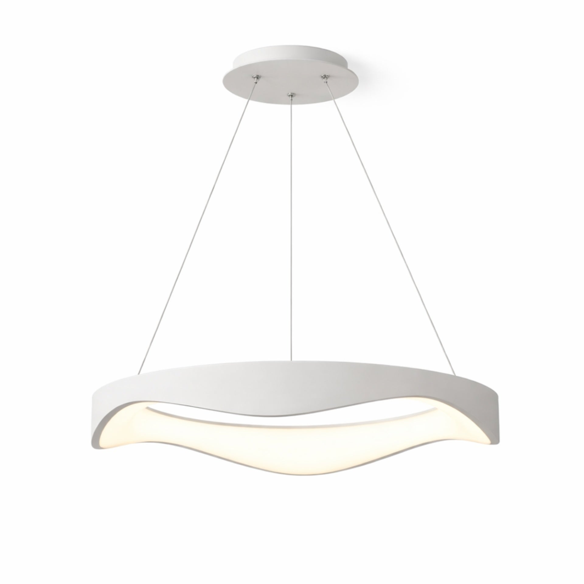 Lampadario LED a sospensione per uso interno, progettato per fornire un'illuminazione moderna e sofisticata, con un design elegante e minimalista che si adatta a qualsiasi ambiente, grazie al colore bianco e ai materiali di alta qualità come metallo e acrilico.