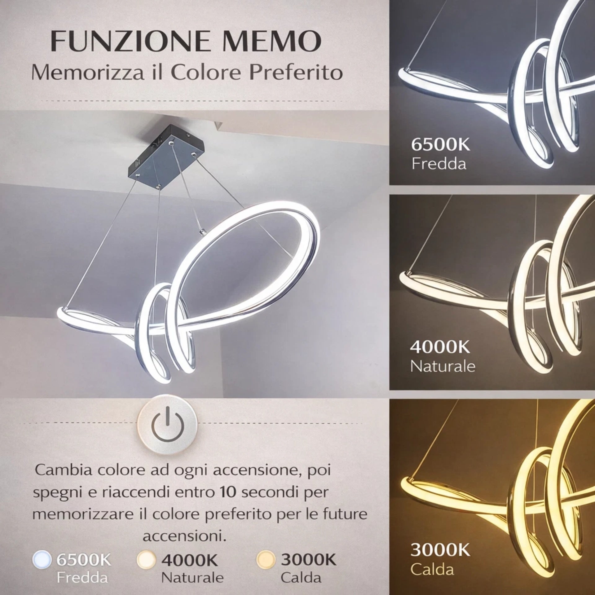 - CAMBIO TEMPERATURA LUCE: Con la possibilità di selezionare tra tre temperature di luce (3000K, 4000K, 6500K), puoi scegliere l'atmosfera ideale per ogni momento della giornata, da luce calda a luce fredda.