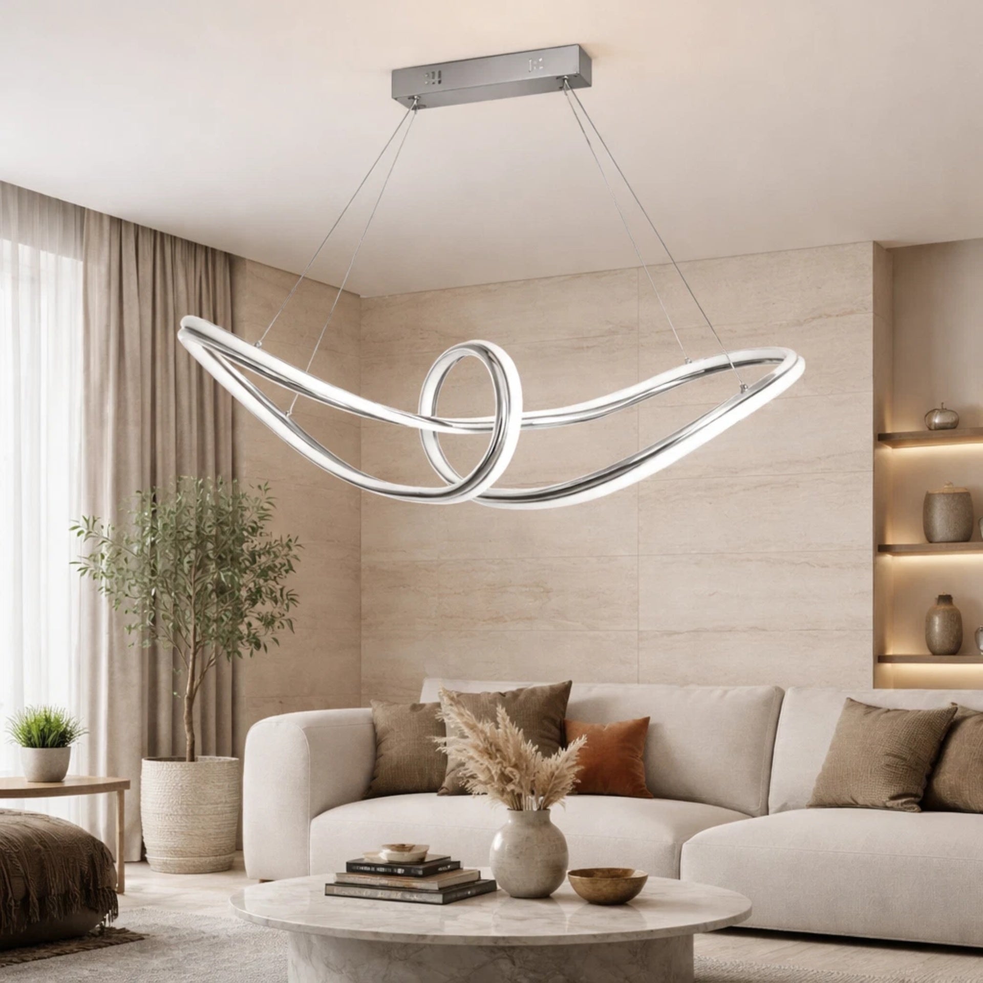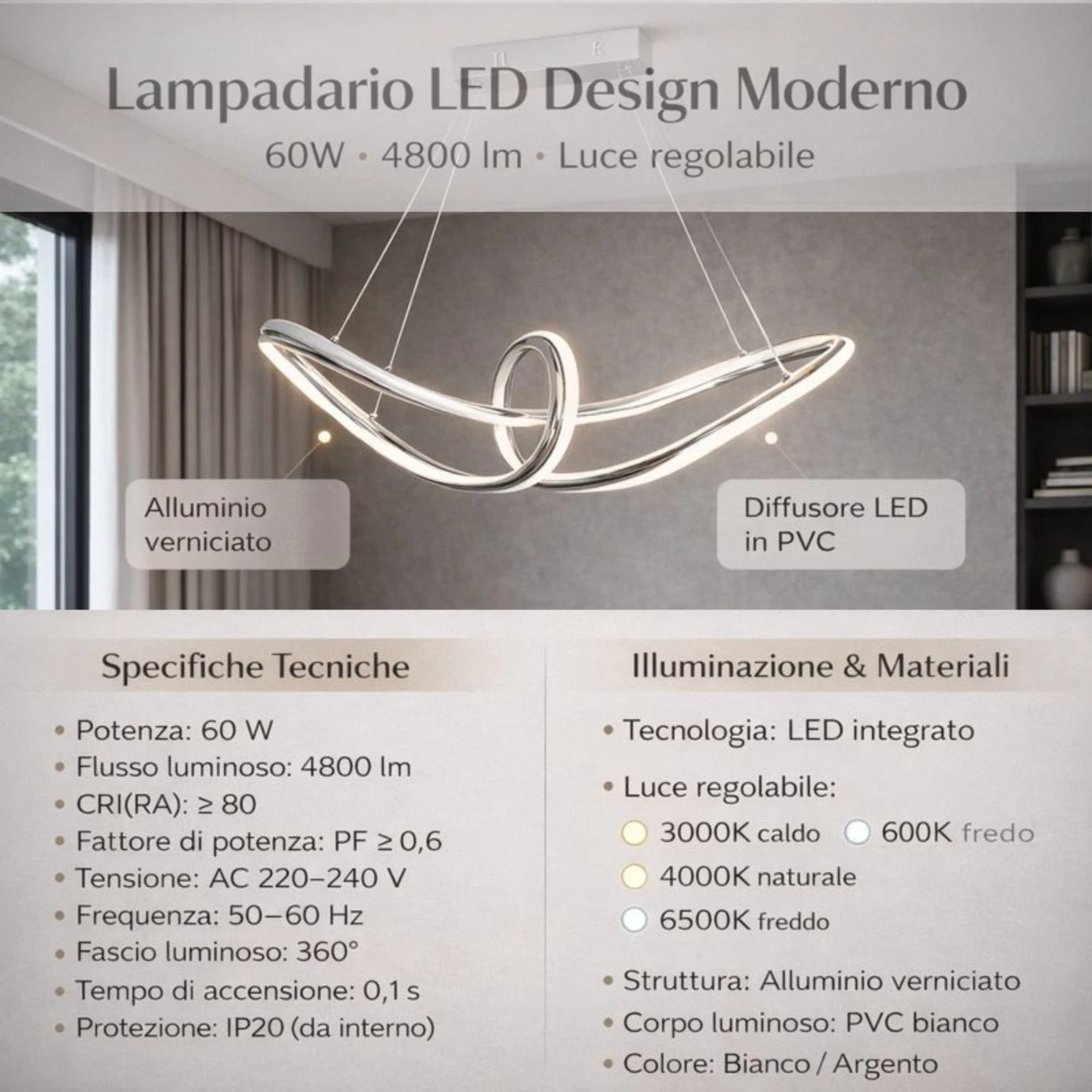 Lampadario LED Moderno Cromato a Sospensione, Altezza Regolabile, 60W, 4800 Lumen