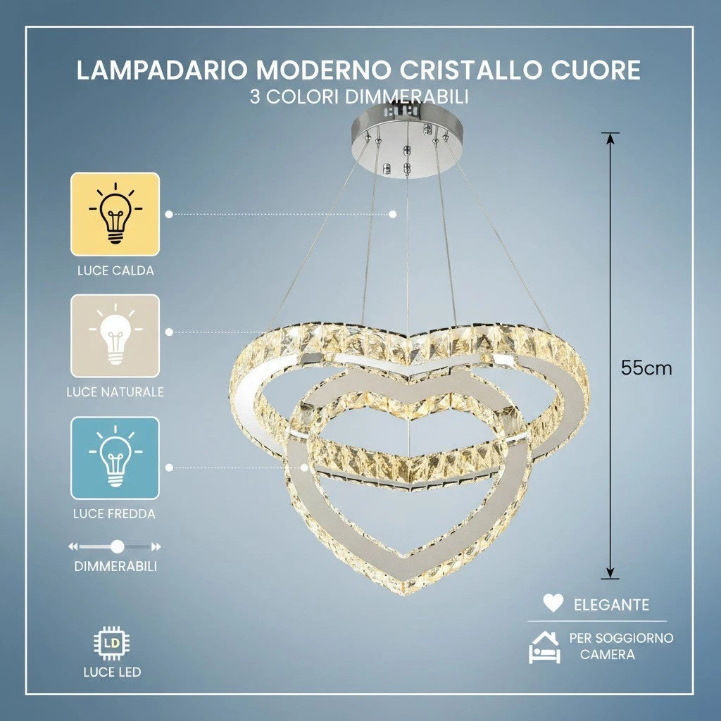 Lampadario Moderno LED a Sospensione Cuore in Cristallo