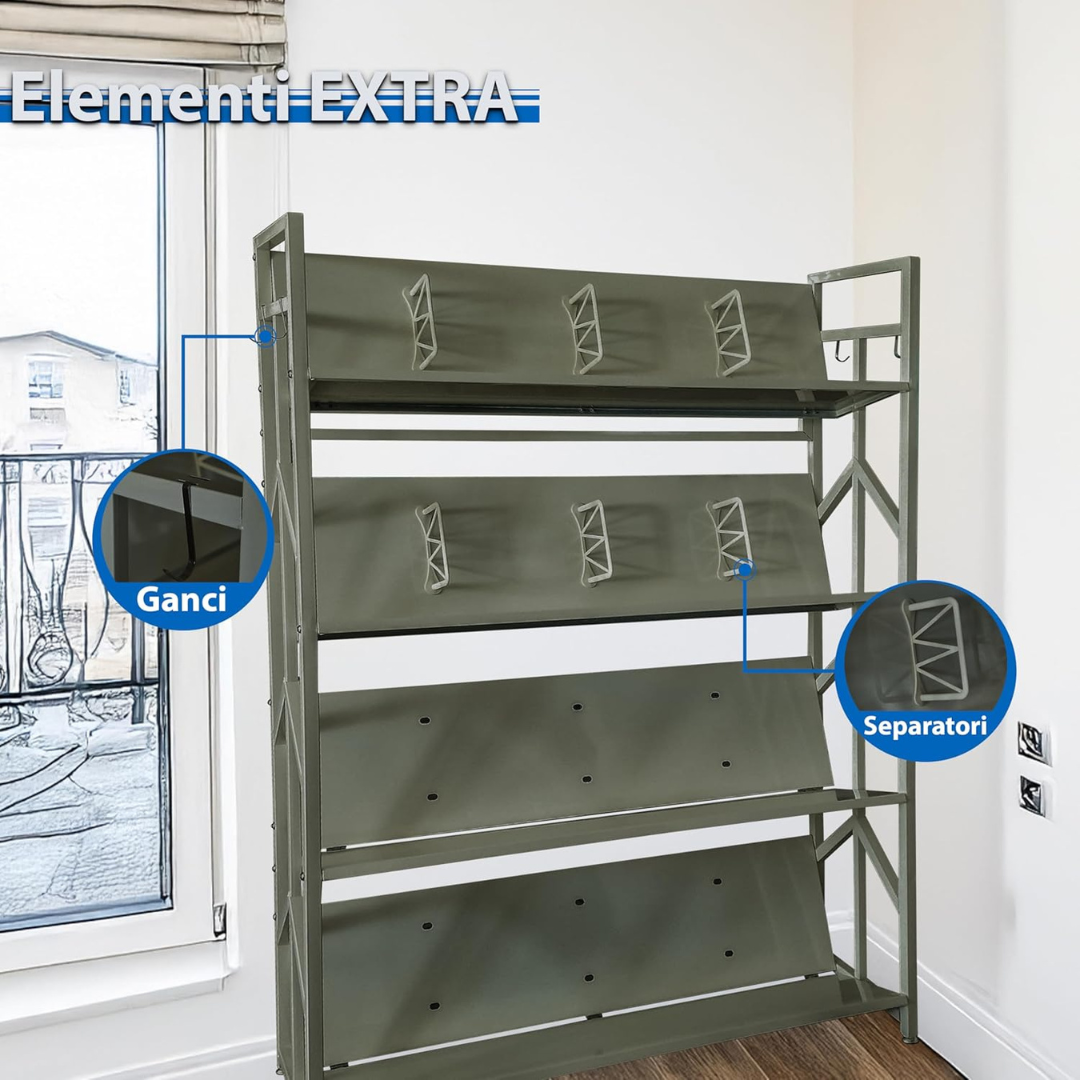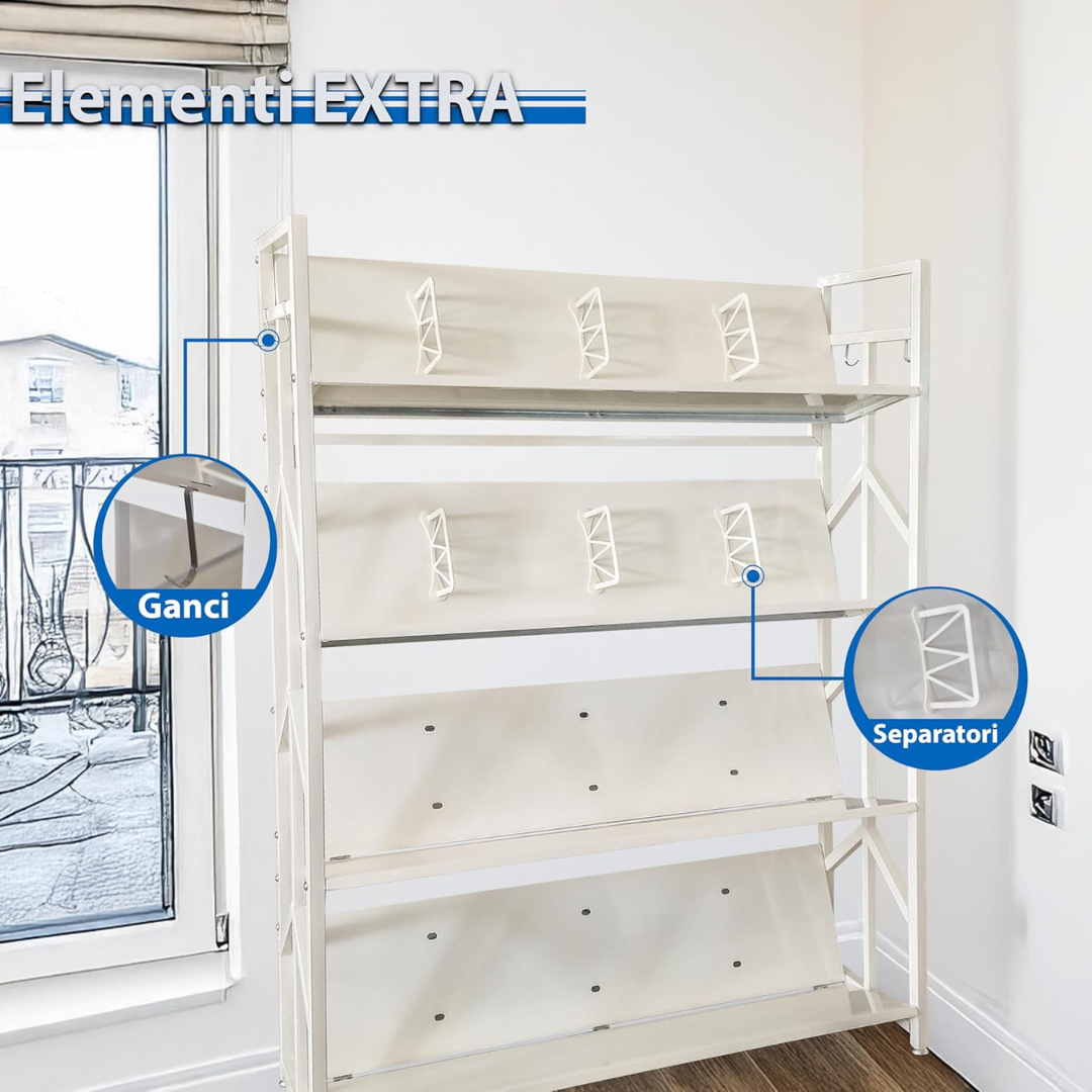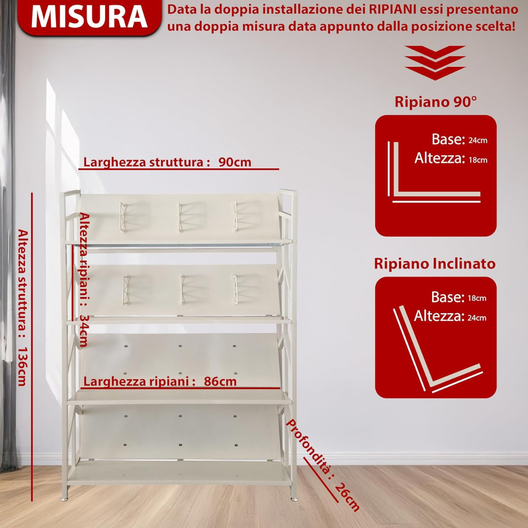 - VERSATILITÀ DI DESIGN: Disponibile in due eleganti varianti colore, Tortora e Bianco, e con 4 o 5 ripiani, si adatta a qualsiasi stile di arredamento, dal moderno al classico contemporaneo.