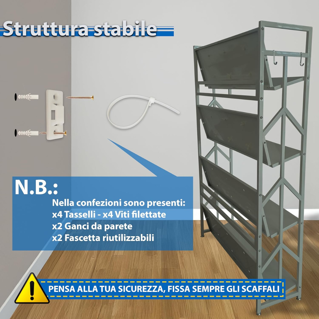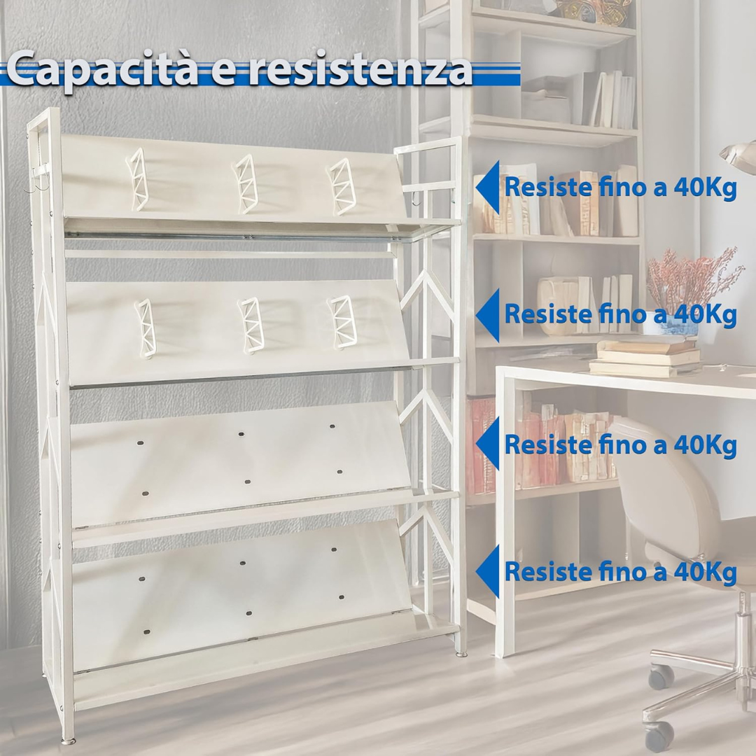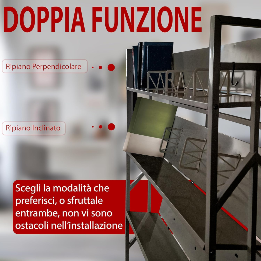 - RIPIANI INCLINABILI: I ripiani in metallo sono regolabili in inclinazione per facilitare la visualizzazione e l'accesso a libri, riviste o documenti, migliorando l'organizzazione quotidiana.