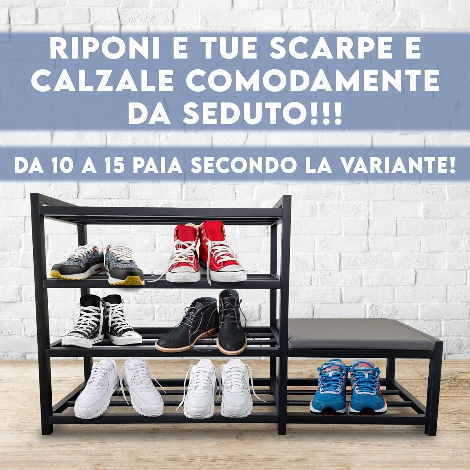 • SEDUTA COMODA: La seduta laterale in metallo offre una superficie stabile e confortevole per indossare e togliere le scarpe, unendo funzionalità e comfort in un unico complemento d'arredo.