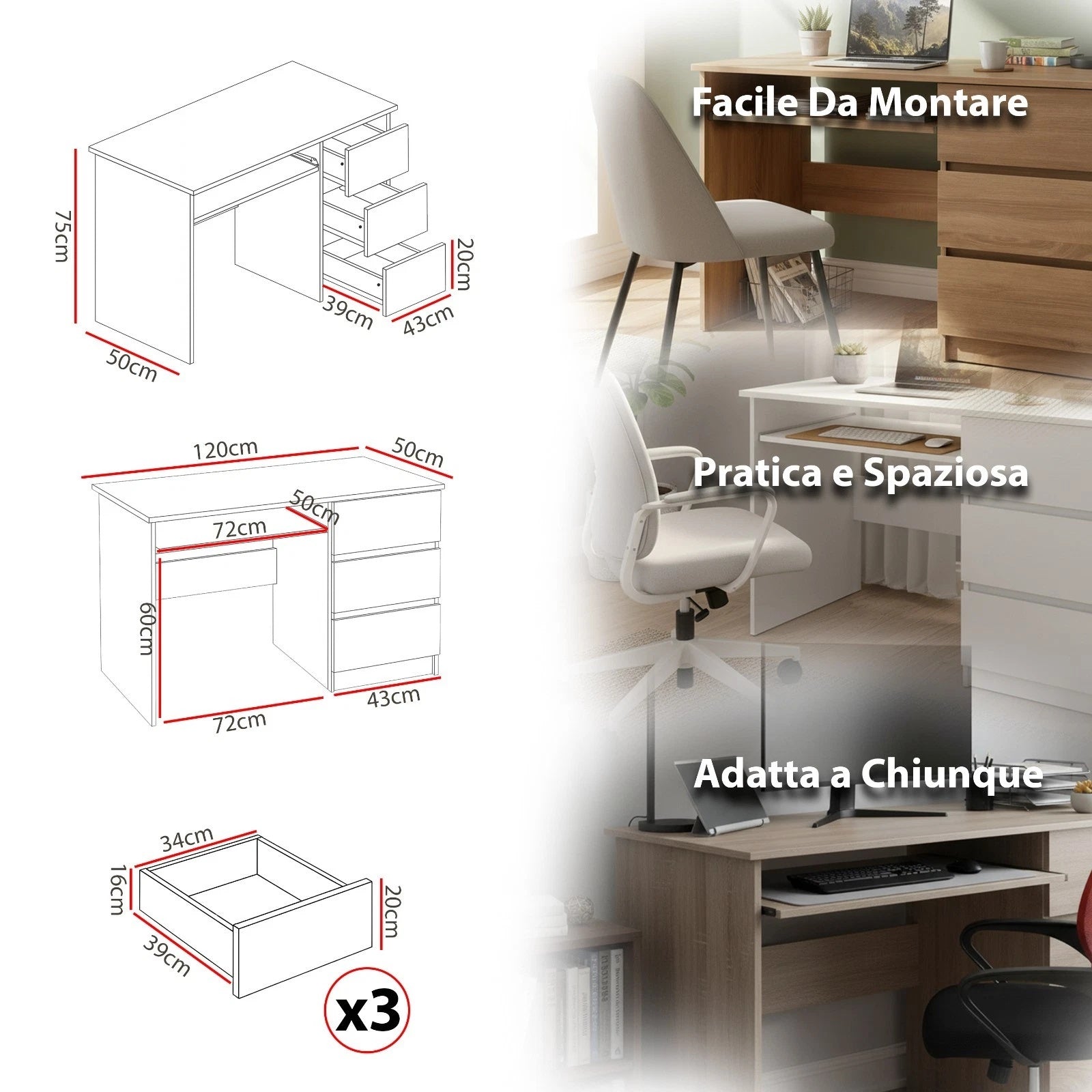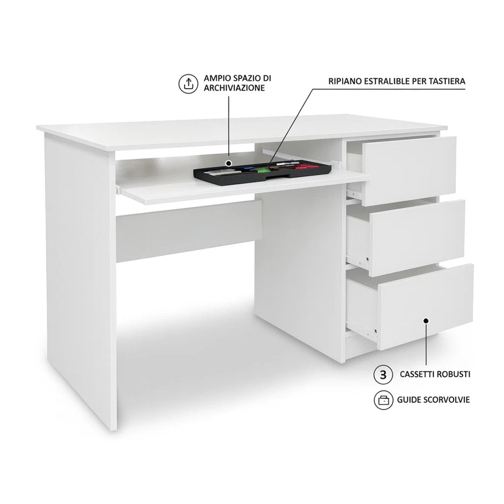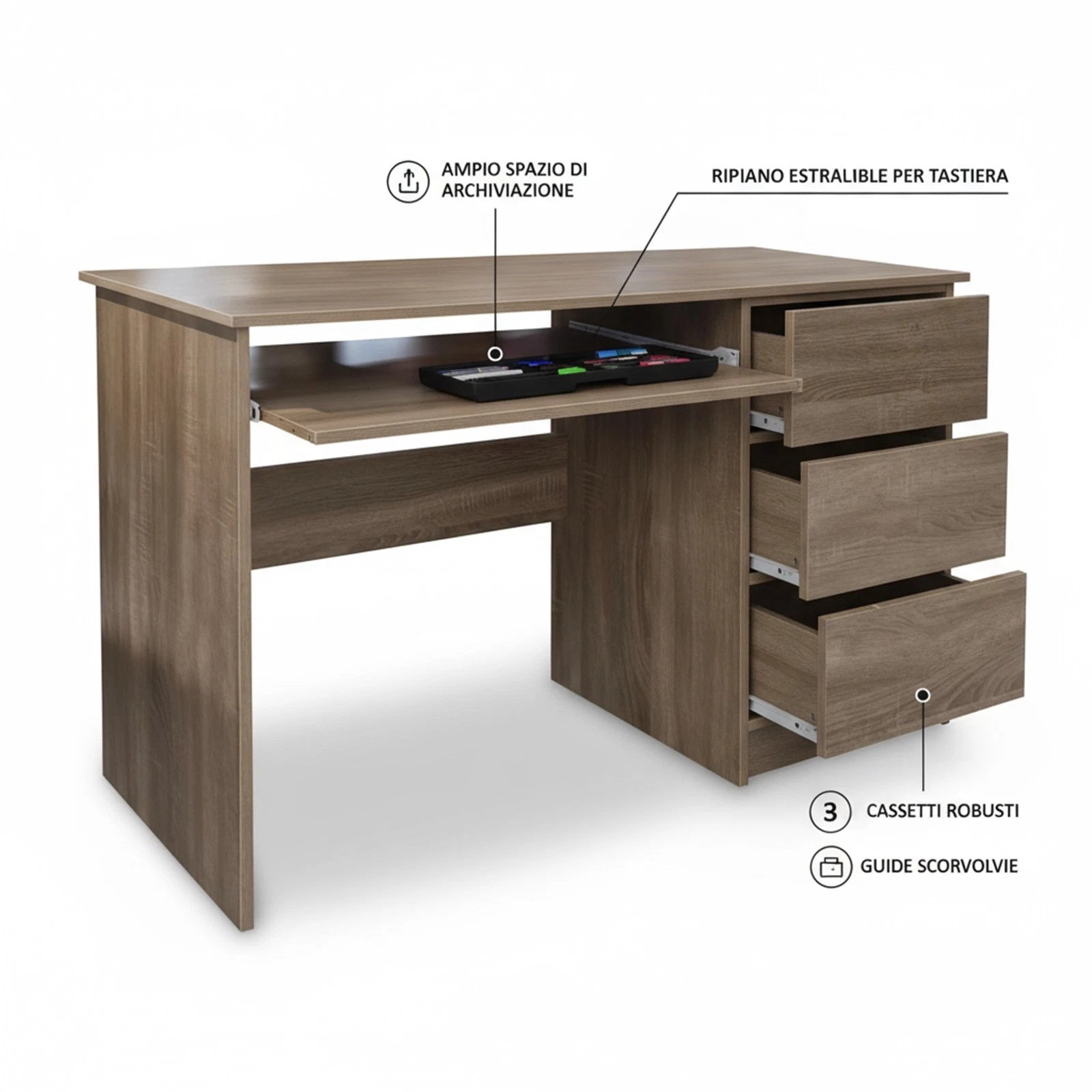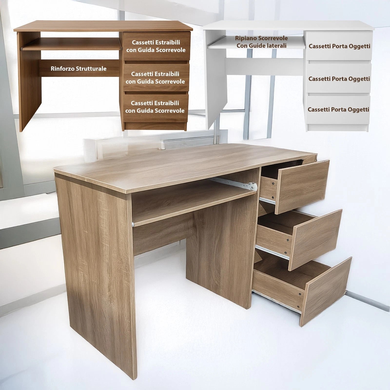 Scrivania Ufficio con 3 Cassetti e Piano Tastiera – Rovere o Bianco