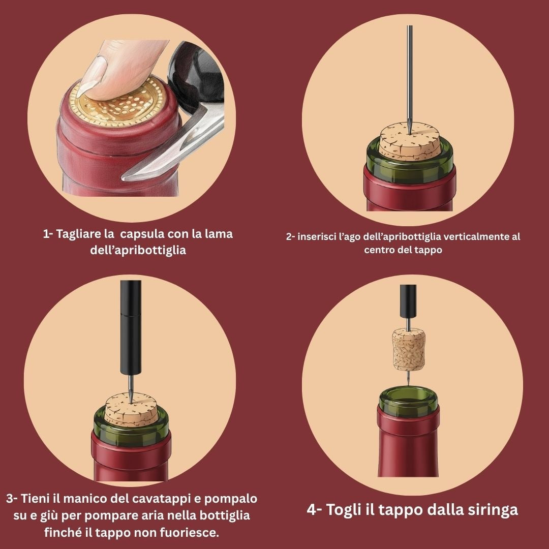Apertura senza sforzo grazie al sistema ad aria che spinge fuori il tappo senza torsioni, ideale per chi desidera rapidità e precisione in pochi secondi.