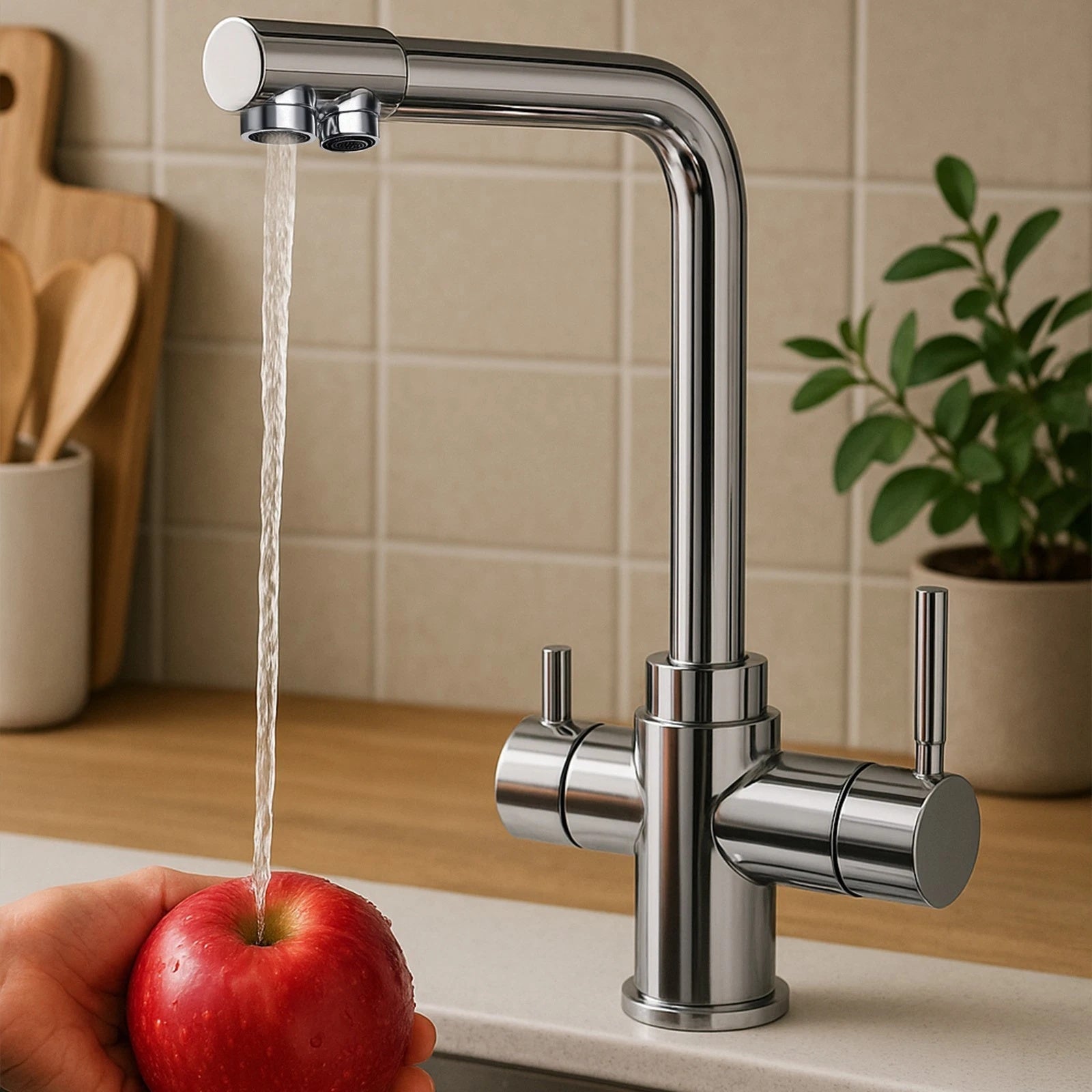 -Un unico rubinetto eroga acqua calda, fredda e potabile filtrata, evitando il bisogno di un secondo miscelatore in cucina.