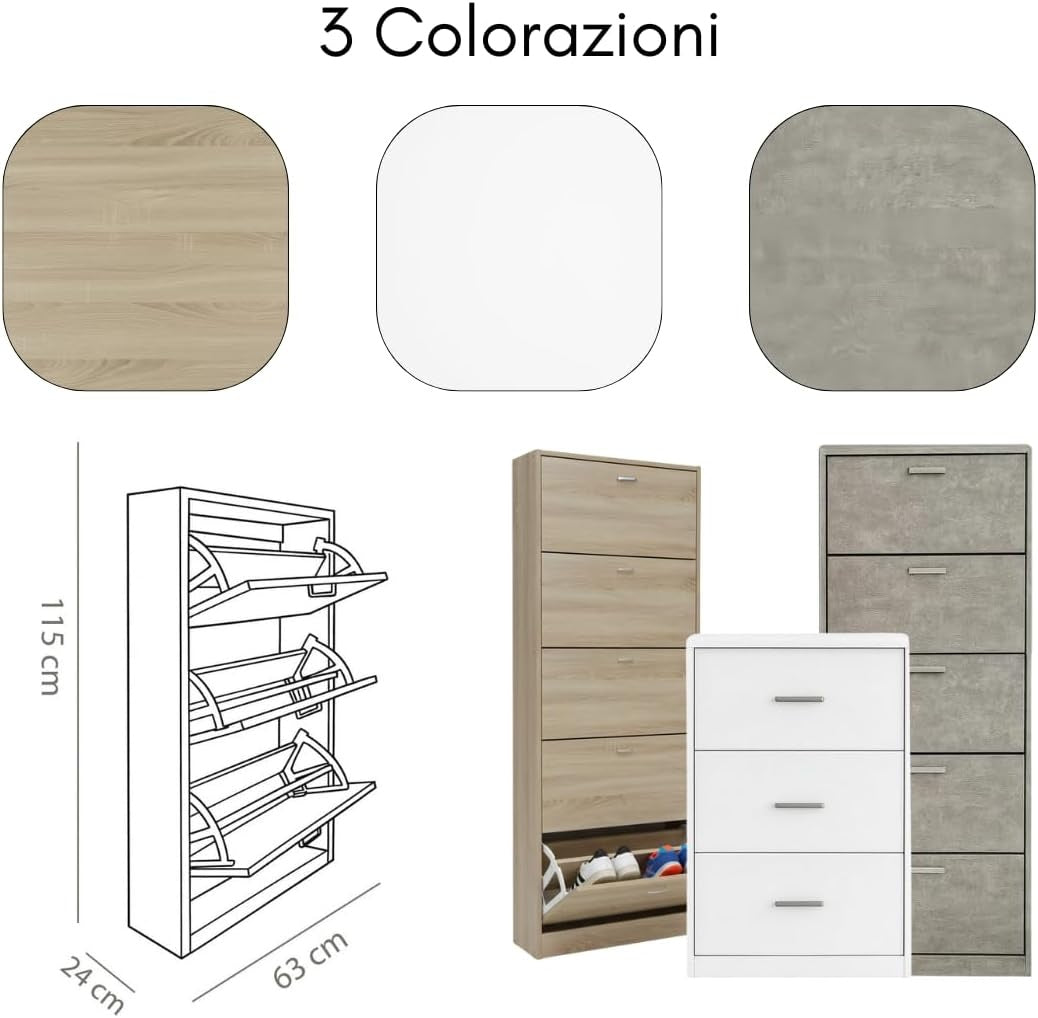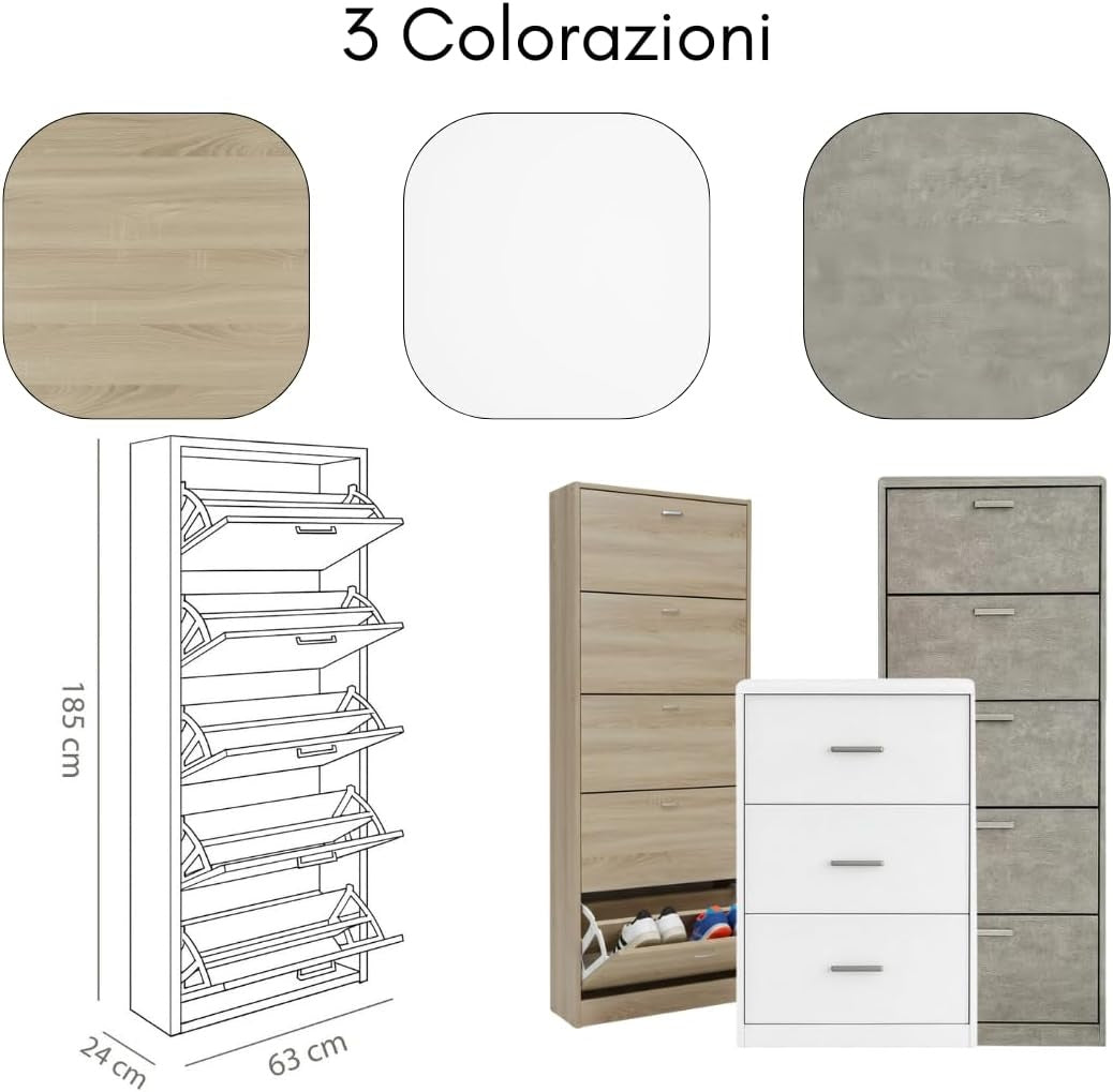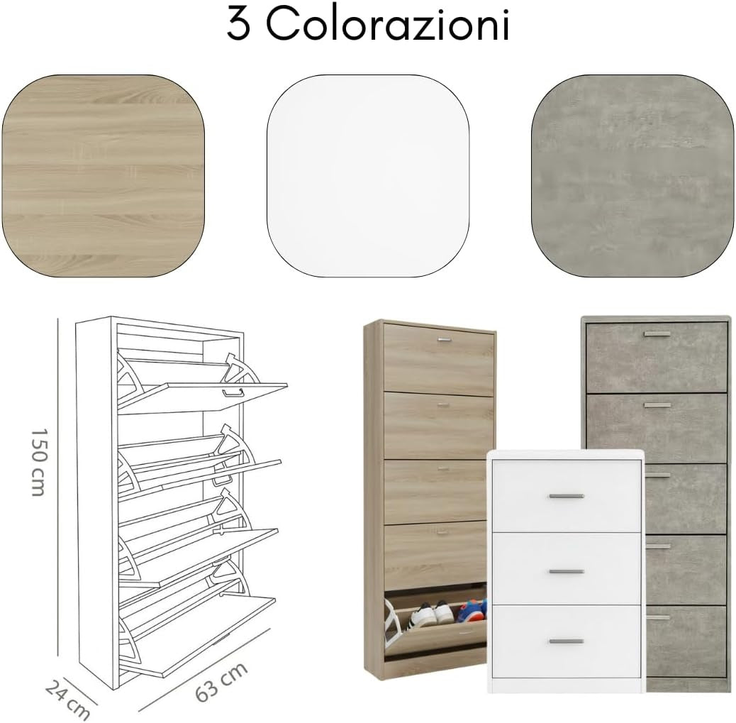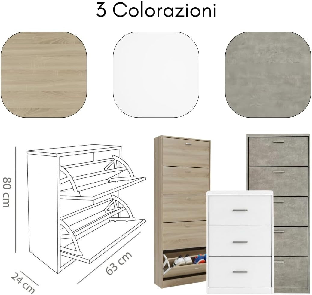 Scarpiera in MDF Melaminico 2/3/4/5 ripiani, Ante a Ribalta, Rovere Bianco Cemento