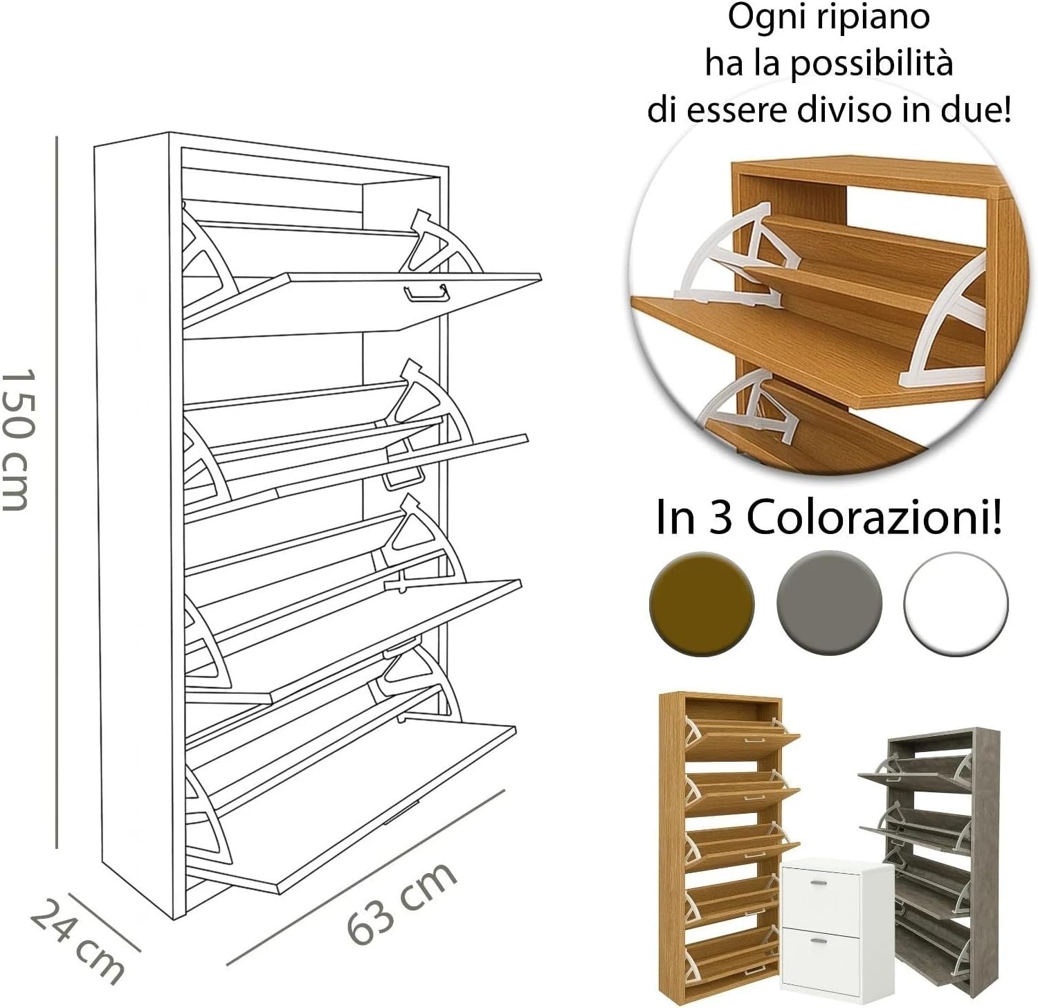 - ELEGANZA FUNZIONALE: Maniglie grigio satinato e finiture in rovere o bianco, per adattarsi a qualsiasi arredamento.
