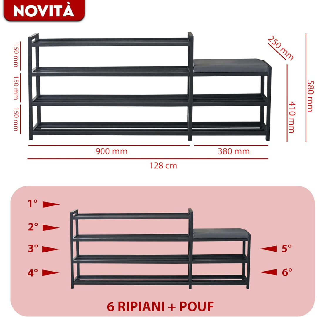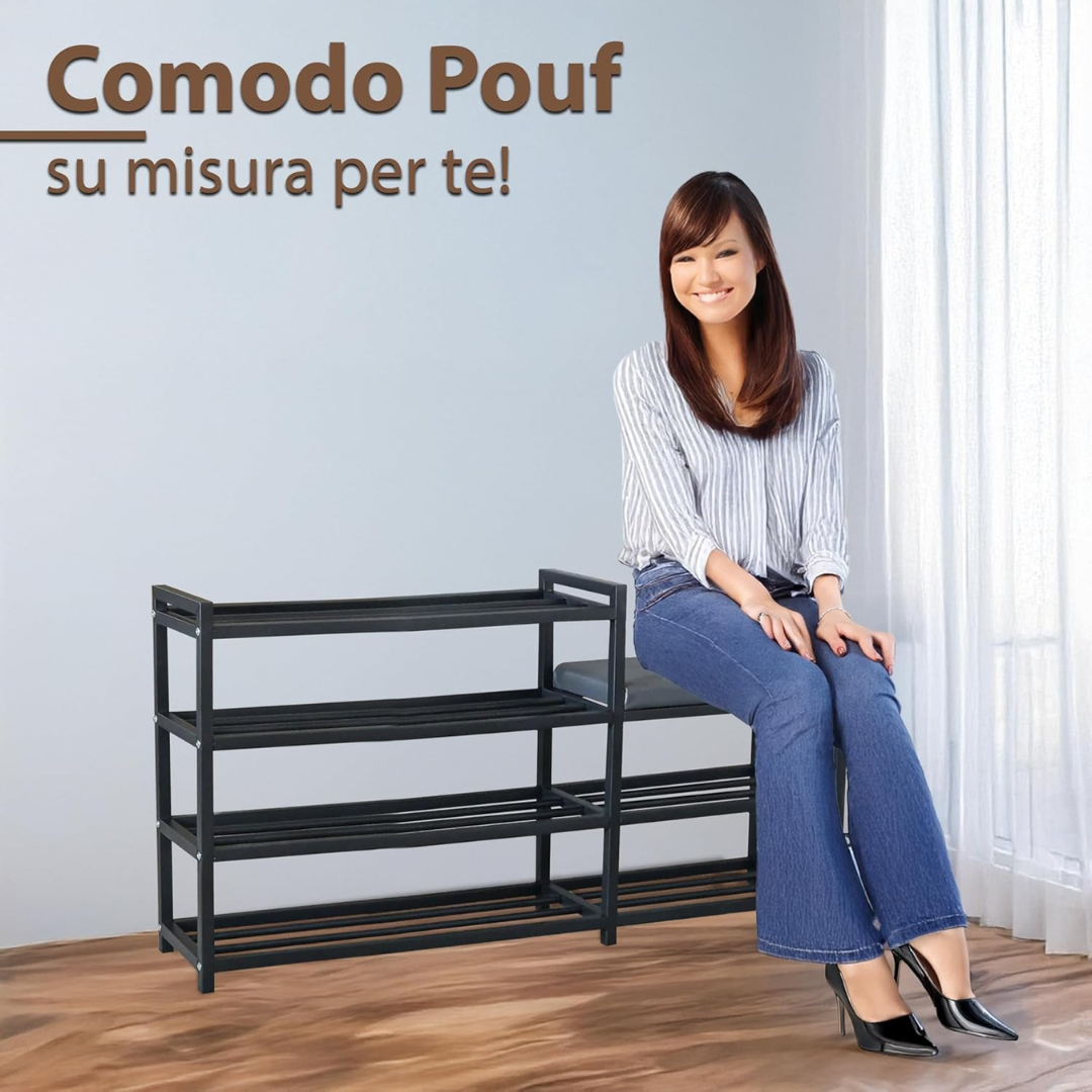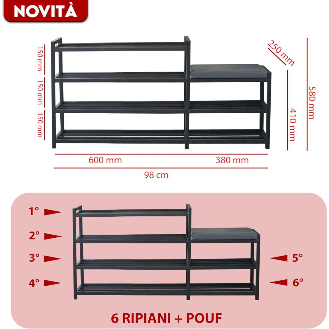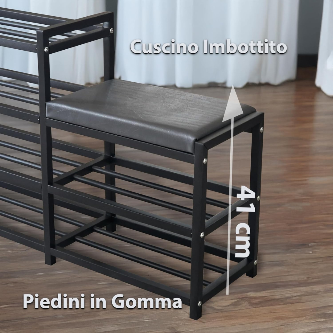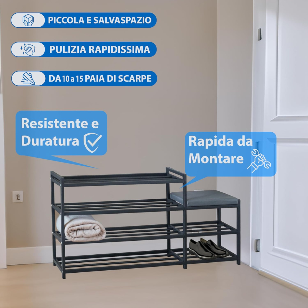 - STRUTTURA RINFORZATA IN ALLUMINIO: La solida struttura in alluminio rende la scarpiera robusta e praticamente indistruttibile, garantendo una lunga durata anche sotto l’uso quotidiano.