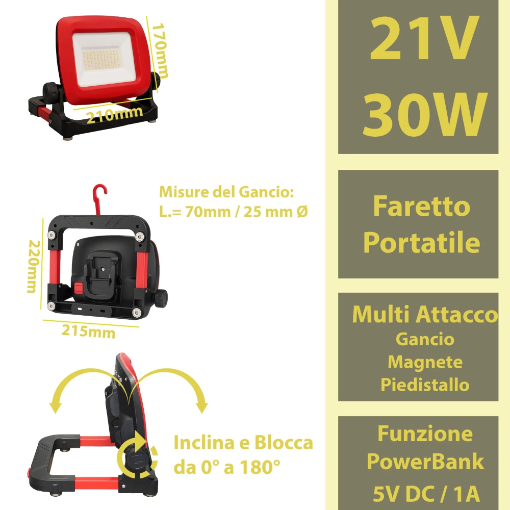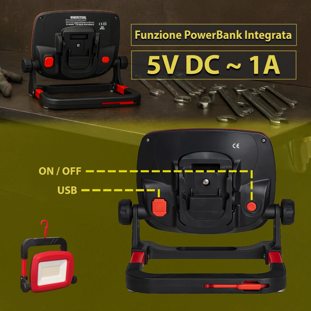 FUNZIONE POWERBANK USB: Entrambi i fari integrano una funzione powerbank con uscita USB (singola o doppia) per ricaricare in mobilità smartphone, tablet e altri dispositivi. Perfetto per attività outdoor, officine e situazioni senza accesso alla corrente.
