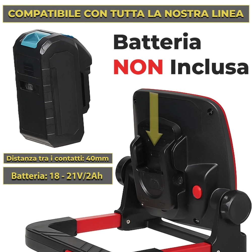 COMPATIBILE CON BATTERIE 21V: Compatibile con la maggior parte delle batterie da utensile 18–21V (non incluse), tra cui Bosch, Makita, DeWalt, Milwaukee, AEG, Ryobi e Metabo. Nessun adattatore richiesto se rispetta i 40mm di contatto.