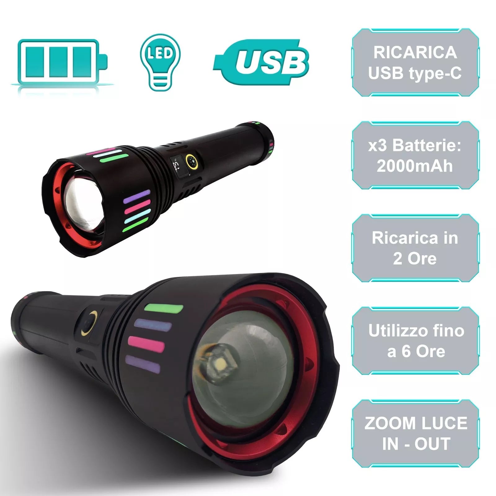 • RICARICA RAPIDA: Dotata di USB Type-C per una ricarica veloce e comoda, consentendo di avere sempre la torcia pronta all'uso.