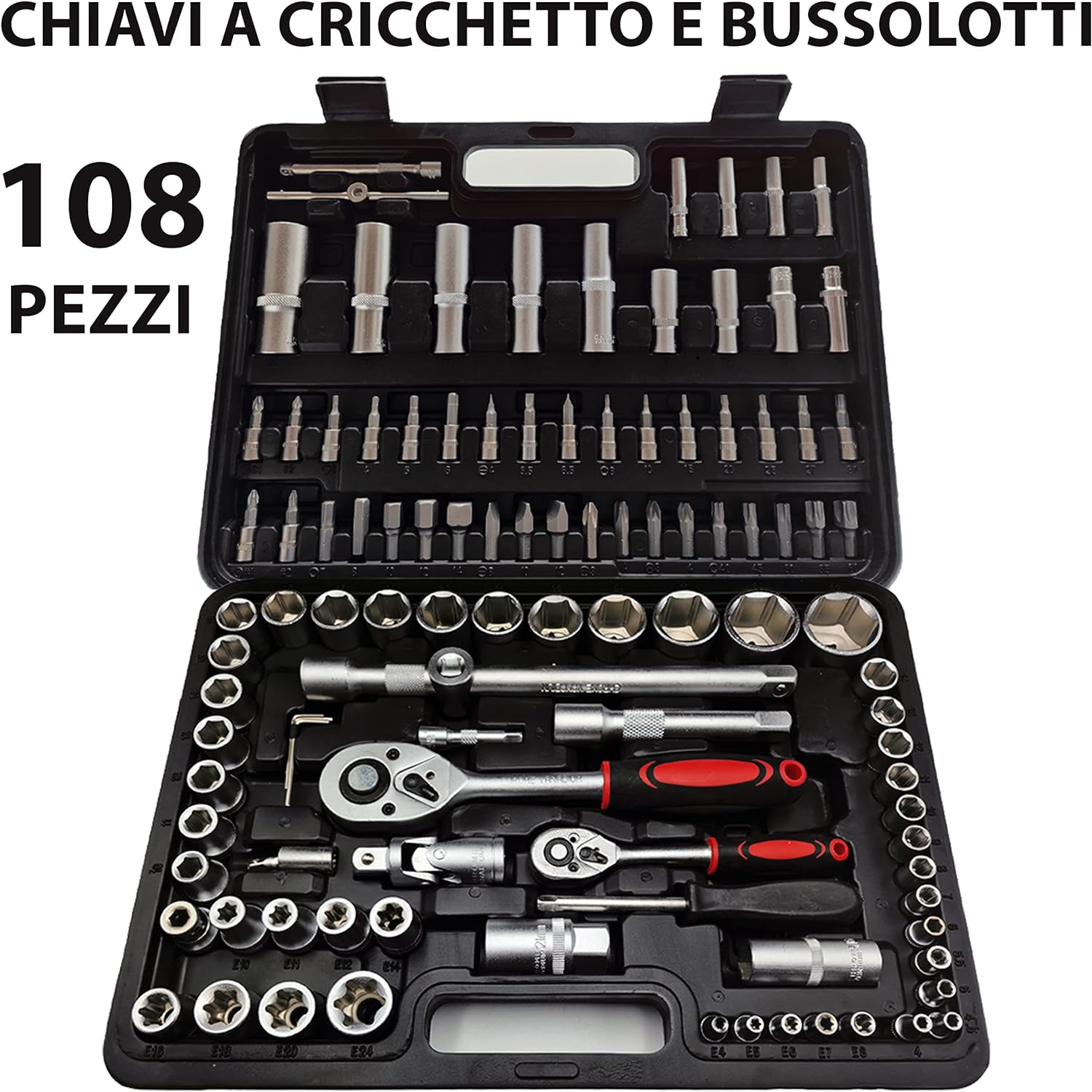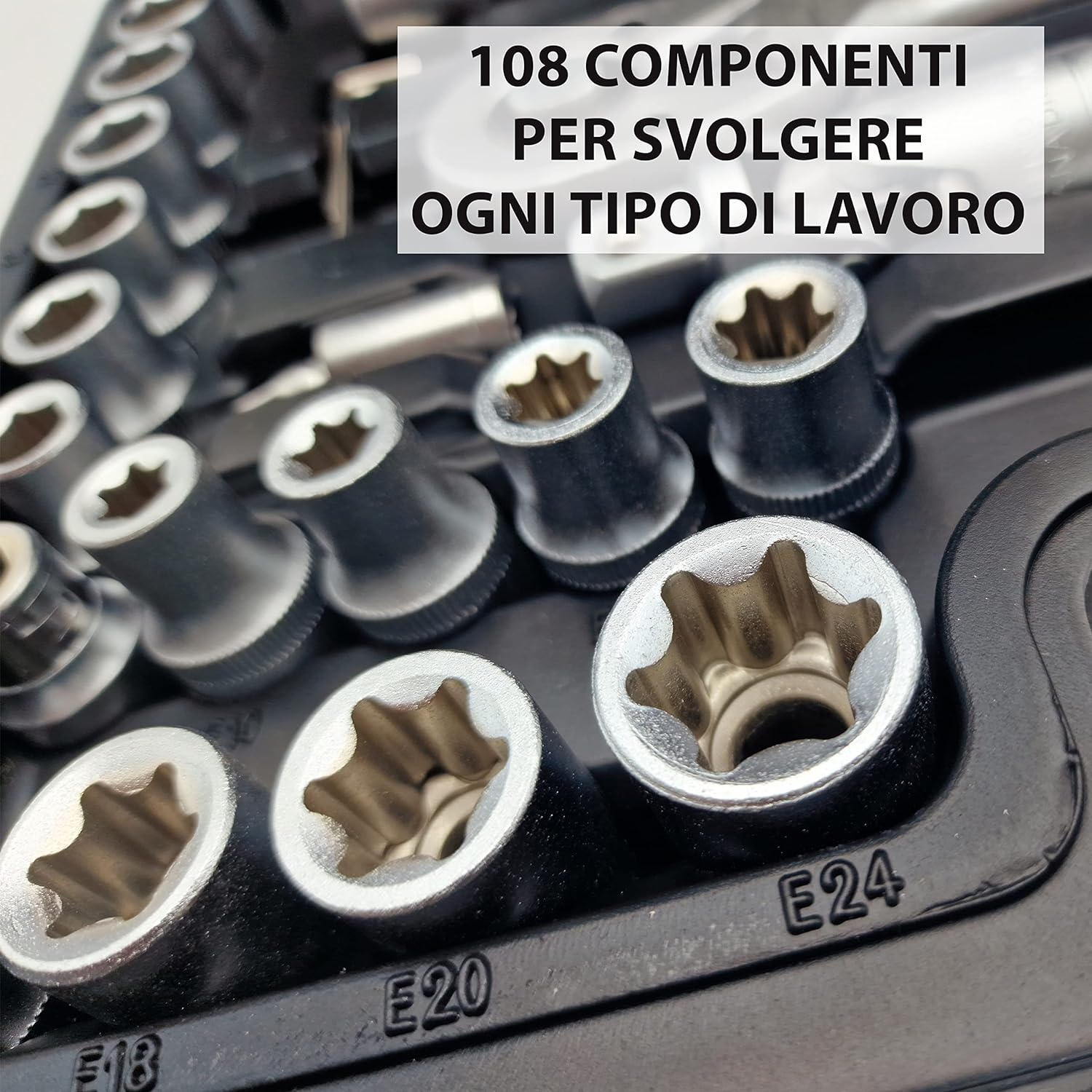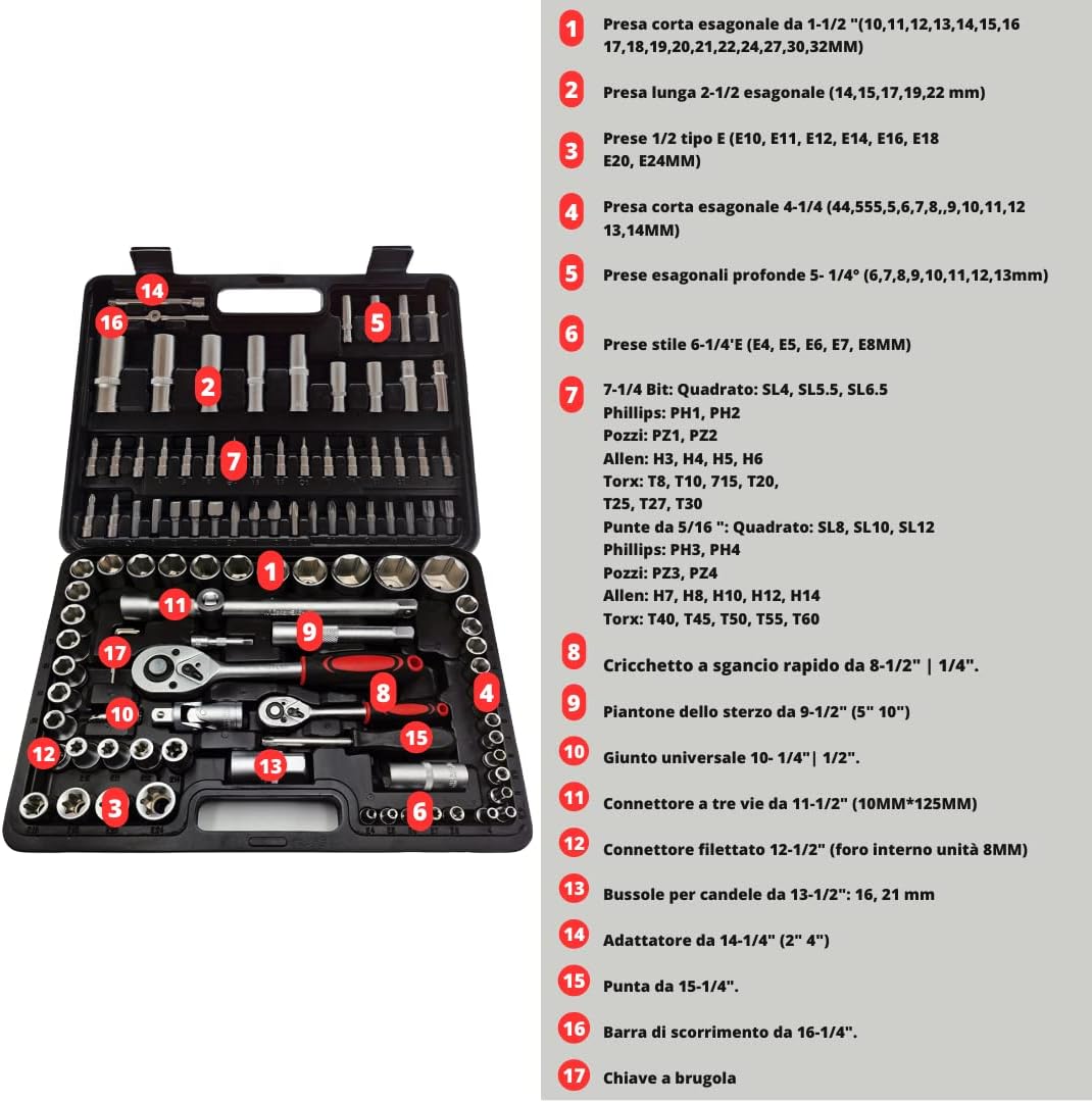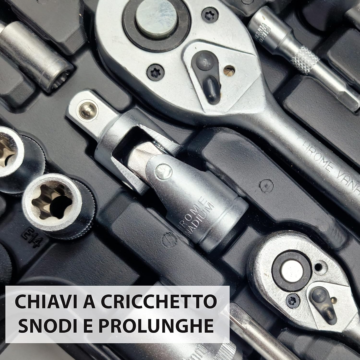 The case includes a wide range of tools, including 31 sockets with 1/4" and 1/2" connection, ratchets, extensions, joints, "T" lever, inserts for screws with different shapes (slotted, cross , Allen keys and Torx), adapter and hex keys. This kit represents a complete solution to address multiple applications that require the manipulation of screws or bolts of various sizes and shapes, offering maximum versatility and convenience for those working in the workshop or DIY sector.
