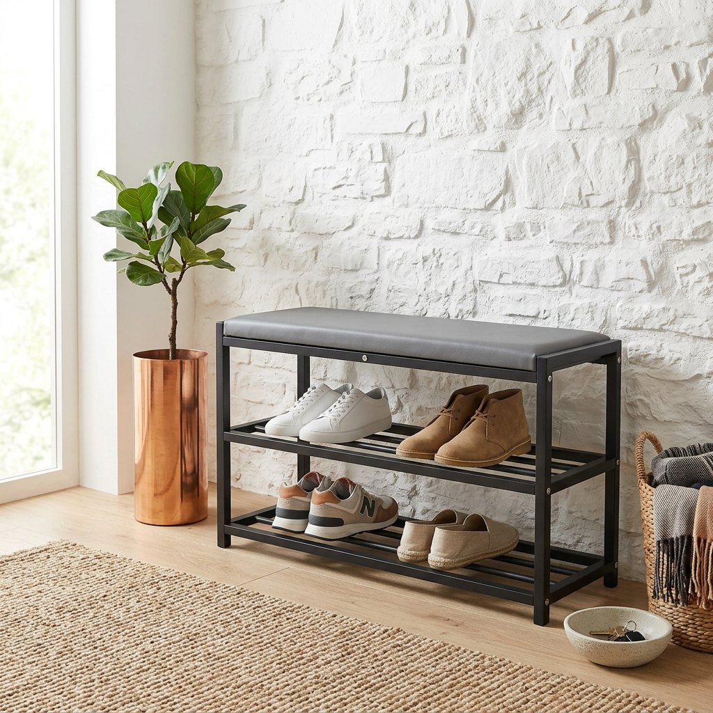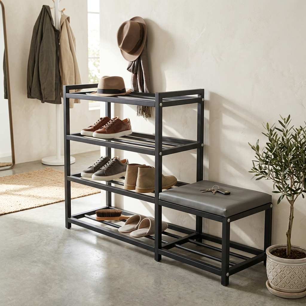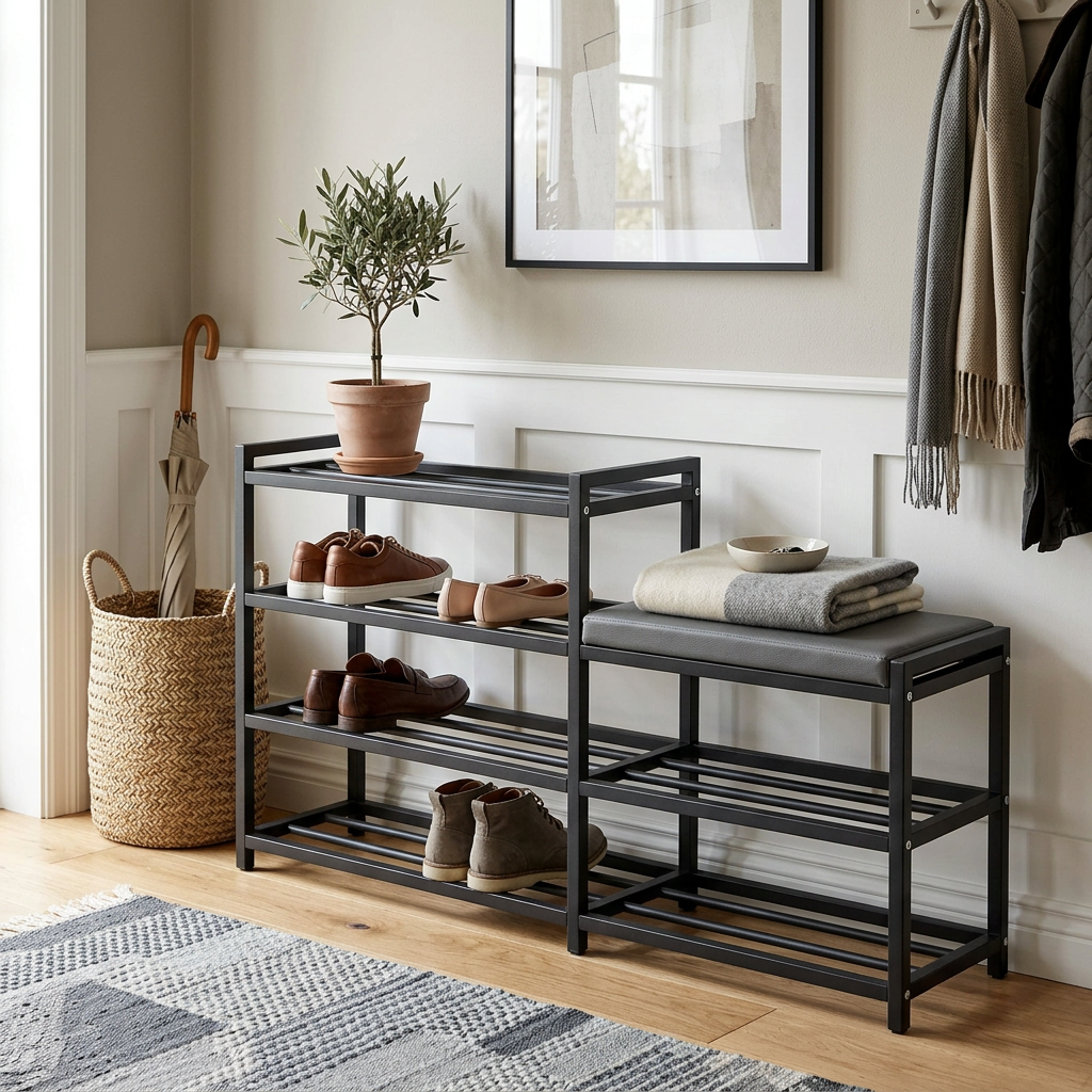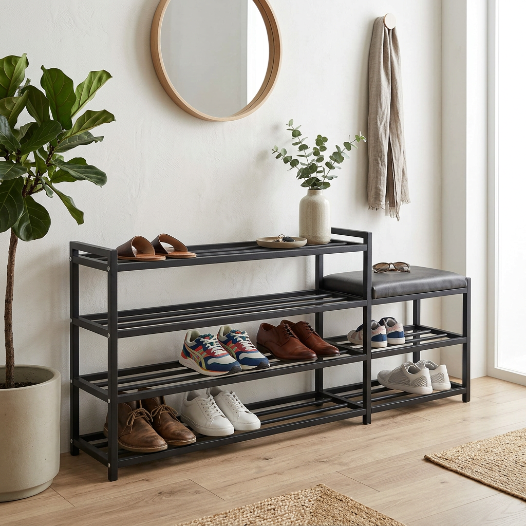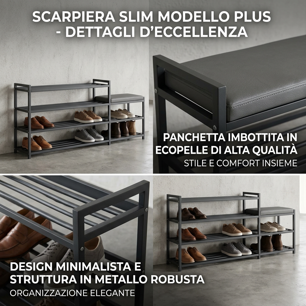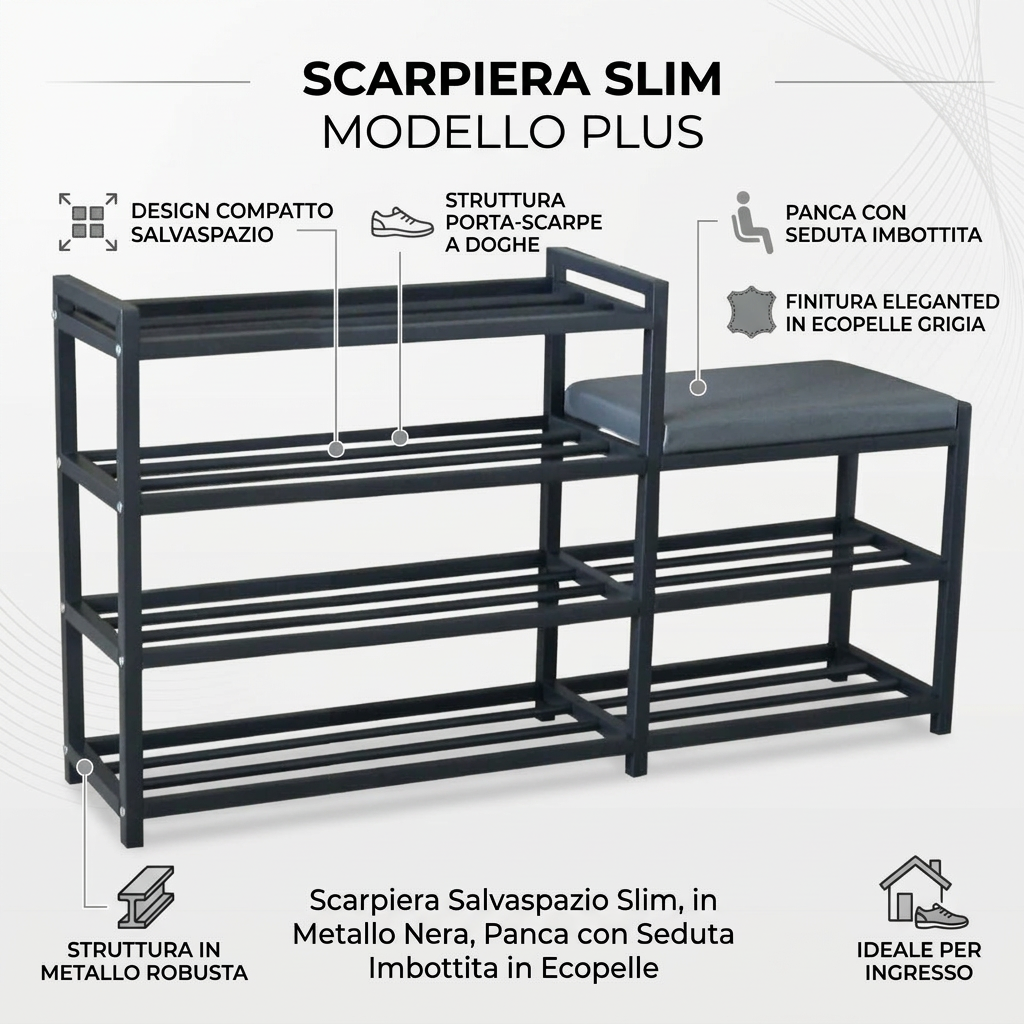 Our slim shoe rack is perfect for optimizing space in any environment, allowing you to store a large number of shoes without taking up too much space. Ideal for entryway use, it keeps your shoes organized and easily accessible, enhancing the aesthetics of your home. Made of sturdy black metal, this shoe rack is durable and stable, with an elegant design that blends seamlessly into any decor.