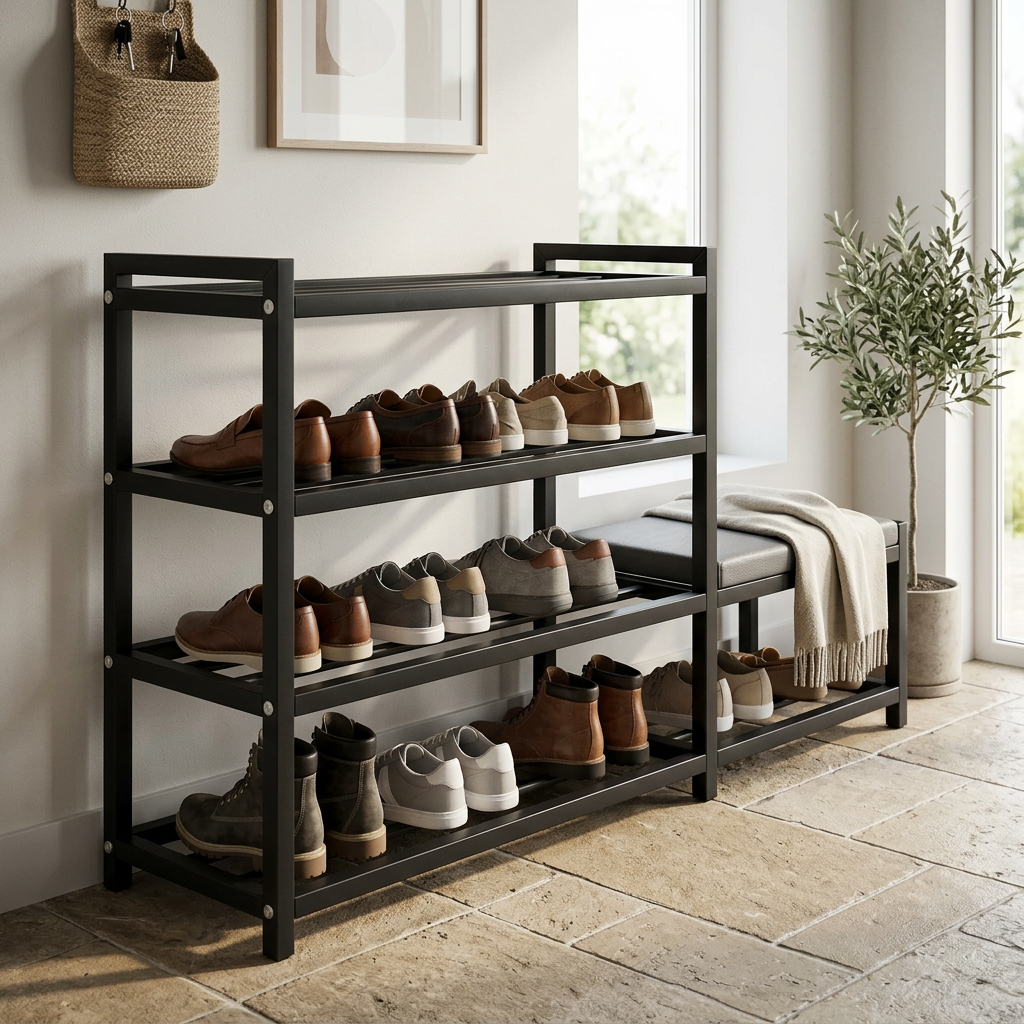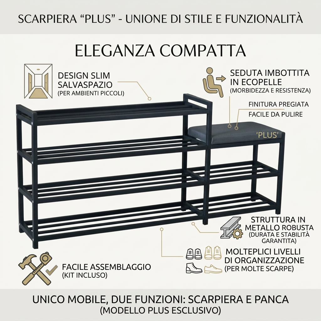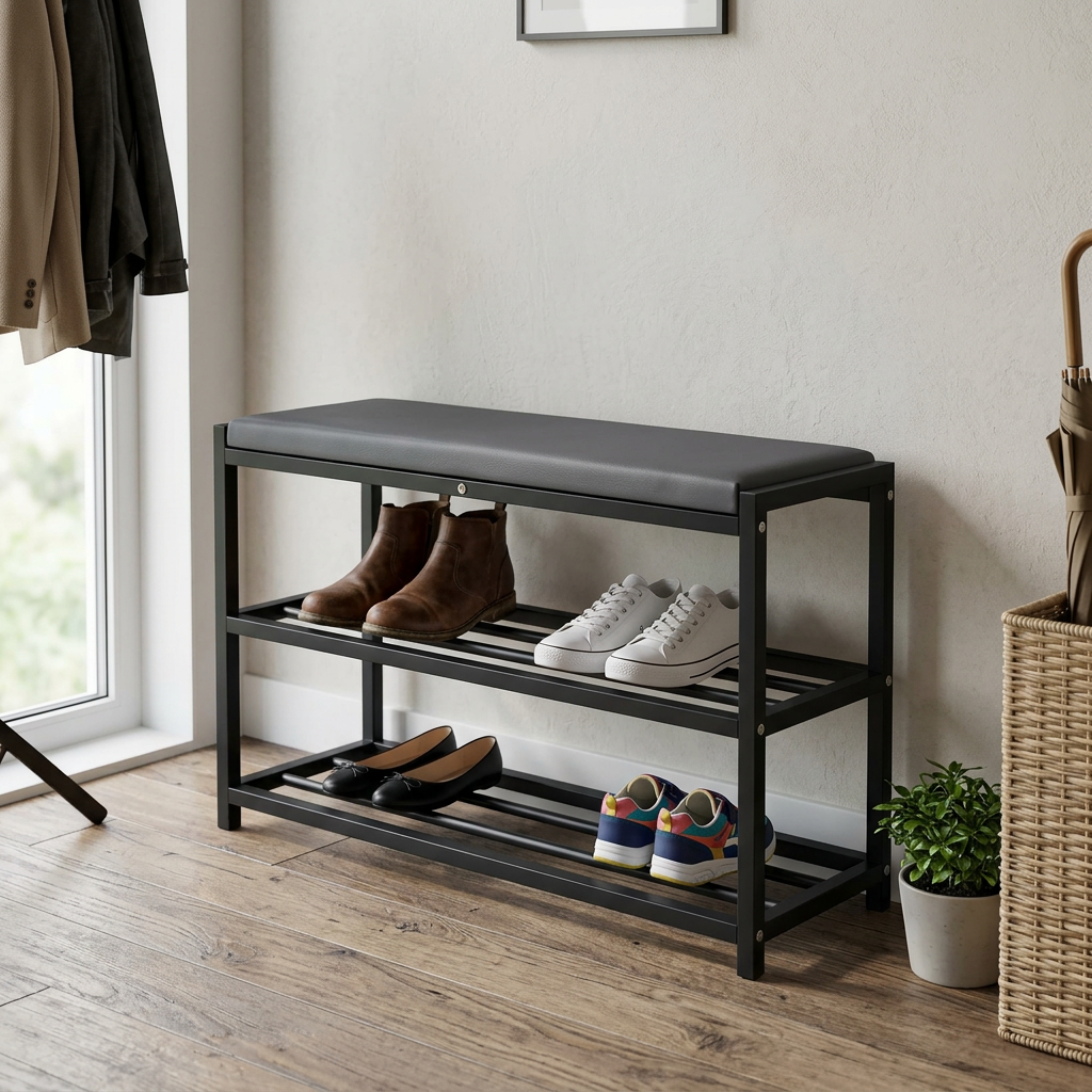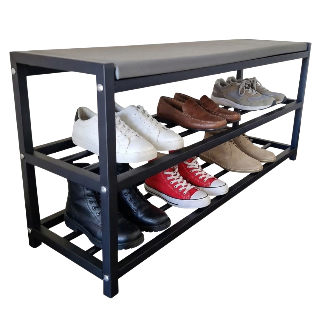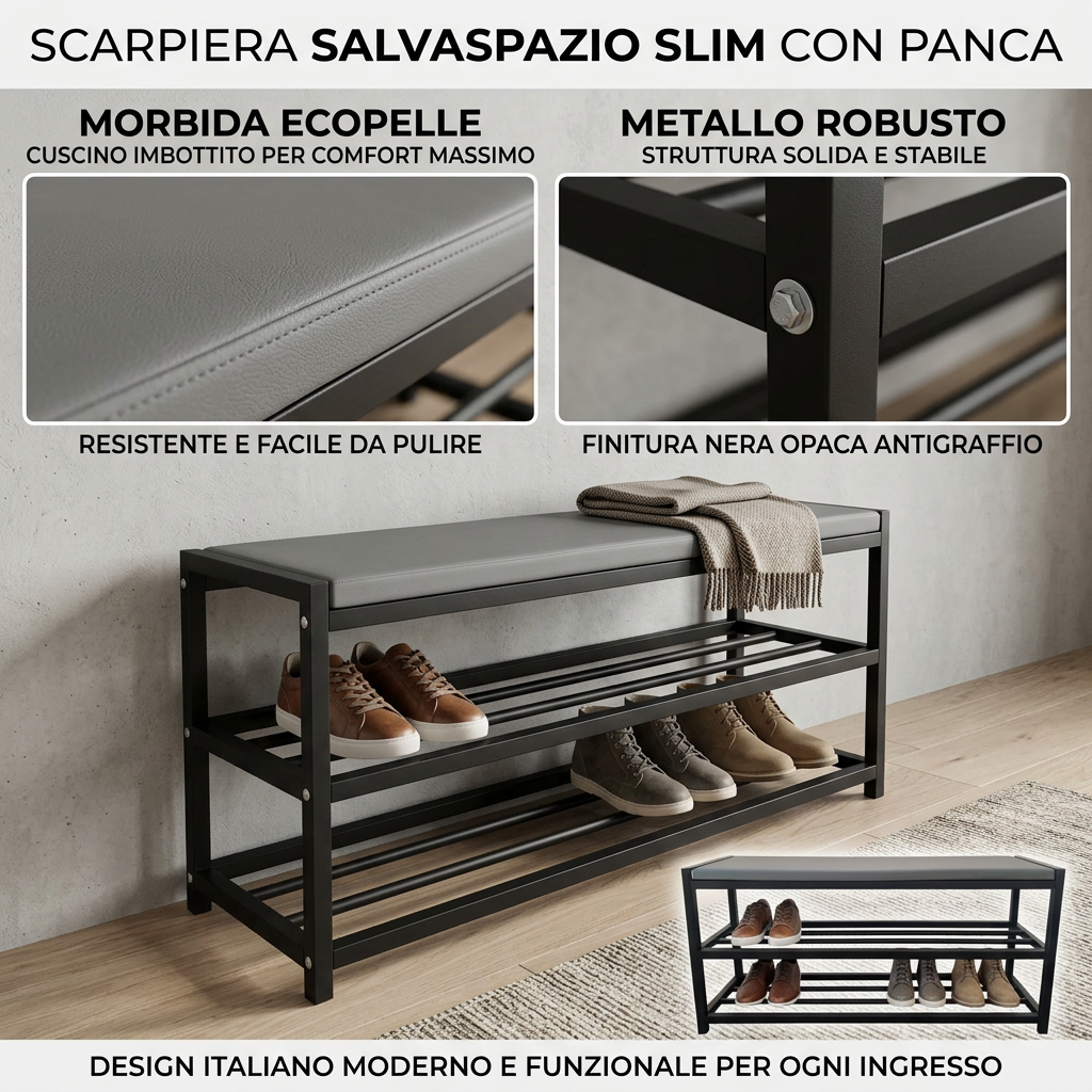 Our slim shoe rack is perfect for optimizing space in any environment, allowing you to store a large number of shoes without taking up too much space. Ideal for entryway use, it keeps your shoes organized and easily accessible, enhancing the aesthetics of your home. Made of sturdy black metal, this shoe rack is durable and stable, with an elegant design that blends seamlessly into any decor.