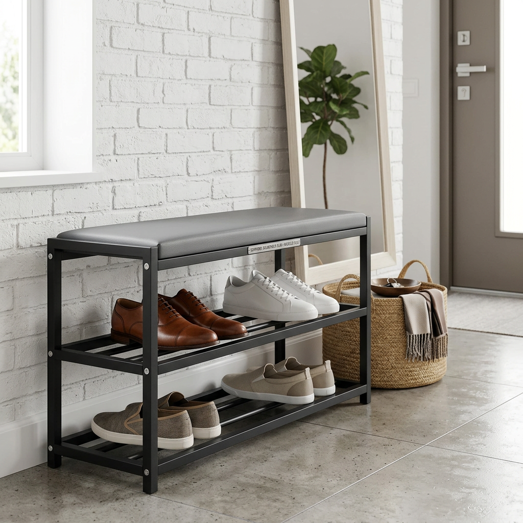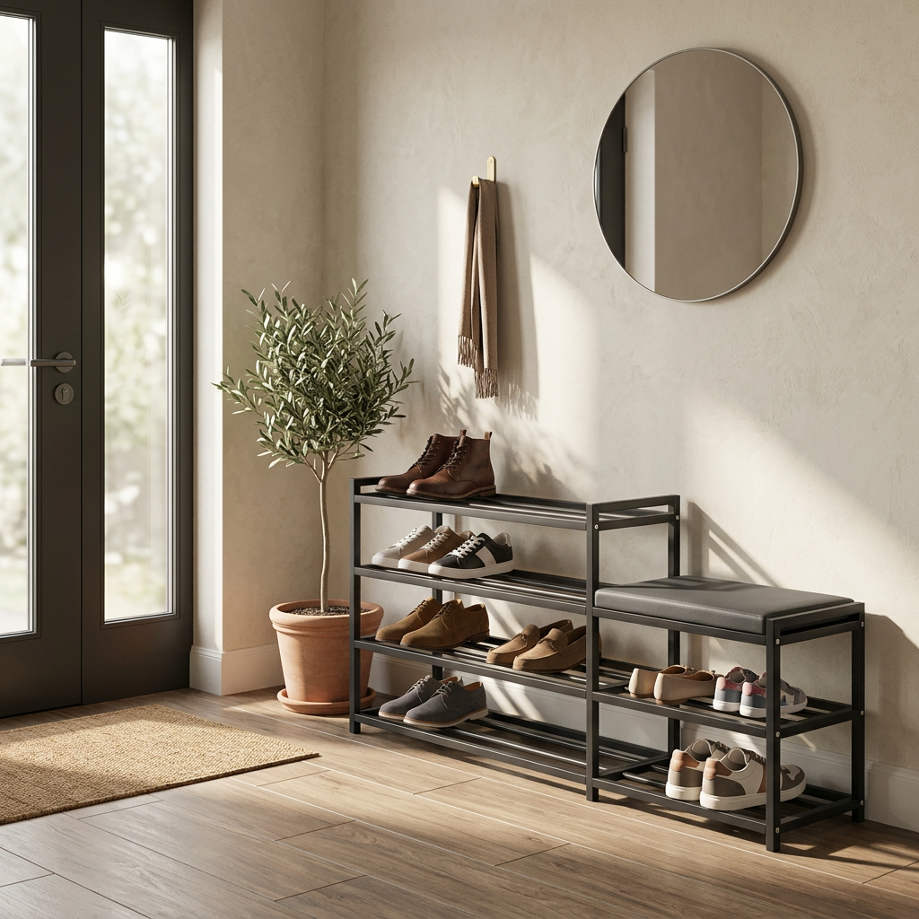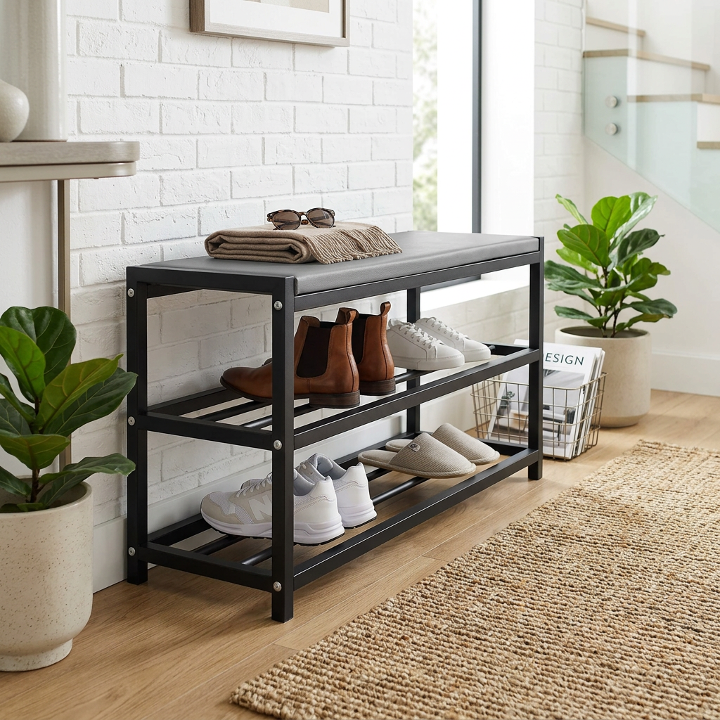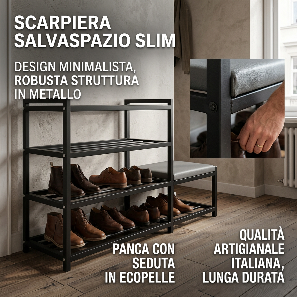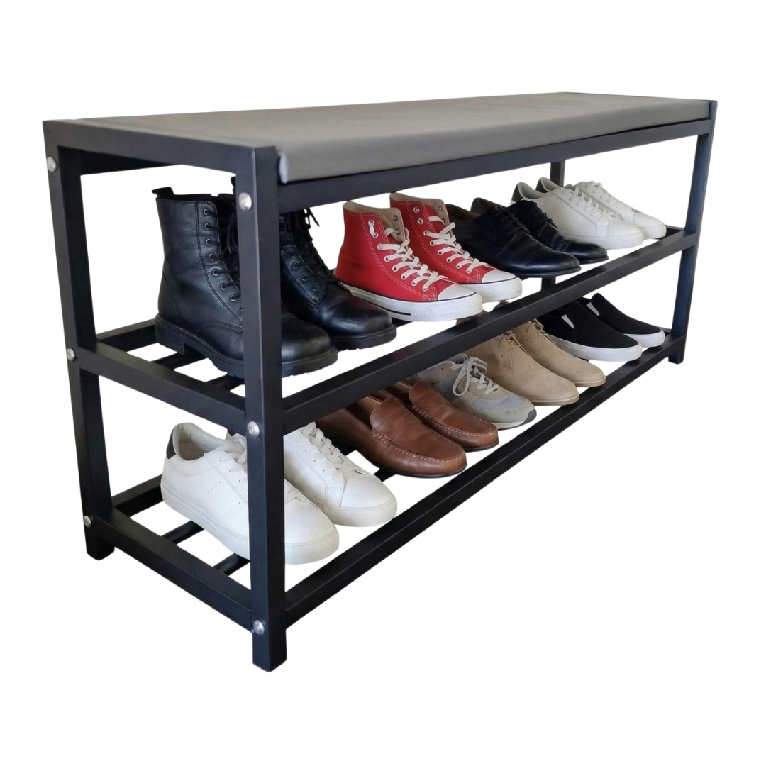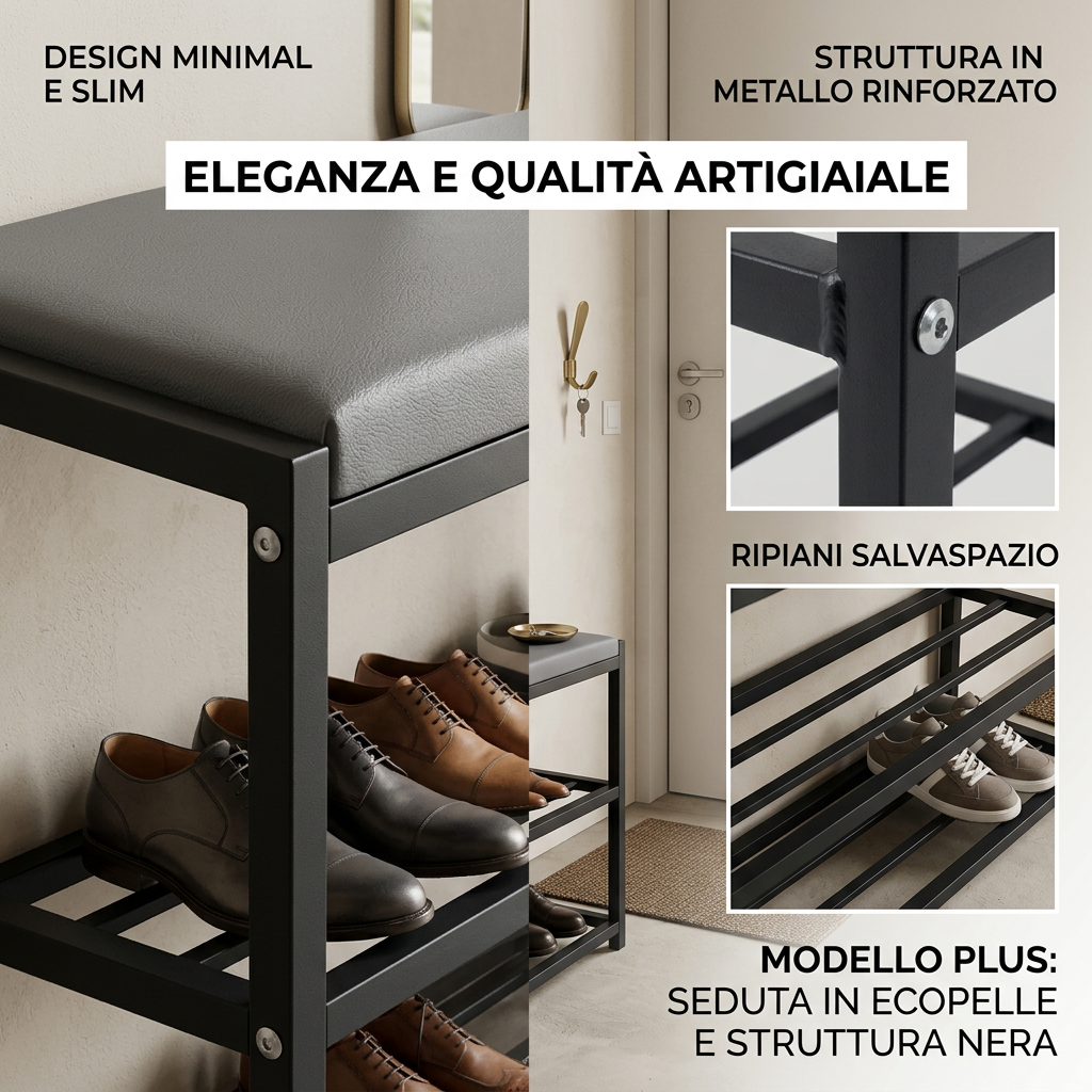 Our slim shoe rack is perfect for optimizing space in any environment, allowing you to store a large number of shoes without taking up too much space. Ideal for entryway use, it keeps your shoes organized and easily accessible, enhancing the aesthetics of your home. Made of sturdy black metal, this shoe rack is durable and stable, with an elegant design that blends seamlessly into any decor.
