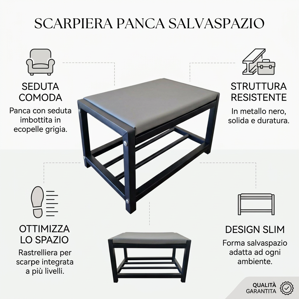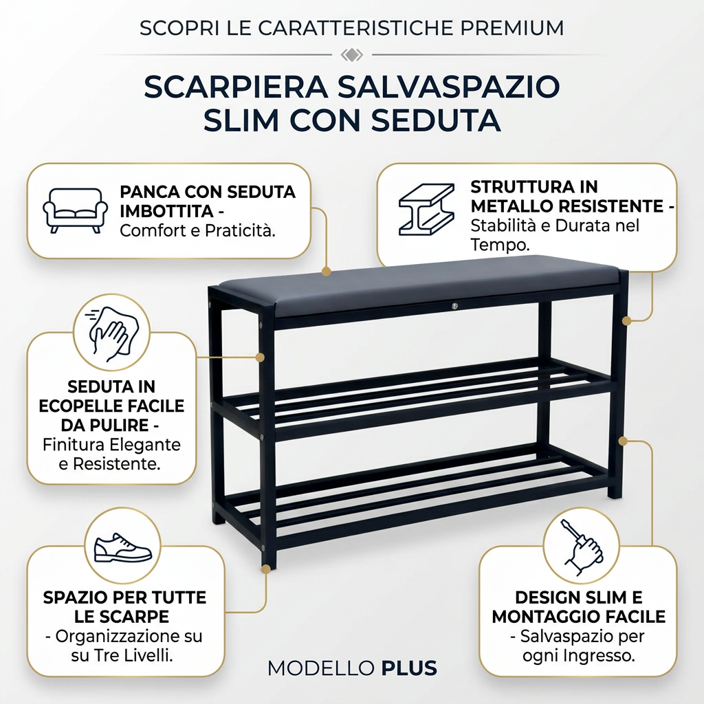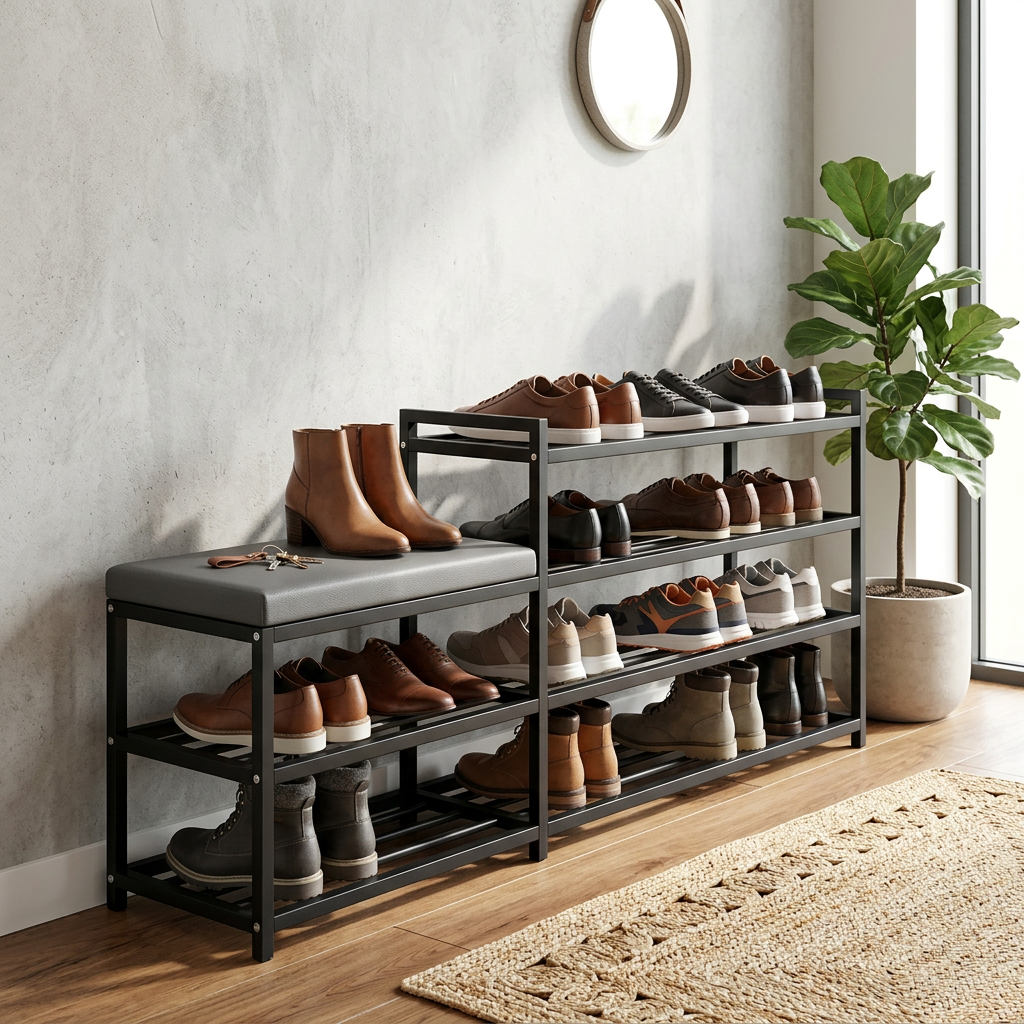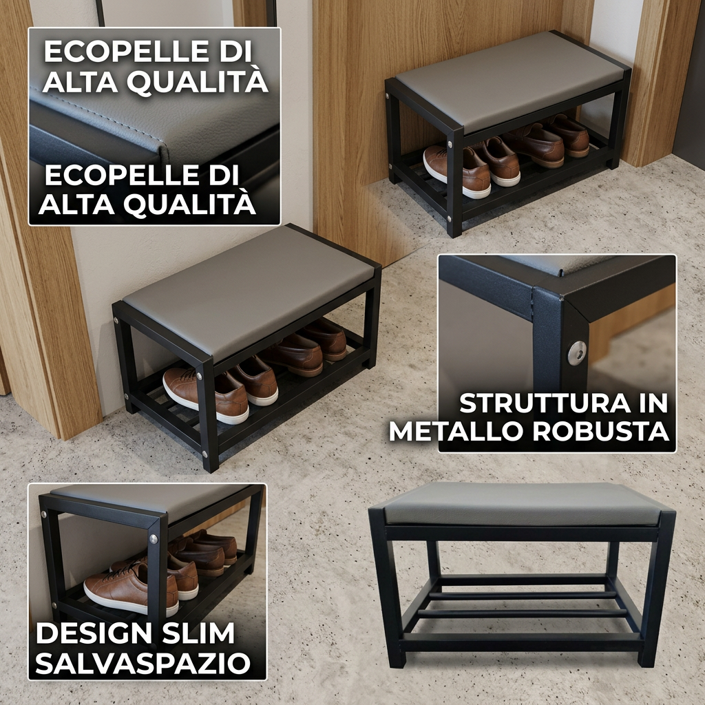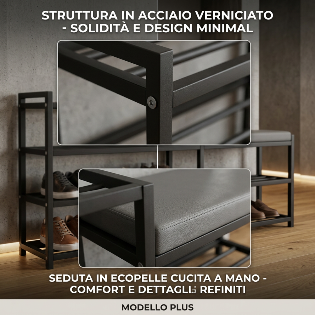 Our slim shoe rack is perfect for optimizing space in any environment, allowing you to store a large number of shoes without taking up too much space. Ideal for entryway use, it keeps your shoes organized and easily accessible, enhancing the aesthetics of your home. Made of sturdy black metal, this shoe rack is durable and stable, with an elegant design that blends seamlessly into any decor.
