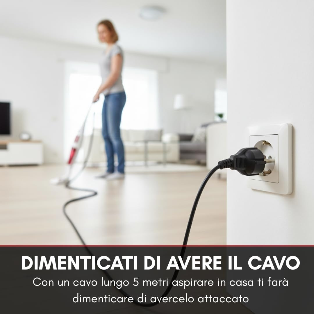 Massima libertà di movimento: la spazzola combinata con rotazione a 360° e il cavo da 5 metri con avvolgicavo integrato facilitano la pulizia di angoli, mobili e grandi ambienti senza interruzioni.