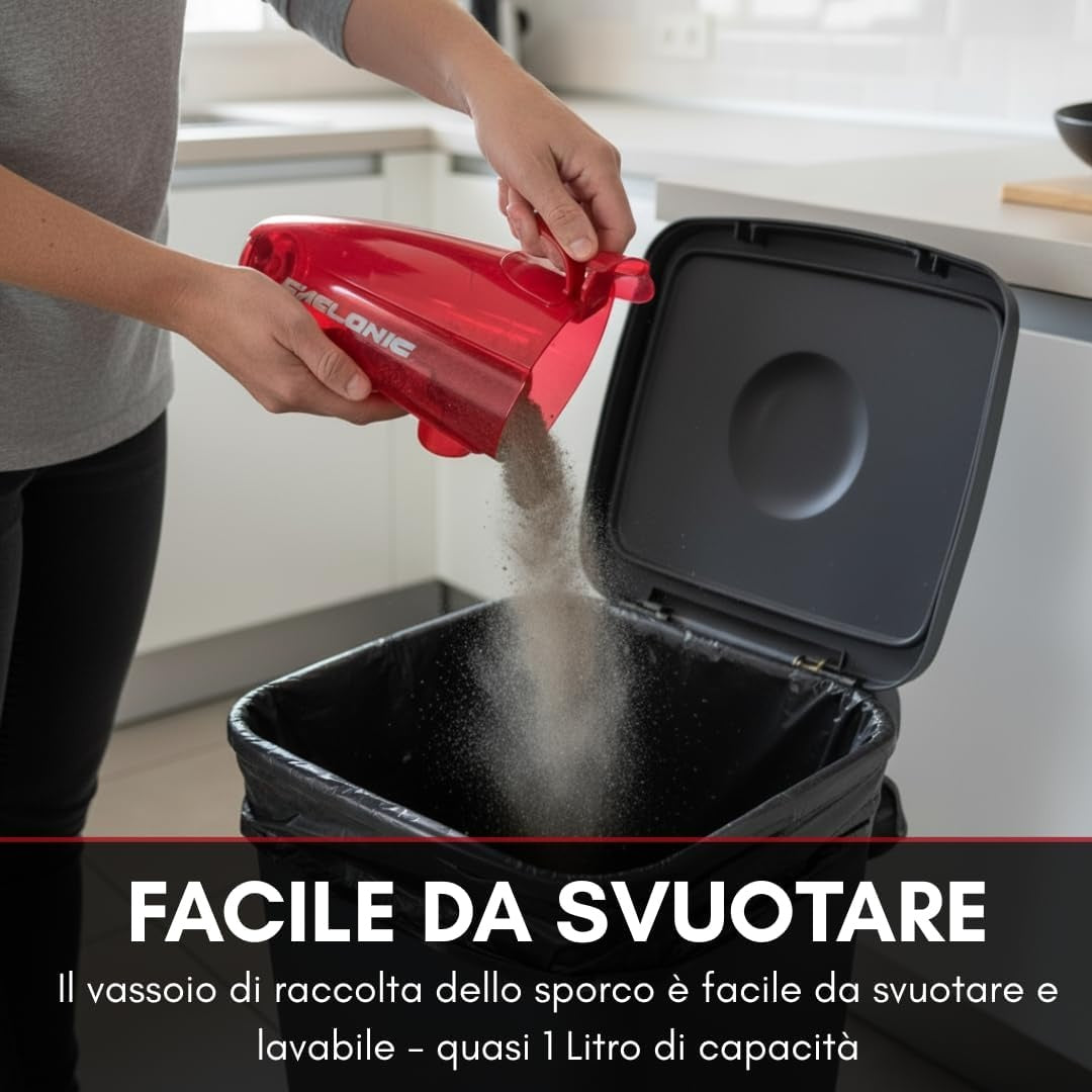 Gestione dello sporco semplice e igienica: il serbatoio trasparente da 0,8 L senza sacco permette uno svuotamento rapido, senza costi aggiuntivi e con controllo visivo immediato del livello di riempimento.