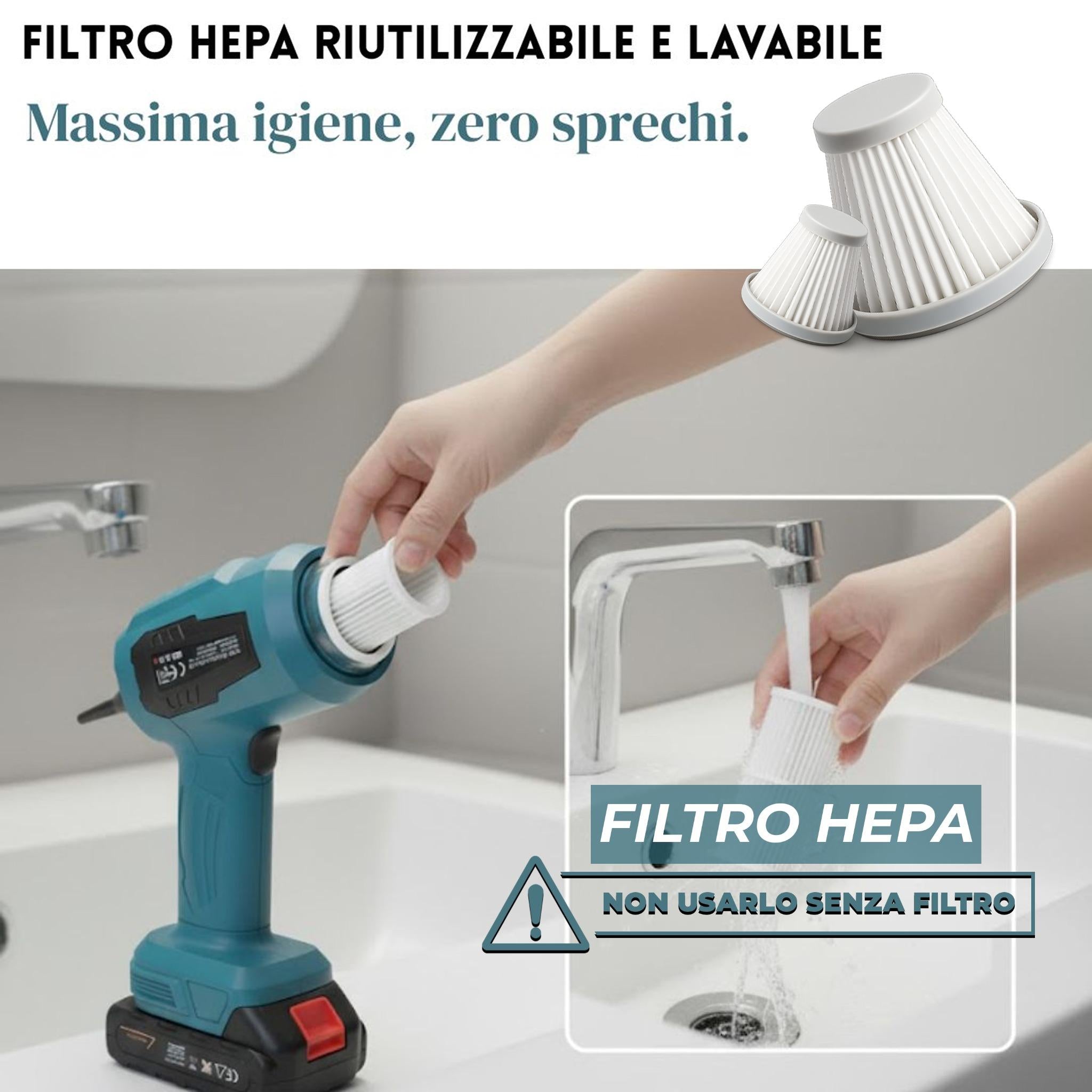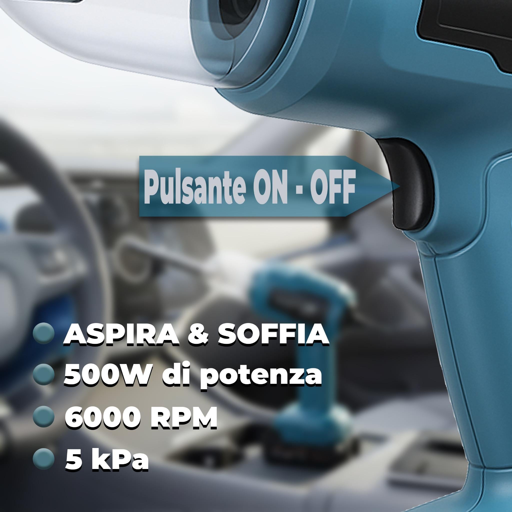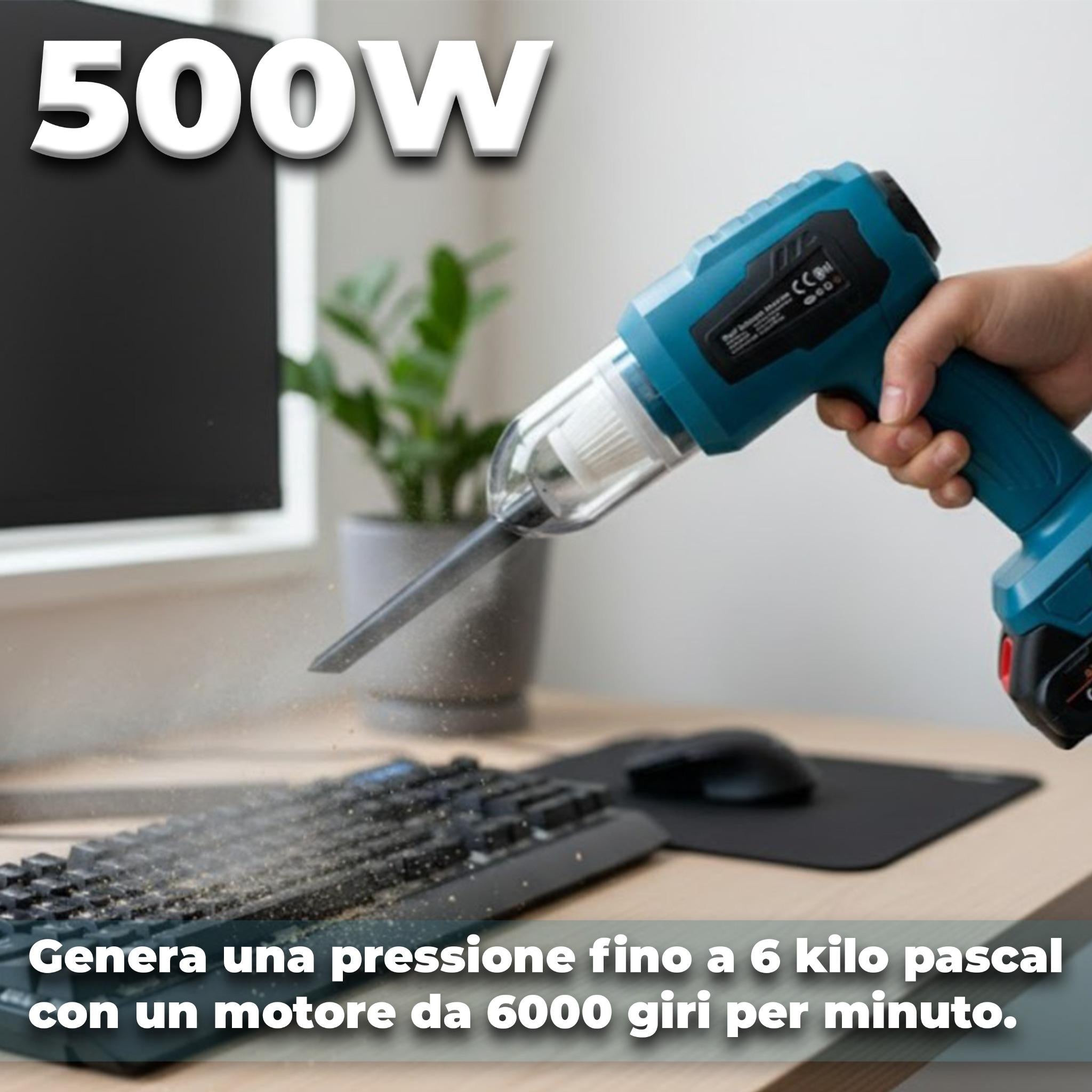 Prestazioni elevate grazie al motore da 500W che assicura una pulizia profonda aspirando polvere, briciole e peli in pochi secondi, ideale per auto, uffici e casa.