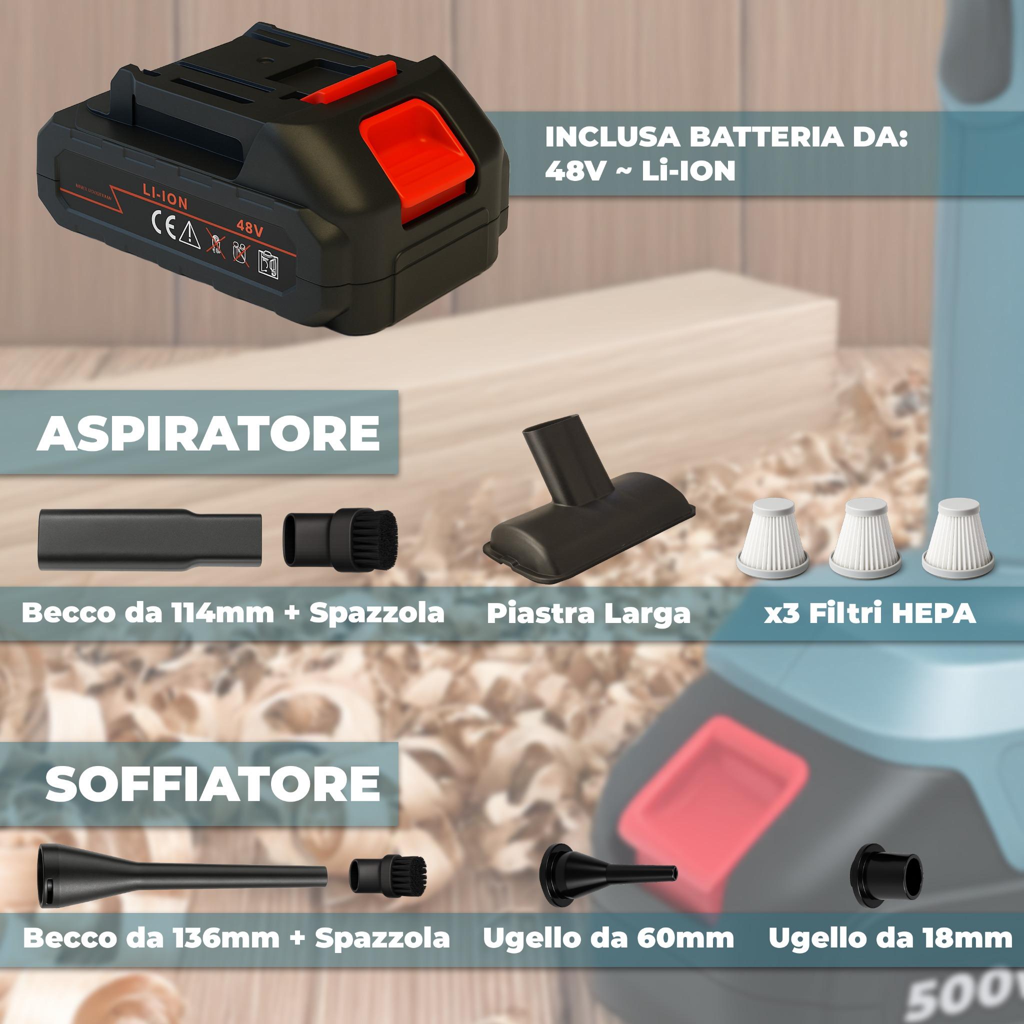 Soffiatore Aspirapolvere 2 in 1 a Batteria 500W con 7 Accessori