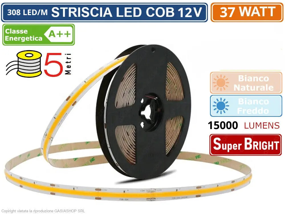 Striscia LED COB 308L/M 37W 12V 5M 15000LM Dimmerabile Adesiva