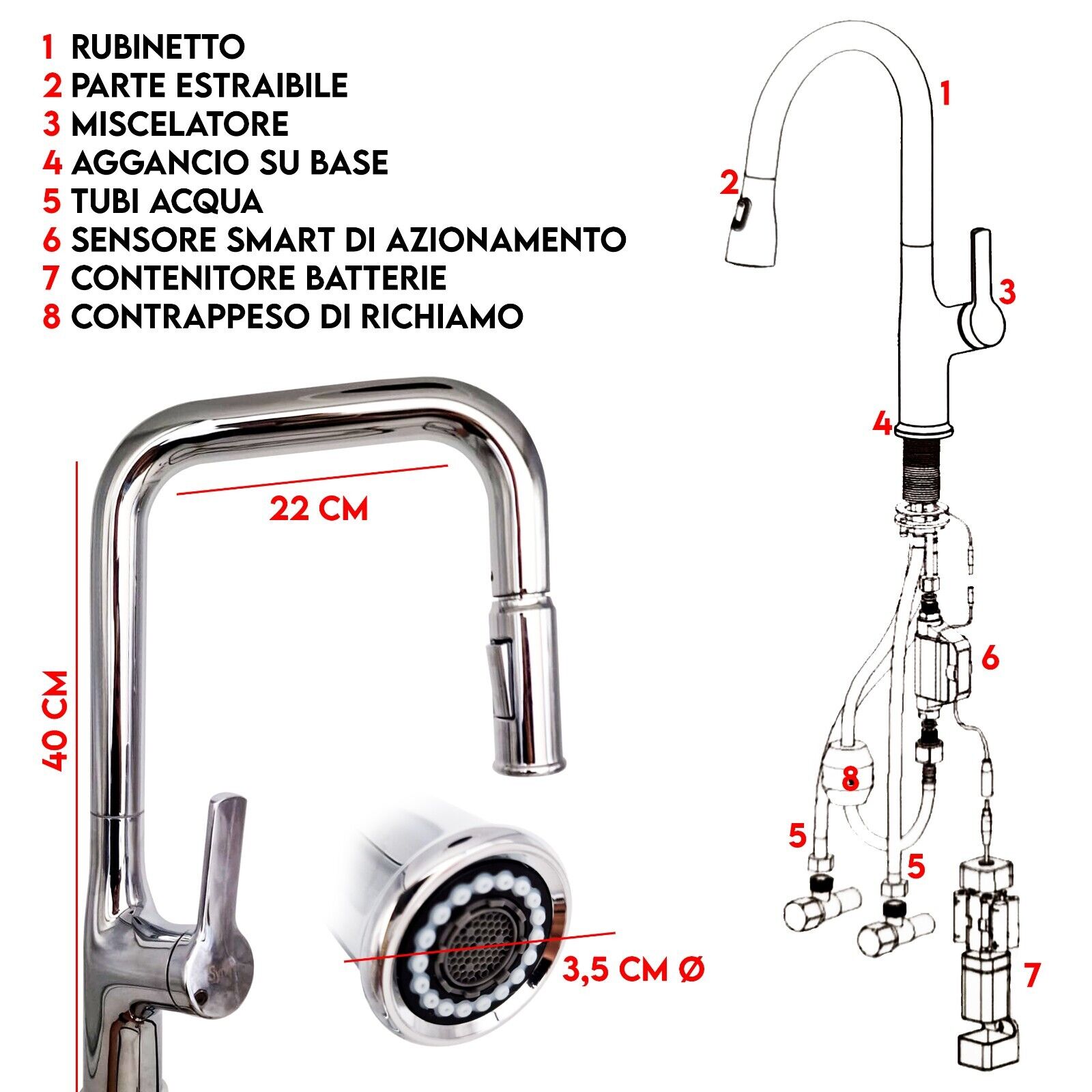 - SENSORE TOUCHLESS: Attiva il flusso d’acqua con un semplice movimento della mano, migliorando l’igiene e riducendo il contatto con il rubinetto.