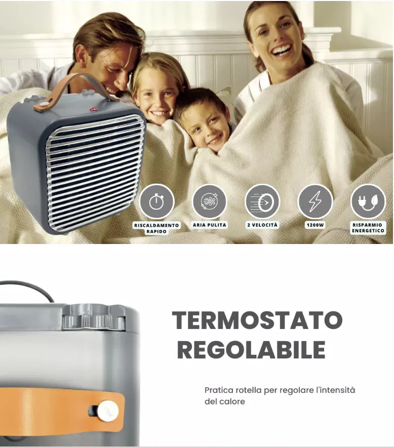 - POTENZA 1200W: Potenza termica ottimale per riscaldare velocemente piccoli spazi, senza compromettere il consumo energetico.