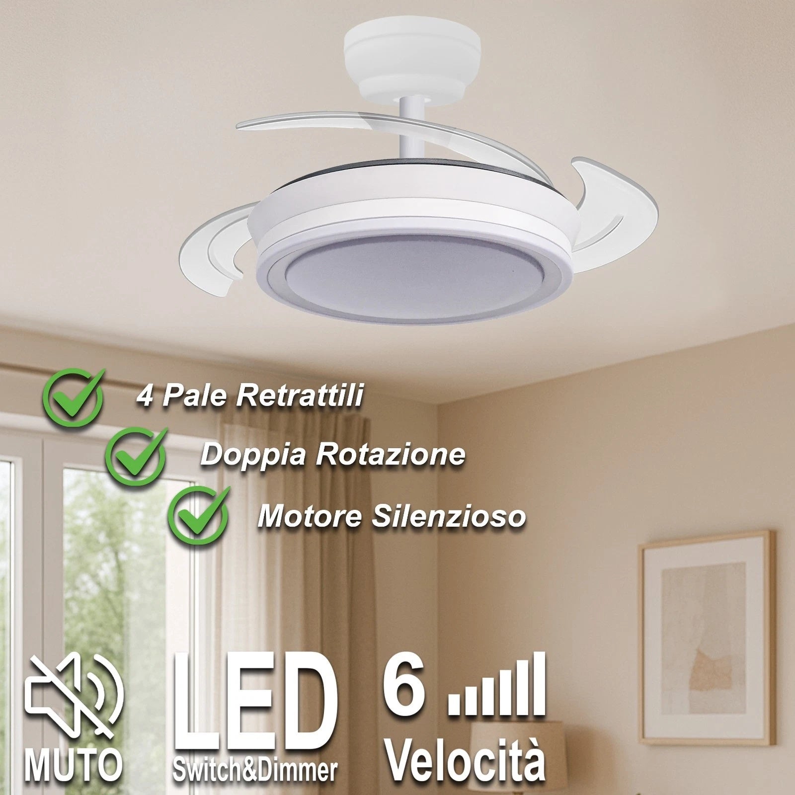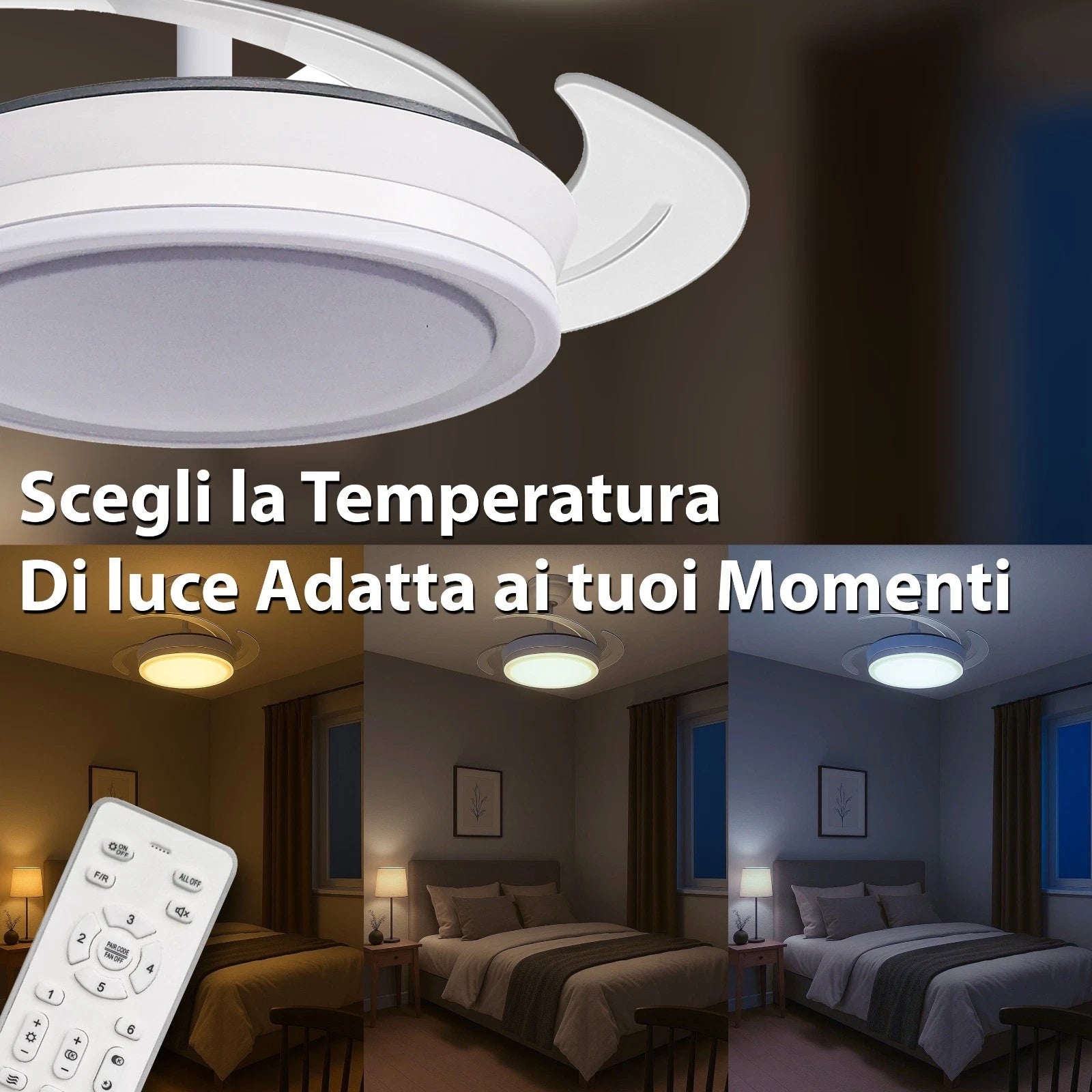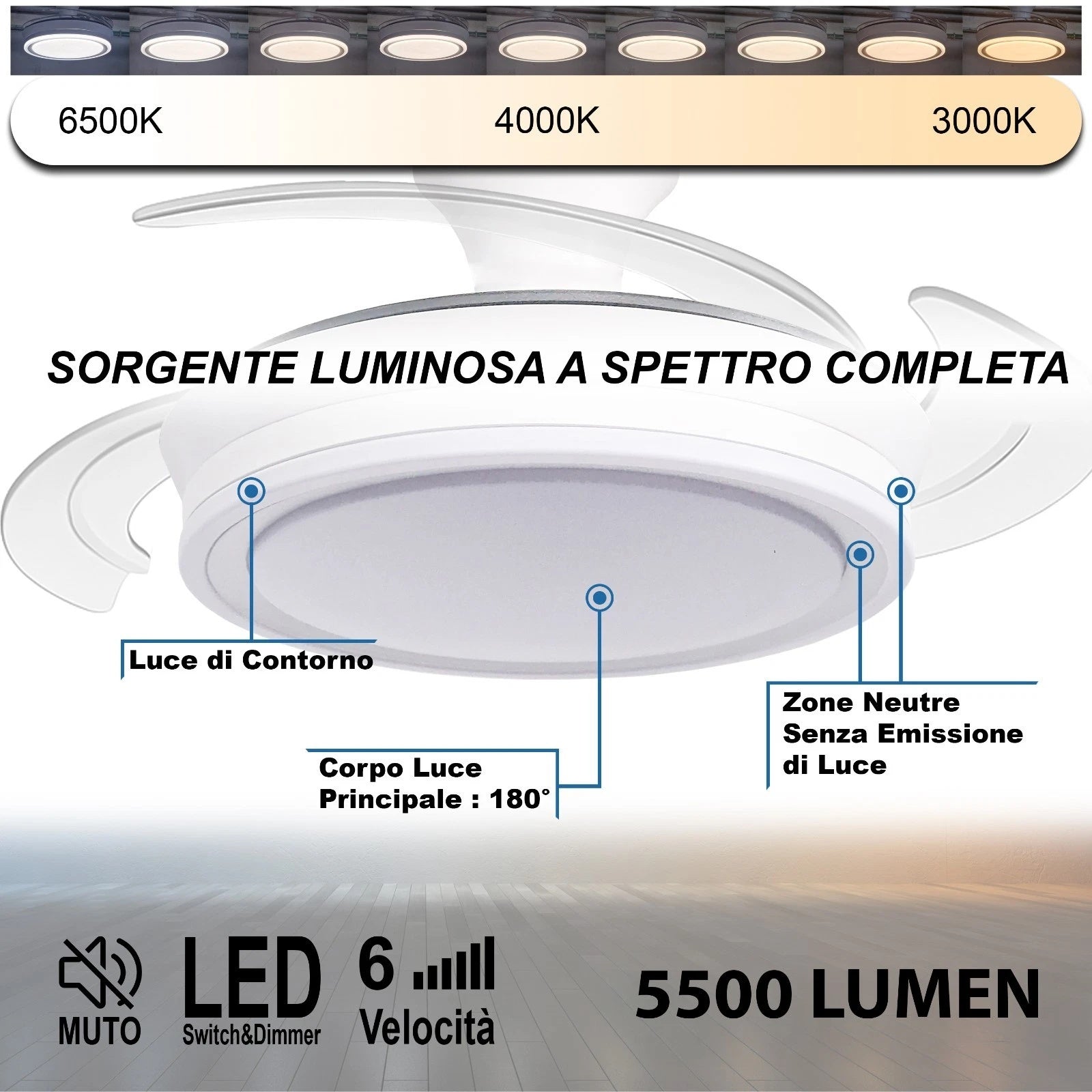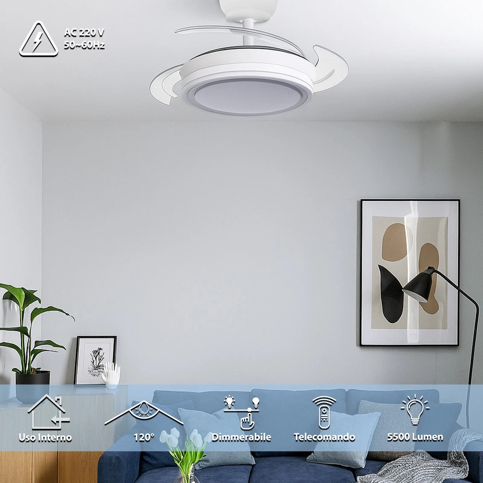 Ventilatore Soffitto LED Dimmerabile 55W con Pale Retrattili e Telecomando