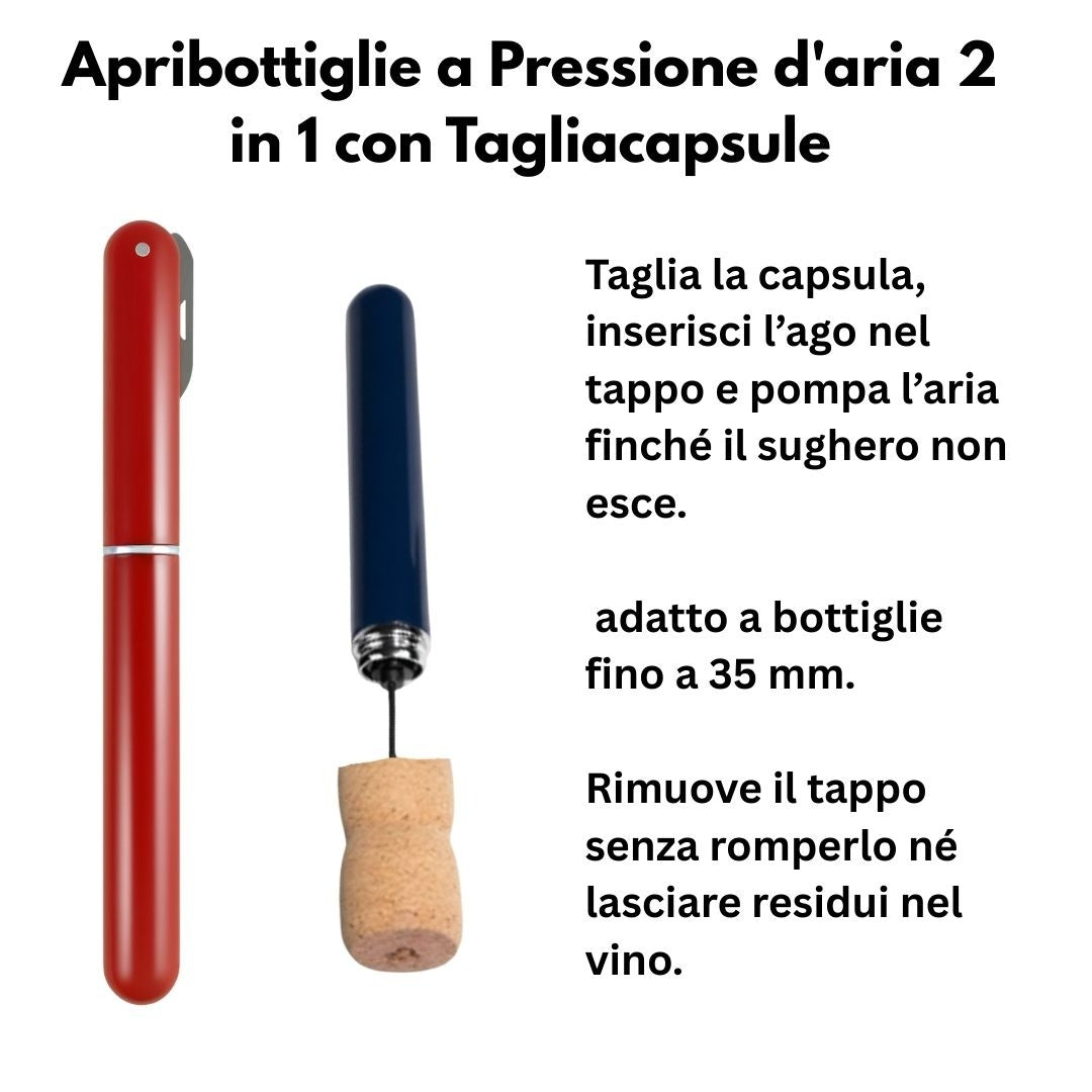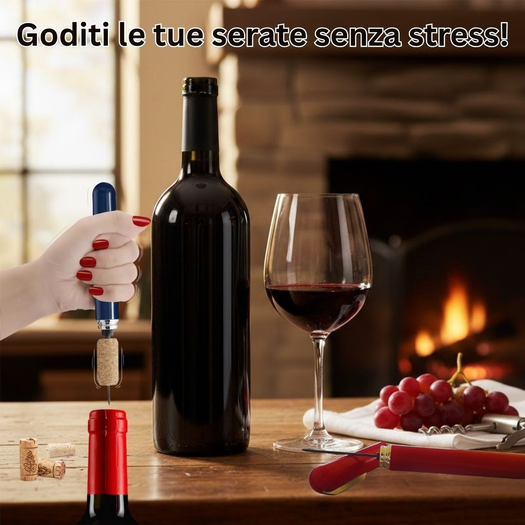 Apertura senza sforzo grazie al sistema ad aria che spinge fuori il tappo senza torsioni, ideale per chi desidera rapidità e precisione in pochi secondi.
